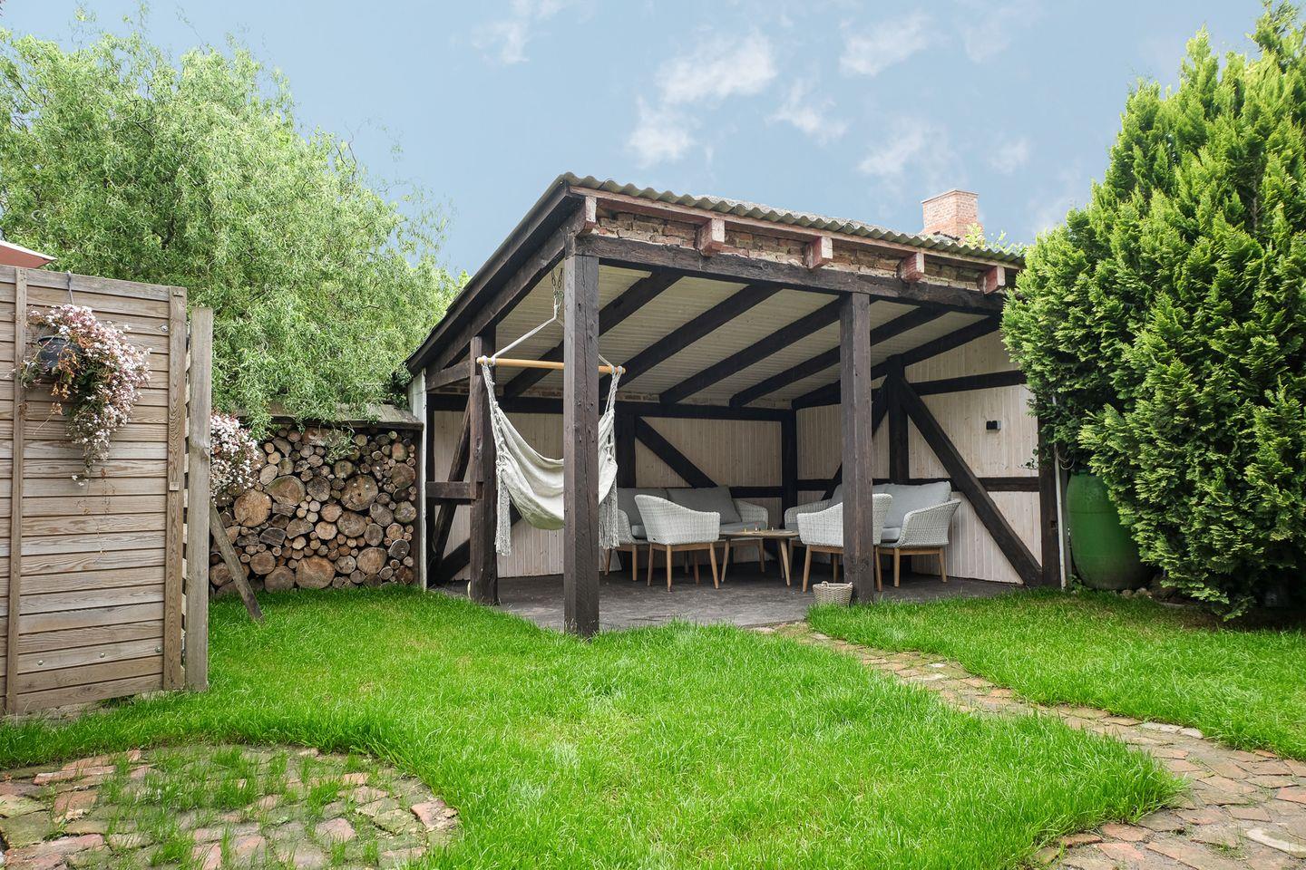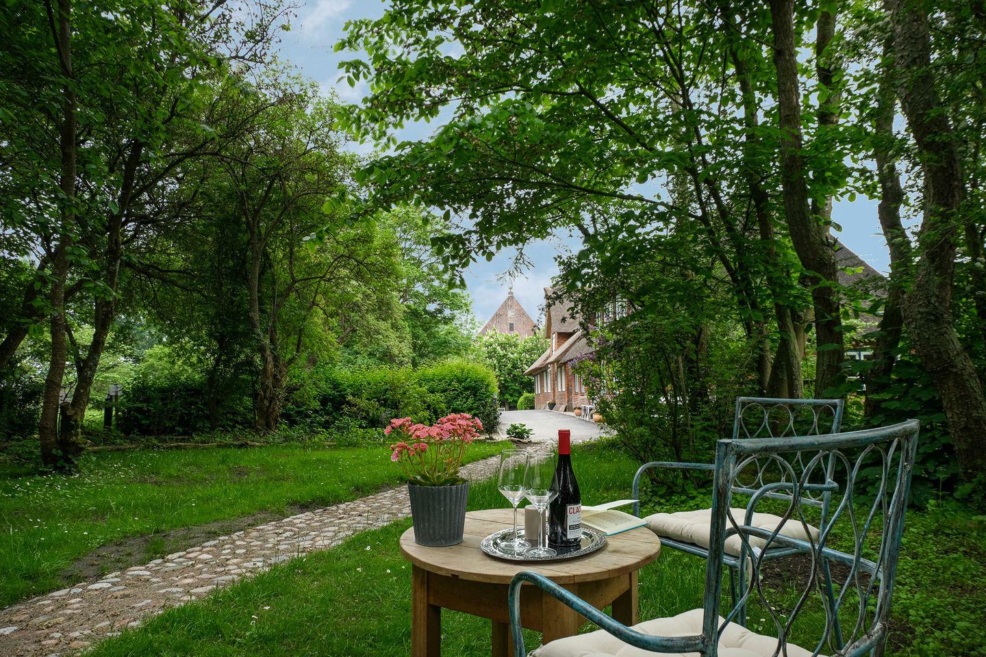 Hinter dem Haus haben Sie einen geschützten Terrassenbereich. Neben Ihrer Unterkunft steht Ihnen ein romantischer Garten mit hohem Baumbestand - ebenfalls mit Sitzbereich - zur freien Verfügung.