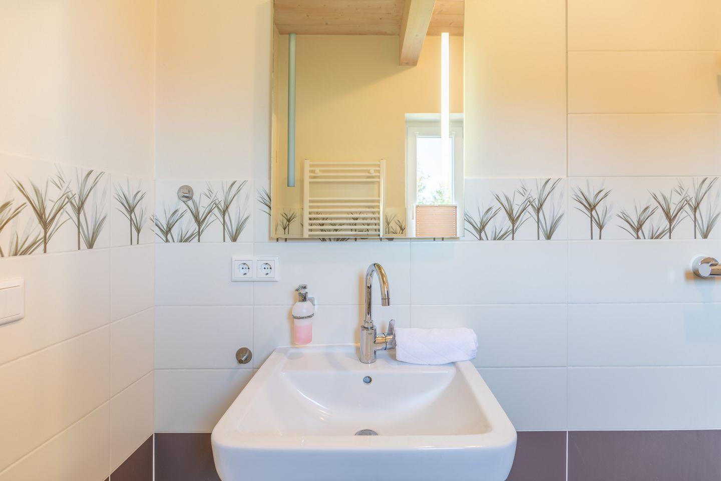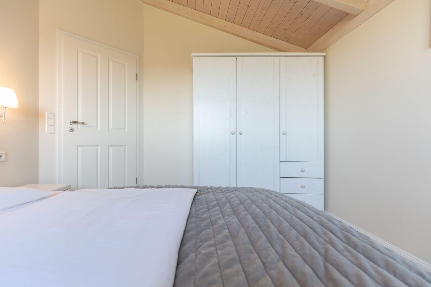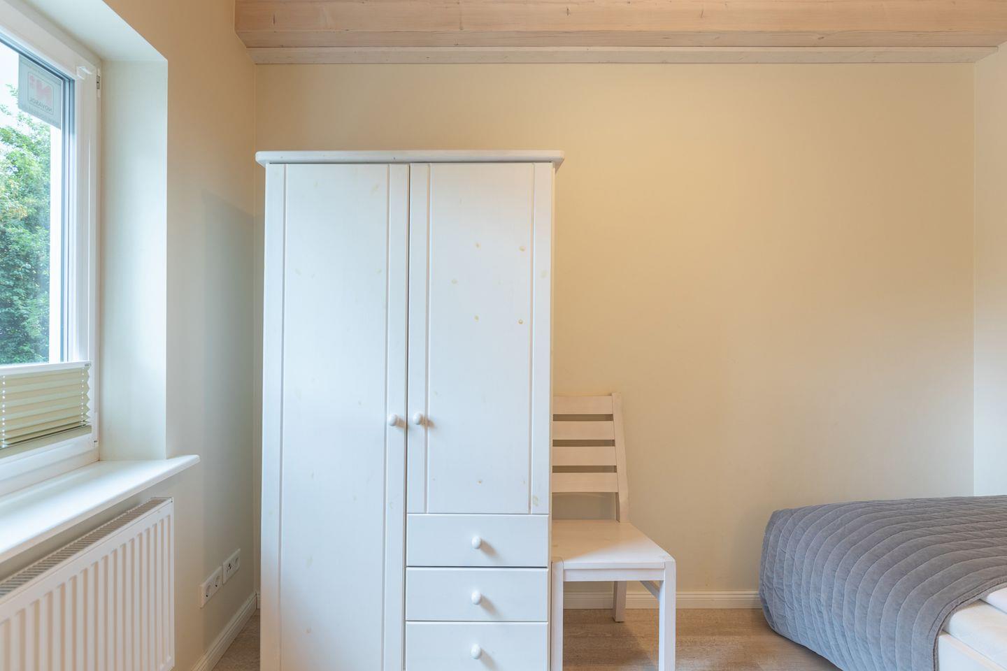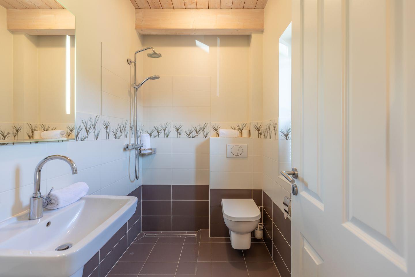 Eines der Schlafzimmer befindet sich im Erdgeschoss und ist mit einem komfortablen 1,20 m breiten Bett ausgestattet. Ebenso befindet sich im Erdgeschoss ein Badezimmer mit einer ebenerdigen Dusche, sodass auch gehbeeinträchtigte Gäste ein komfortabler und stufenfreier Zugang ermöglicht wird.