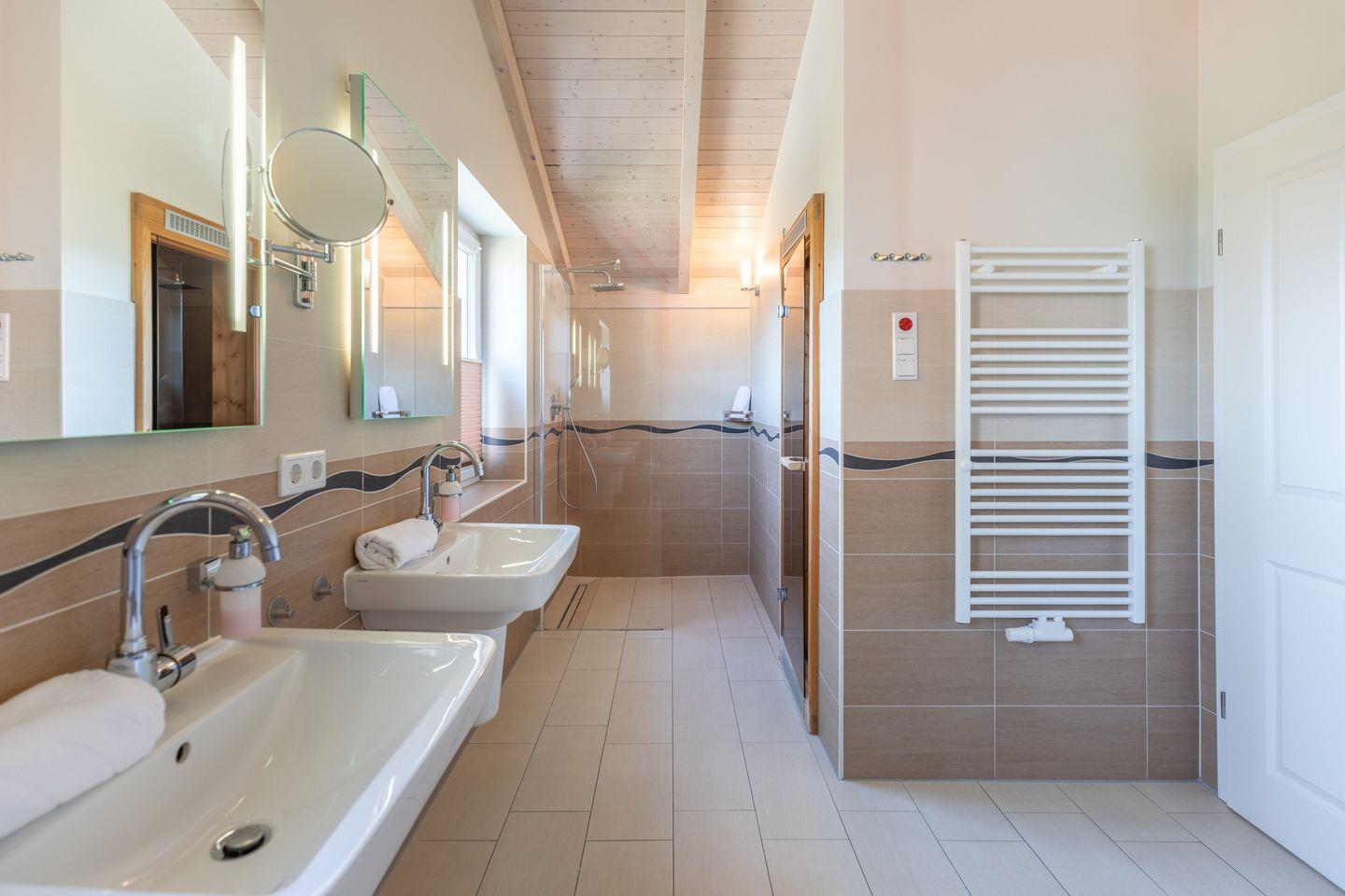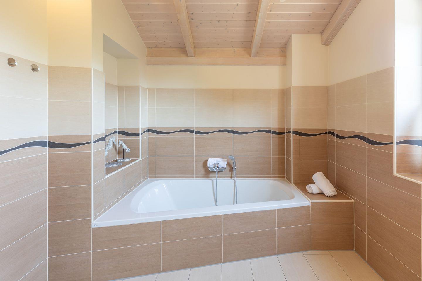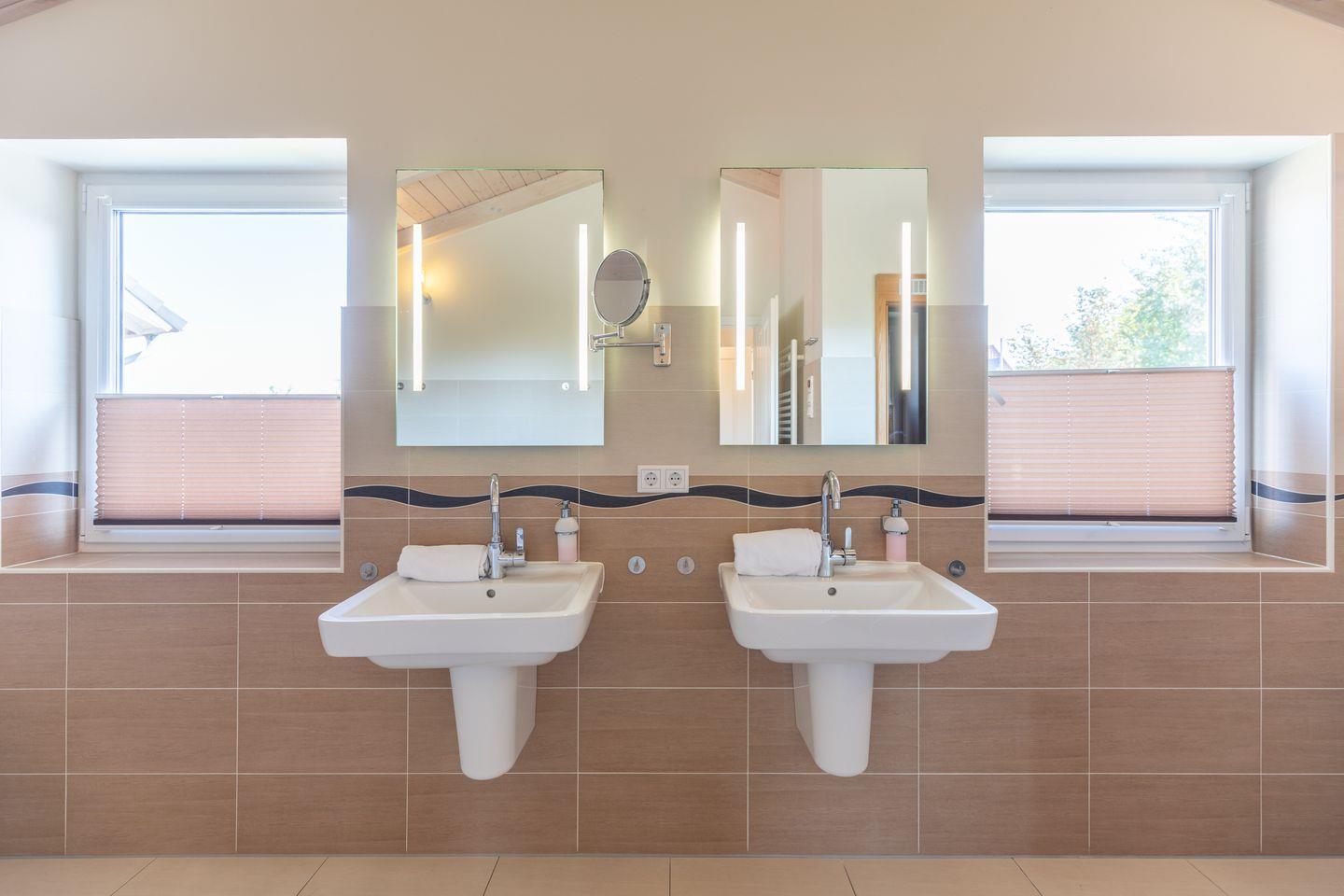 Über eine geschlossene Holztreppe erreichen Sie die erste Etage mit zwei Schlafzimmer mit jeweils einen Komfort-Doppelbett (180 x 200 cm). Das Badezimmer im Obergeschoss lässt keine Wünsche offen: zwei Waschbecken, eine große XXL-Badewanne, eine ebenerdige Dusche und eine schöne Sauna sorgen für Wellness pur.