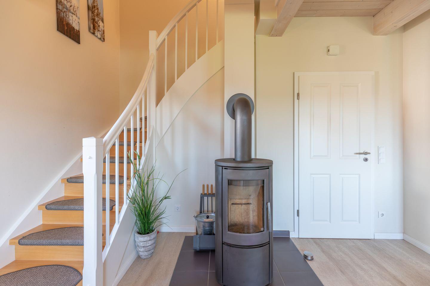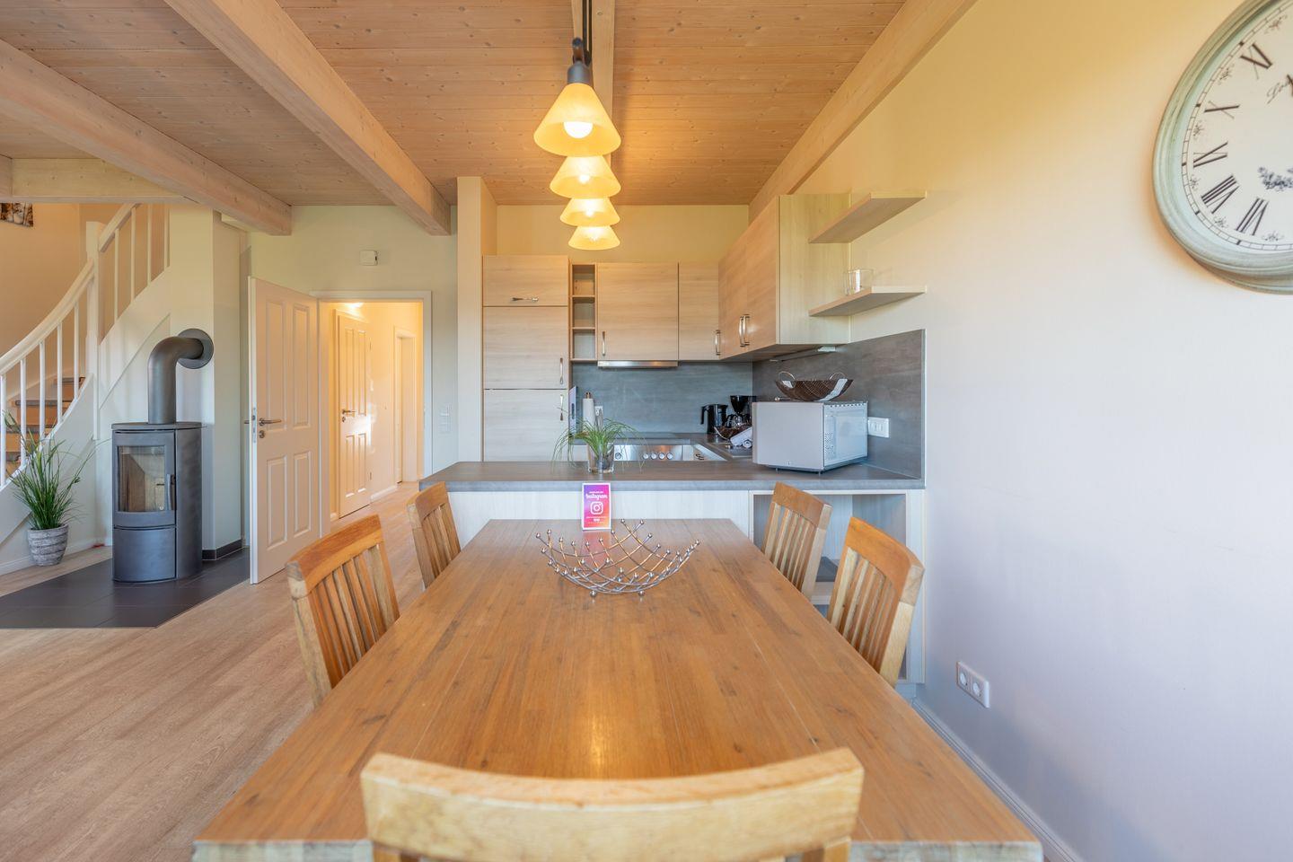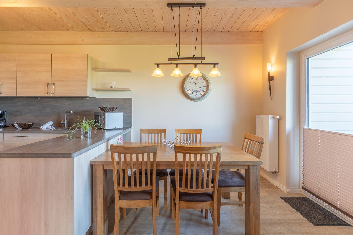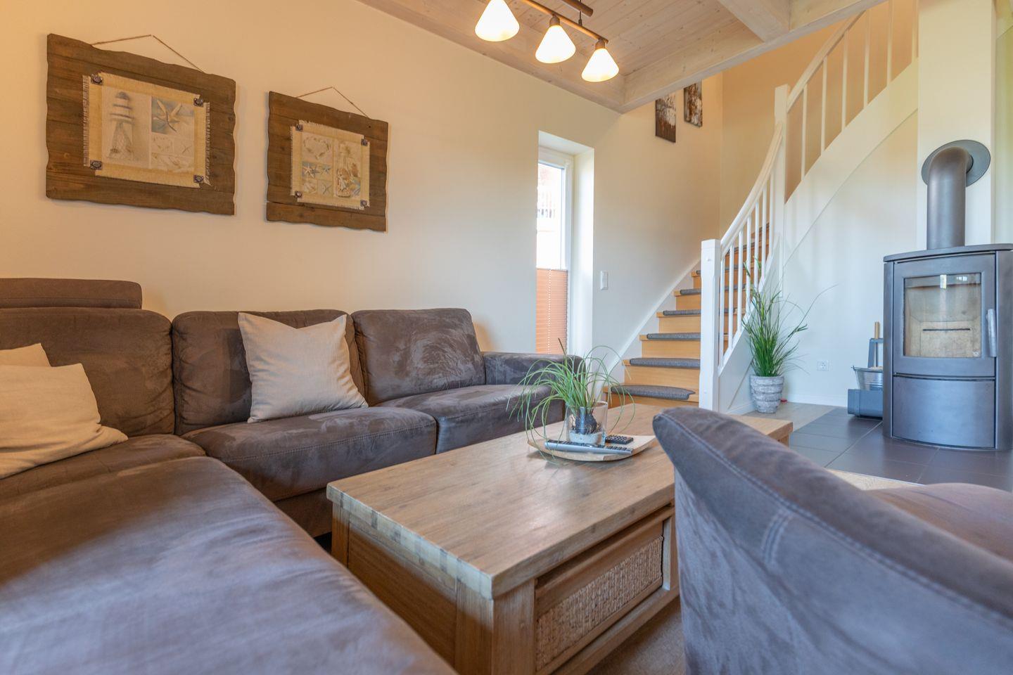 Das ca. 100 qm große Ferienhaus ist modern und exklusiv im skandinavischen Stil eingerichtet. Das gemütliche Wohnzimmer ist mit einem SAT-TV ausgestattet, und der Kaminofen sorgt auch in der kälteren Jahreszeit für behagliche Stunden.