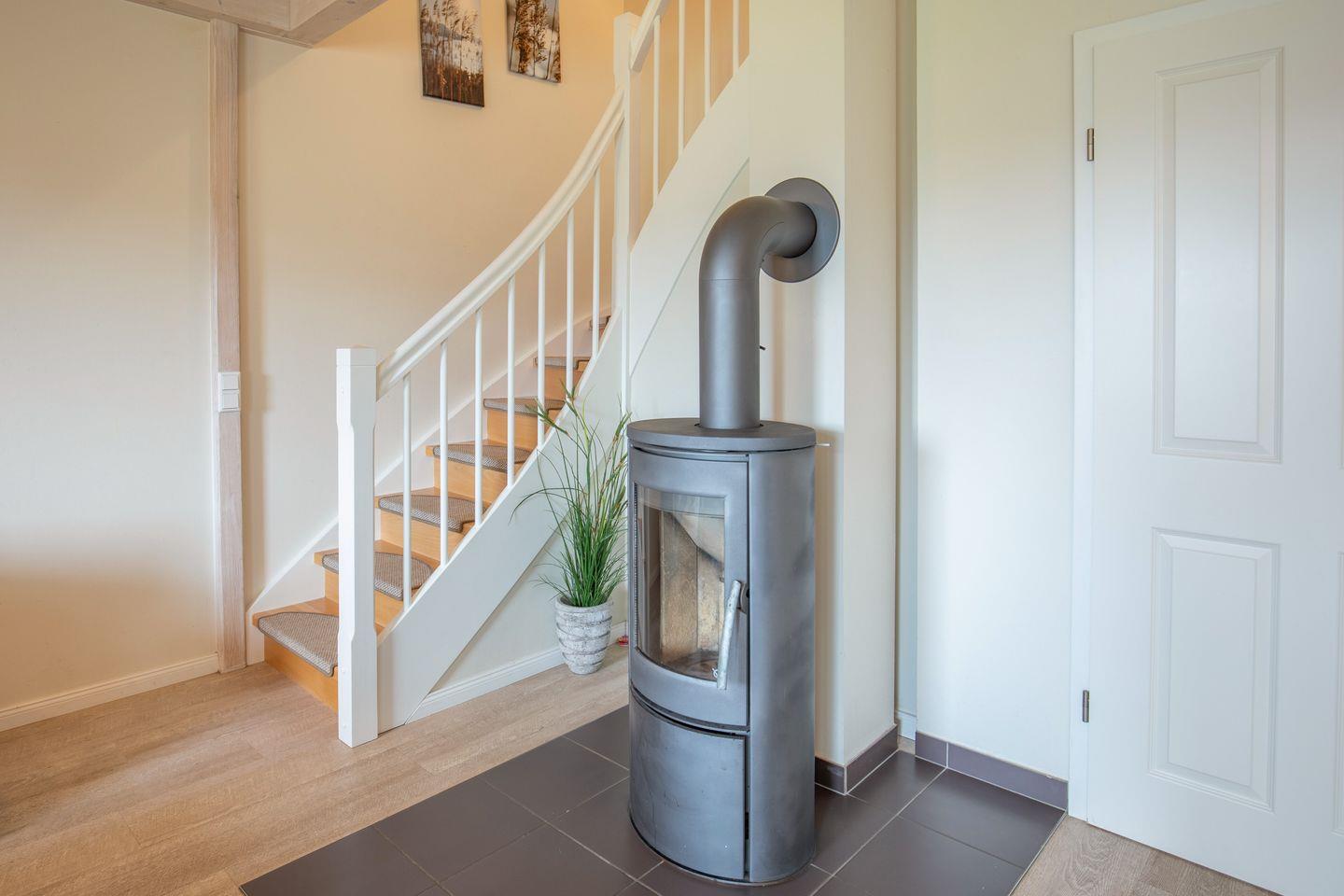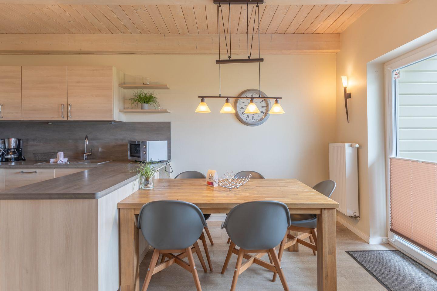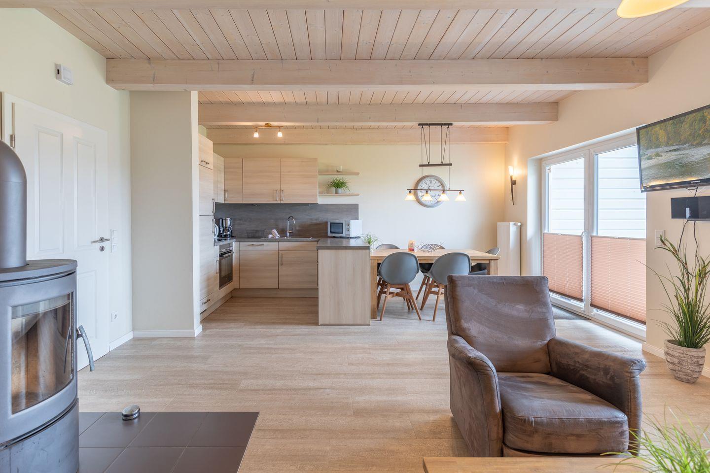 Das ca. 100 qm große Ferienhaus ist modern und exklusiv im skandinavischen Stil eingerichtet. Das gemütliche Wohnzimmer ist mit einem SAT-TV ausgestattet, und der Kaminofen sorgt auch in der kälteren Jahreszeit für behagliche Stunden.
