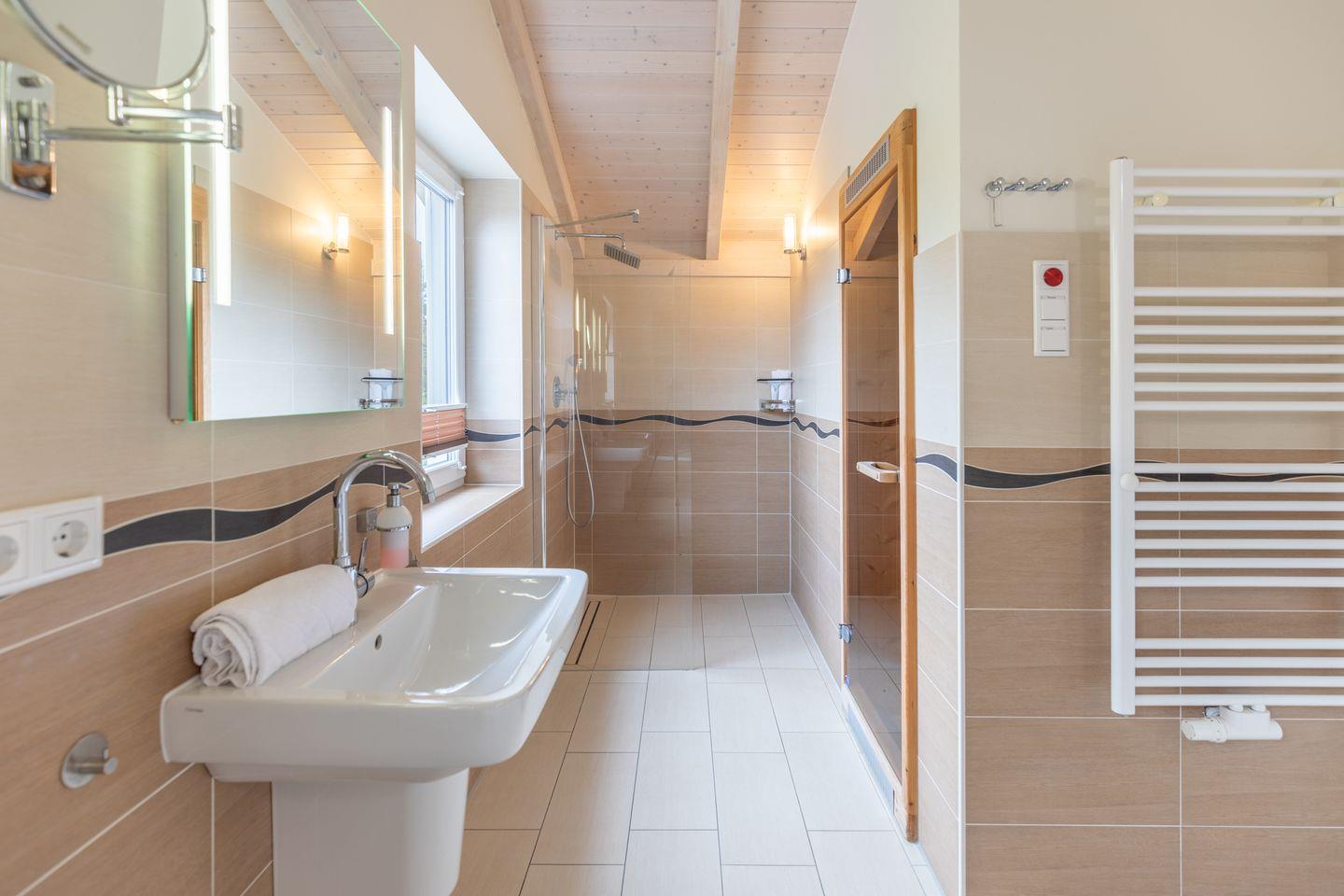 Über eine geschlossene Holztreppe erreichen Sie die erste Etage mit zwei Schlafzimmer mit jeweils einen Komfort-Doppelbett (180 x 200 cm). Das Badezimmer im Obergeschoss lässt keine Wünsche offen: zwei Waschbecken, eine große XXL-Badewanne, eine ebenerdige Dusche und eine schöne Sauna sorgen für Wellness pur.