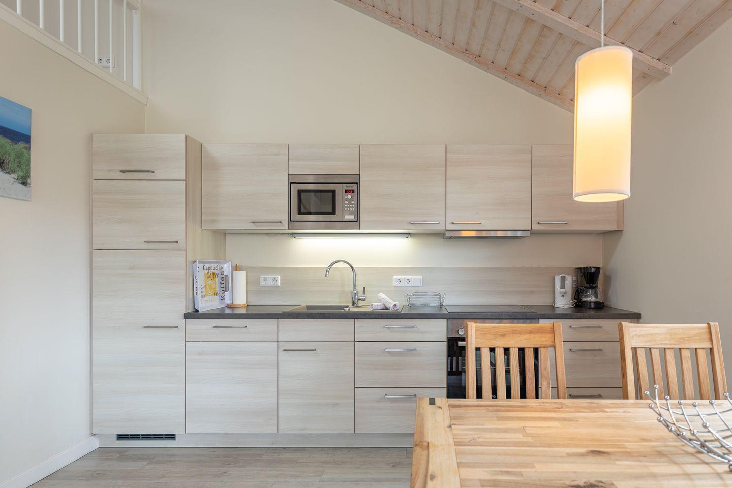 Die offene Küche bietet eine hochwertige und umfangreiche Ausstattung, die das Herz eines jeden Hobbykochs höherschlagen lässt. Sie verfügt über ein Cerankochfeld mit vier Platten, einen Backofen, einen Kühlschrank mit ***Gefrierfach, eine Mikrowelle, einen Geschirrspüler, eine Filterkaffeemaschine sowie viele weitere praktische Küchenutensilien. Das moderne Duschbad mit Fußbodenheizung rundet das stilvolle Gesamtbild des Hauses ab.