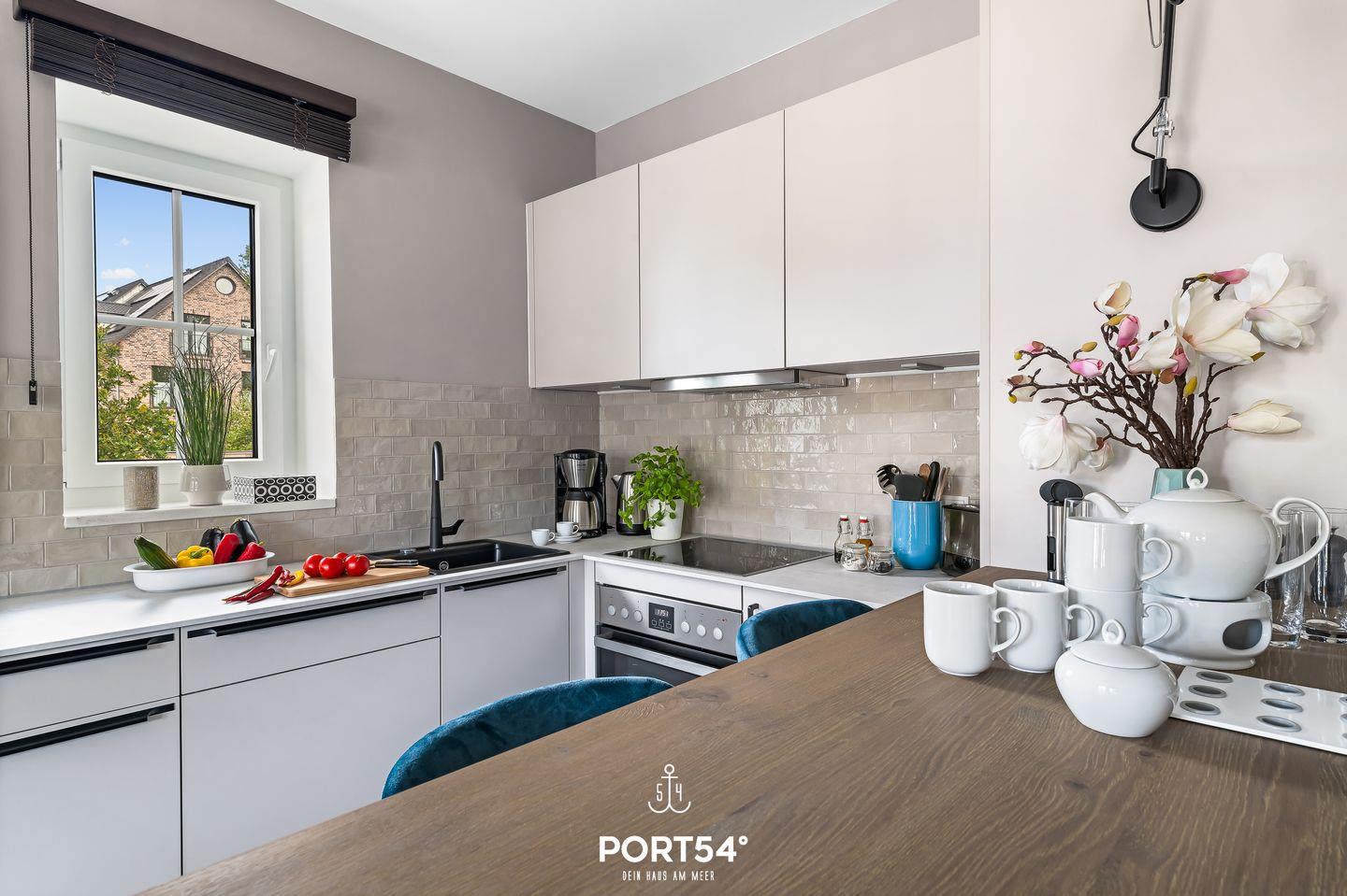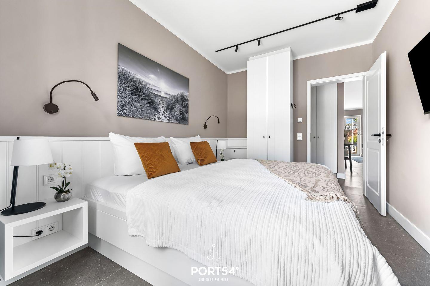 Zur Ausstattung gehören ein separates Schlafzimmer mit komfortablem Doppelbett sowie ein lichtdurchfluteter Wohnbereich mit offen gestalteter, hochwertig ausgestatteter Küche. Hier lässt sich der Urlaubstag entspannt ausklingen. Das moderne Badezimmer mit Dusche überzeugt durch klare Formen und ein zeitloses Design.