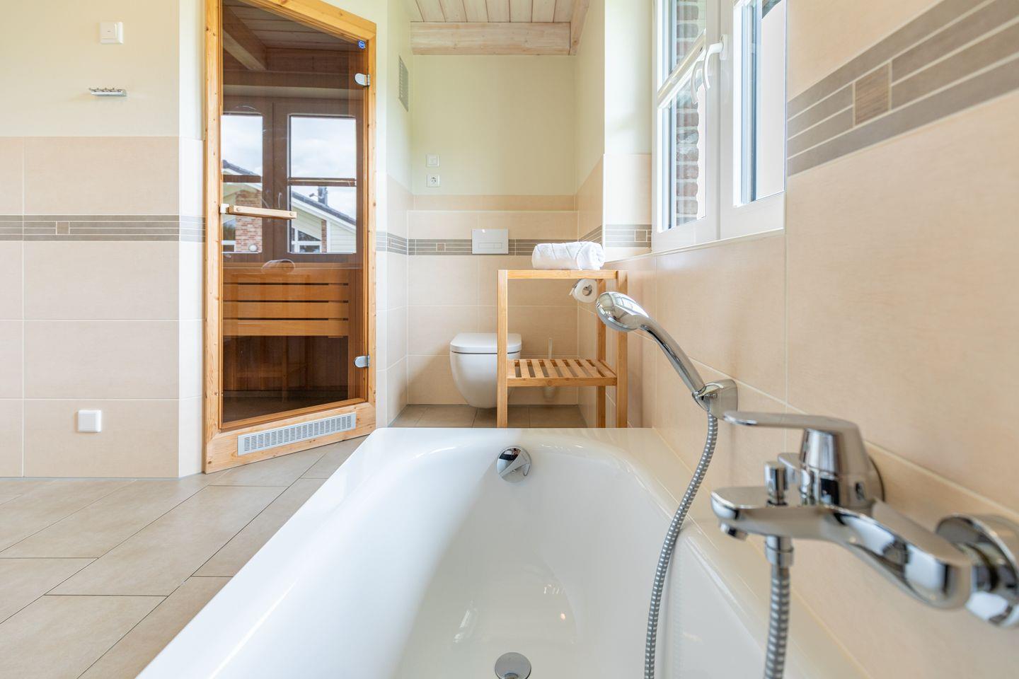 Das gemütliche Wohnzimmer ist mit SAT-TV ausgestattet. Der Kaminofen sorgt auch in der kälteren Jahreszeit für behagliche Stunden. Die offene Küche bietet Ihnen eine exklusive und umfangreiche Ausstattung, die das Herz eines jeden Hobbykochs höher schlagen lässt: Ceranfeld mit 4 Kochplatten, Backofen, Kühlschrank mit ***Gefrierfach, Mikrowelle, Geschirrspüler, Filterkaffeemaschine uvm. Das Badezimmer lässt keine Wünsche offen: zwei Waschbecken, eine große Badewanne, eine ebenerdige Dusche und eine schöne Sauna geben Ihrem Urlaub den richtigen Rahmen. Das Ferienhaus verfügt über ein zusätzliches WC. Auf der überdachten Terrasse können Sie auf bequemen Gartenstühlen und -liegen die Sonne genießen.