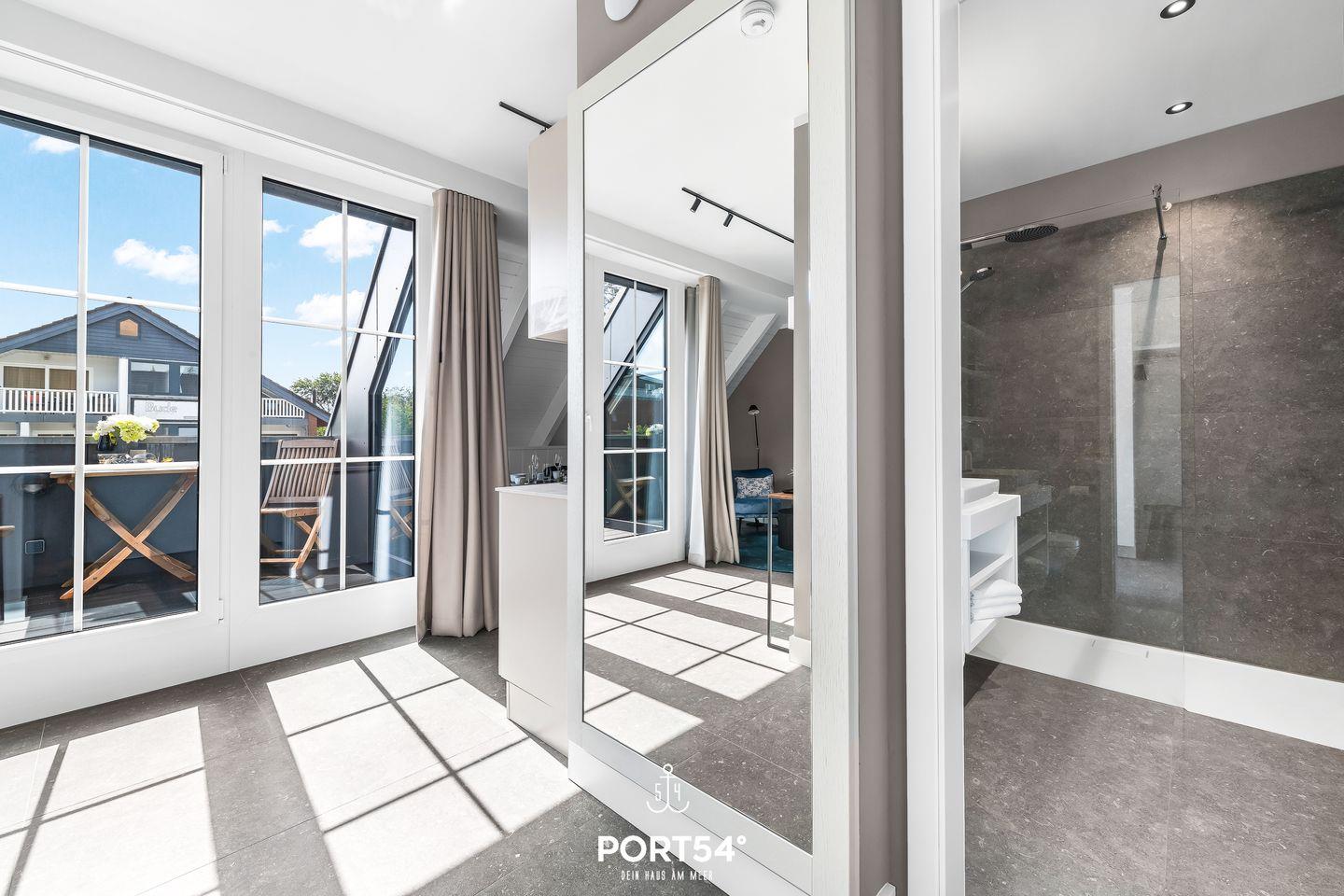 Die modern eingerichtete Ferienwohnung Meerblick verfügt über zwei Zimmer, darunter ein separates Schlafzimmer mit komfortabler Schlafmöglichkeit für zwei Personen. Im modernen Badezimmer steht Ihnen eine bodengleiche Dusche zur Verfügung, ebenso wie ein Haartrockner, Waschbecken, Spiegel und WC. Die gezielt auf Komfort ausgelegte Ausstattung der Unterkunft umfasst selbstverständlich warmes Wasser, einen Staubsauger, Bügelbrett und Bügeleisen.