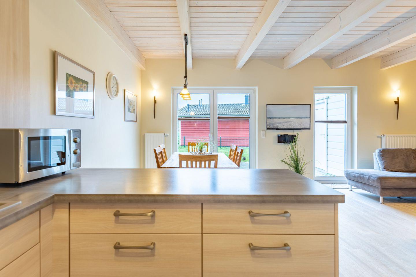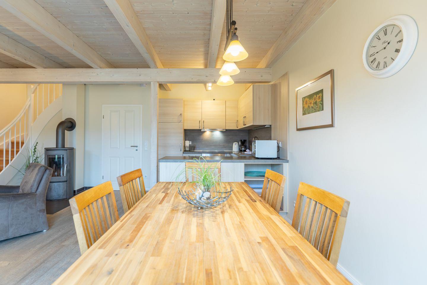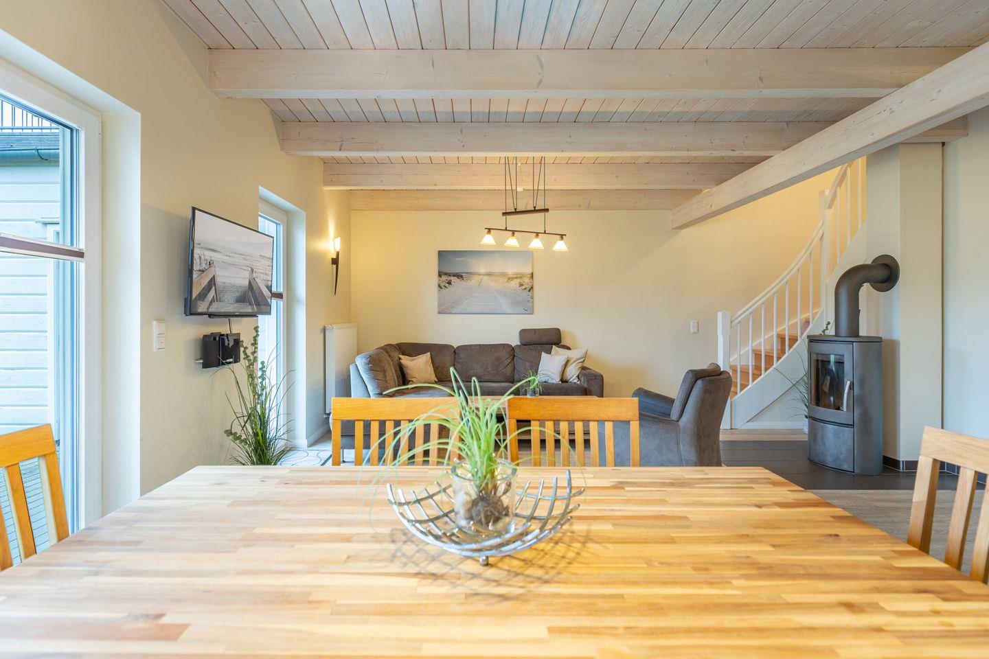 Das 100 qm große Ferienhaus ist modern und exklusiv im skandinavischen Charme eingerichtet. Zwei Schlafzimmer sind mit jeweils einem Komfort-Doppelbett (180 × 200 cm) ausgestattet, ein Schlafzimmer im Erdgeschoss bietet Ihnen ein Eck-Etagenbett, sodass Sie insgesamt für bis zu sechs Personen Platz finden. Das gemütliche Wohnzimmer ist mit SAT-TV und einem Blu-Ray-DVD-Player ausgestattet. Der Kaminofen sorgt in der kälteren Jahreszeit für behagliche Stunden. Die offene Küche bietet Ihnen eine exklusive und umfangreiche Ausstattung, die das Herz eines jeden Hobbykochs höher schlagen lässt: Ceranfeld mit 4 Kochplatten, Backofen, Kühlschrank mit ***Gefrierfach, Mikrowelle, Geschirrspüler, Filterkaffeemaschine, Toaster und Wasserkocher. Das Badezimmer im Obergeschoss lässt keine Wünsche offen: Zwei Waschbecken, eine große Badewanne, eine ebenerdige Dusche und eine schöne Sauna geben Ihrem Urlaub den richtigen Rahmen. Im Erdgeschoss steht Ihnen zusätzlich noch ein Duschbad zur Verfügung. Auf der Terrasse können Sie auf bequemen Gartenstühlen die Sonne genießen.
