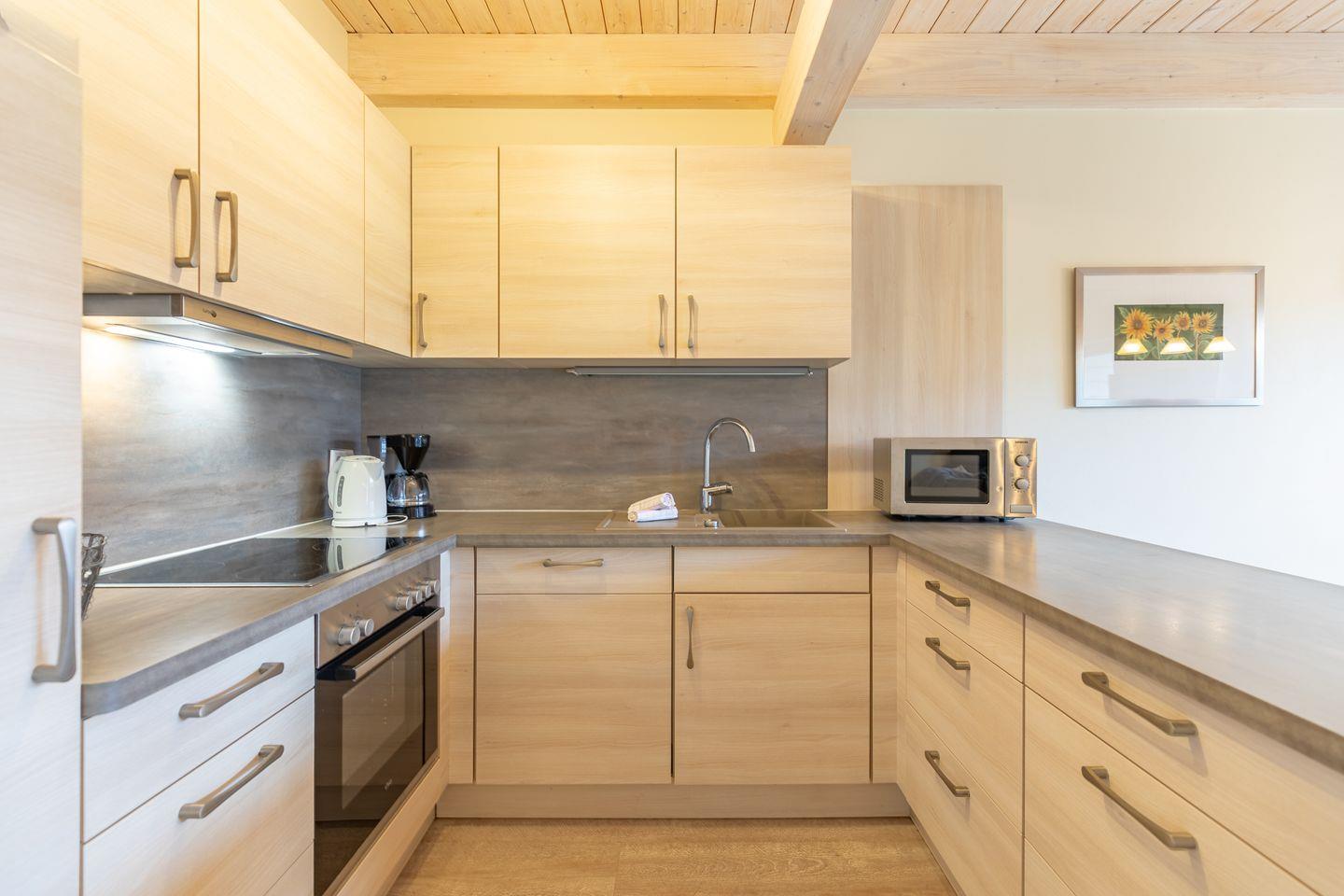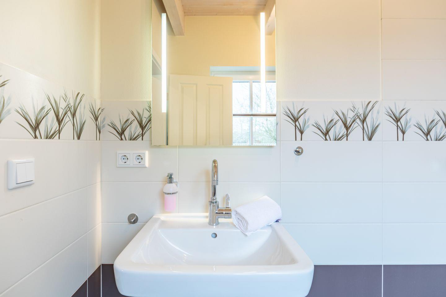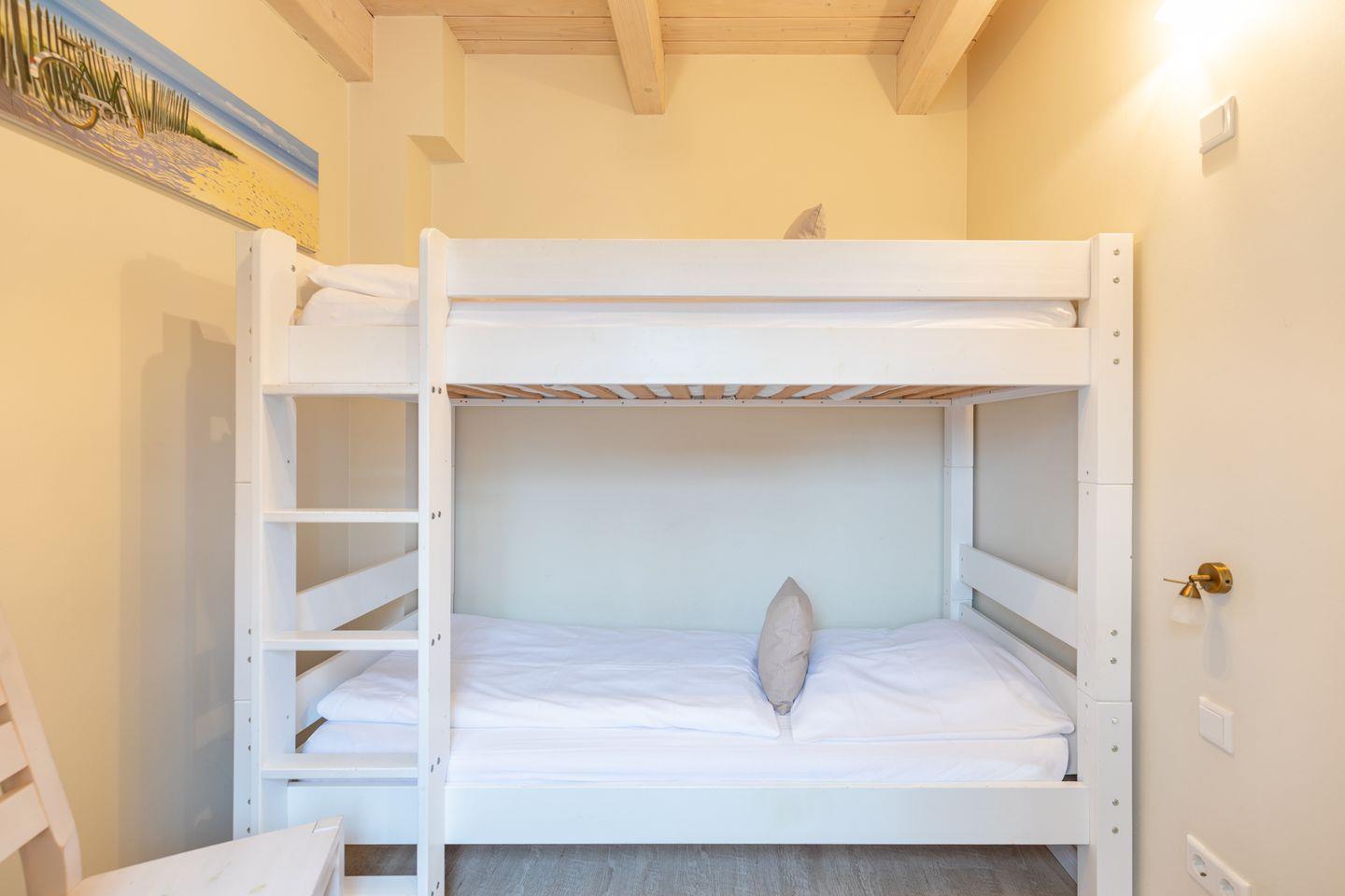 Das 100 qm große Ferienhaus ist modern und exklusiv im skandinavischen Charme eingerichtet. Zwei Schlafzimmer sind mit jeweils einem Komfort-Doppelbett (180 × 200 cm) ausgestattet, ein Schlafzimmer im Erdgeschoss bietet Ihnen ein Eck-Etagenbett, sodass Sie insgesamt für bis zu sechs Personen Platz finden. Das gemütliche Wohnzimmer ist mit SAT-TV und einem Blu-Ray-DVD-Player ausgestattet. Der Kaminofen sorgt in der kälteren Jahreszeit für behagliche Stunden. Die offene Küche bietet Ihnen eine exklusive und umfangreiche Ausstattung, die das Herz eines jeden Hobbykochs höher schlagen lässt: Ceranfeld mit 4 Kochplatten, Backofen, Kühlschrank mit ***Gefrierfach, Mikrowelle, Geschirrspüler, Filterkaffeemaschine, Toaster und Wasserkocher. Das Badezimmer im Obergeschoss lässt keine Wünsche offen: Zwei Waschbecken, eine große Badewanne, eine ebenerdige Dusche und eine schöne Sauna geben Ihrem Urlaub den richtigen Rahmen. Im Erdgeschoss steht Ihnen zusätzlich noch ein Duschbad zur Verfügung. Auf der Terrasse können Sie auf bequemen Gartenstühlen die Sonne genießen.