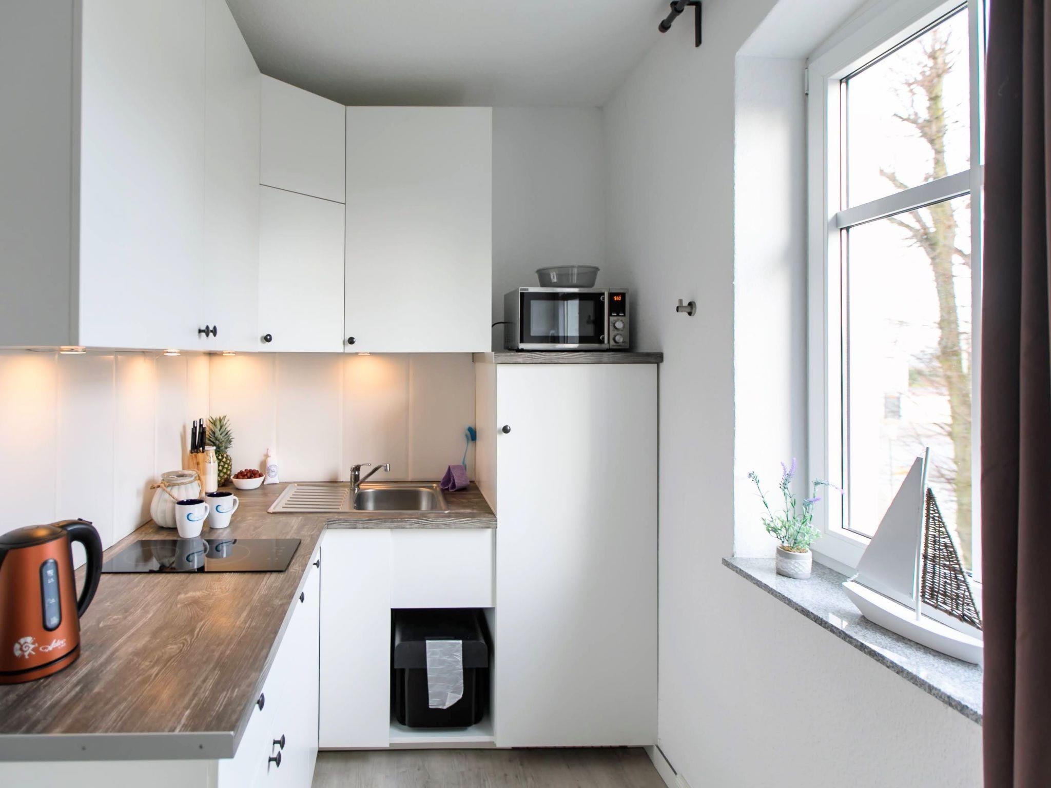 The flat has a bedroom (double bed), children's bedroom (two single beds) and a living-dining room. The kitchen is integrated in the living room and is equipped with a coffee machine, toaster, egg cooker, kitchen utensils, microwave, crockery, pots and a four-burner ceramic hob. The kitchen does not have an oven.