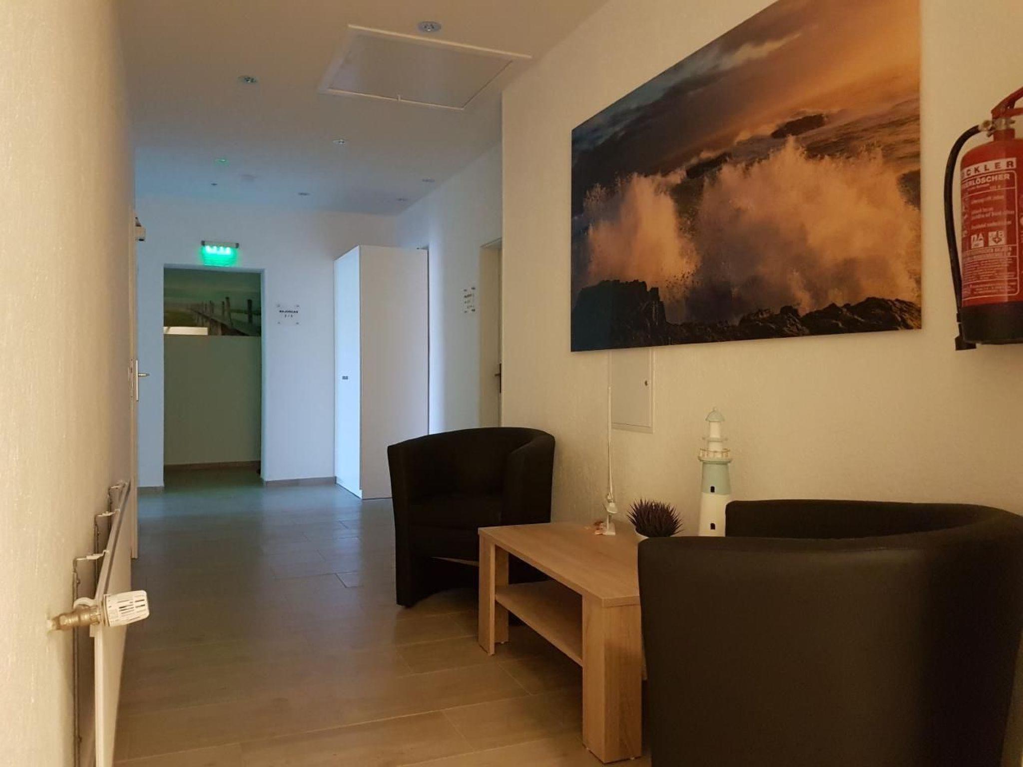 The interior of the flat on the 1st floor is characterised by its light-flooded rooms and friendly accents. A comfortable interior with a spacious 1.80 x 2.00 metre box-spring bed promises restful nights. The well-equipped kitchenette, including a coffee machine, egg cooker, kettle and even a Senseo machine on request, offers everything your heart desires for self-catering. The light-coloured design and tiles ensure a pleasant living atmosphere.
