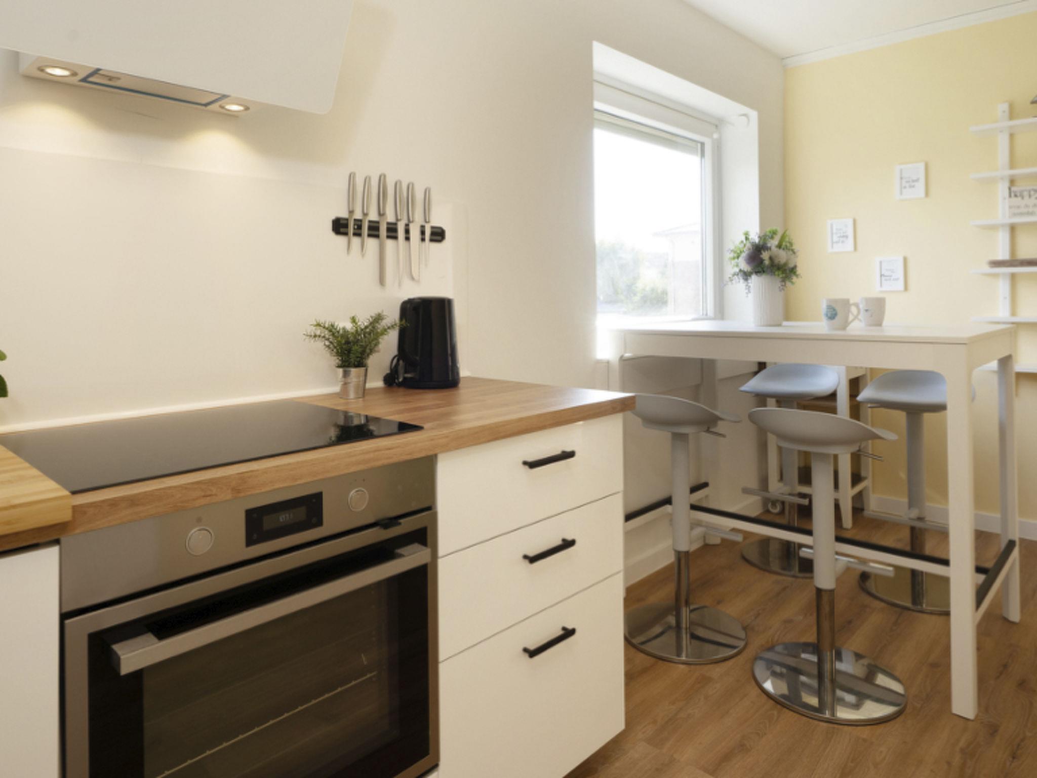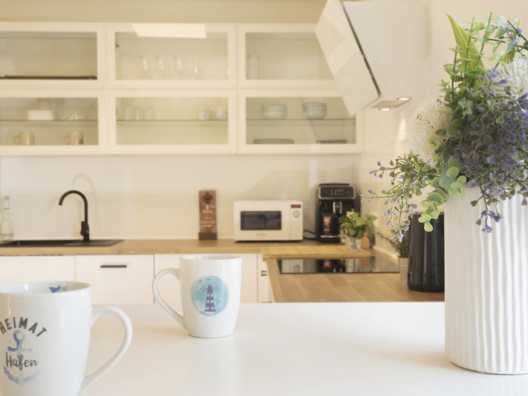 At the end of the hallway, you enter the modern eat-in kitchen with a fully equipped kitchenette and a dining counter. Here you will find everything you need for the perfect dinner. In the adjoining living and dining room, you will find a large dining table with space for up to six people, a comfortable pull-out sofa (2 x 90 x 200 cm) and a large smart TV (55 inch). Here you will also find a shelf with a collection of our guests' beach items.