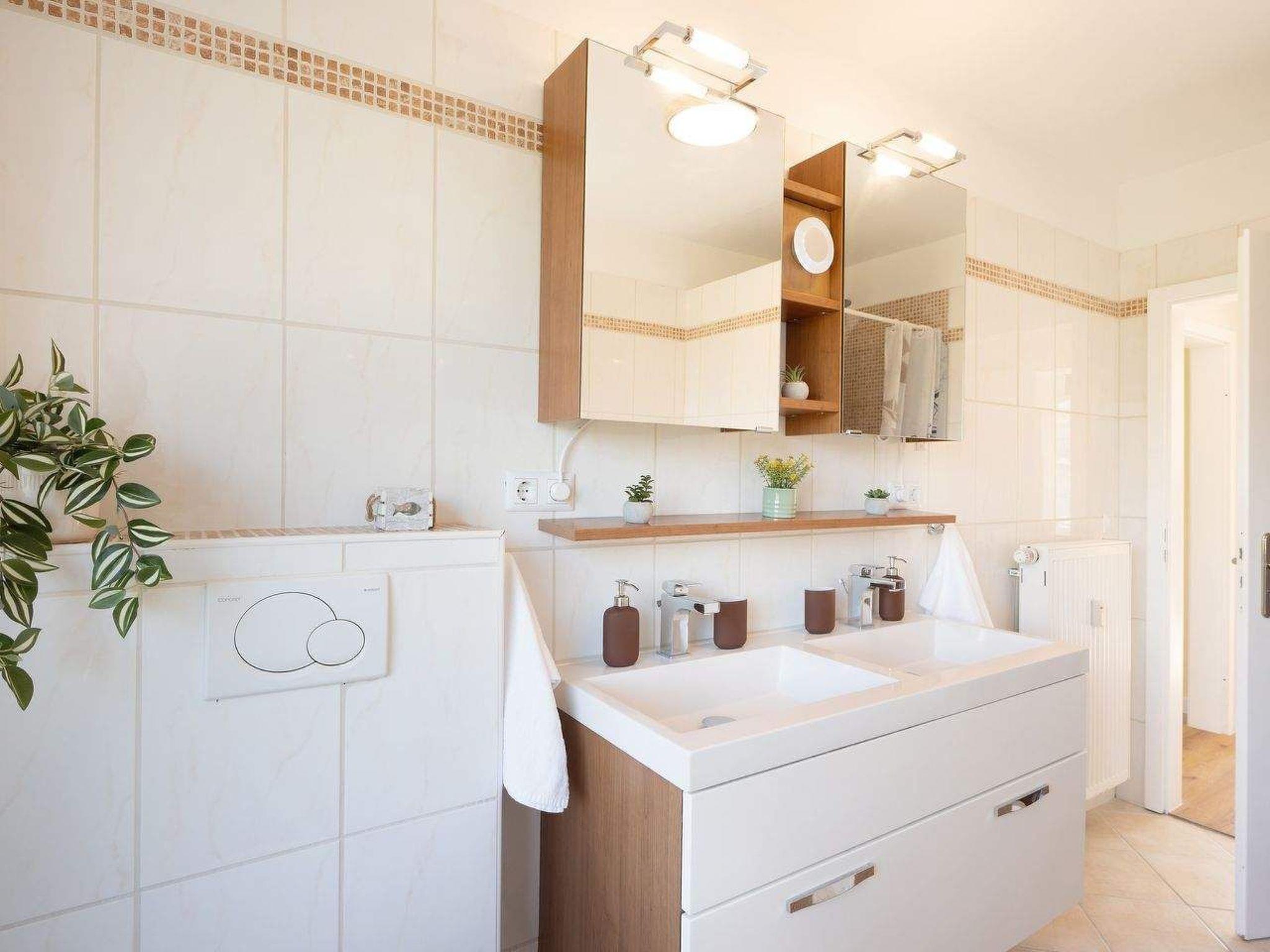 The corridor leads to the left to the quietly located sheep room with a comfortable bed (160 x 200 cm), wardrobe and our ship's gallery. Here, landlubbers can find out about life on the rough seas. Next to the bedroom is the newly renovated large bathroom with bathtub, shower and two washbasins.
