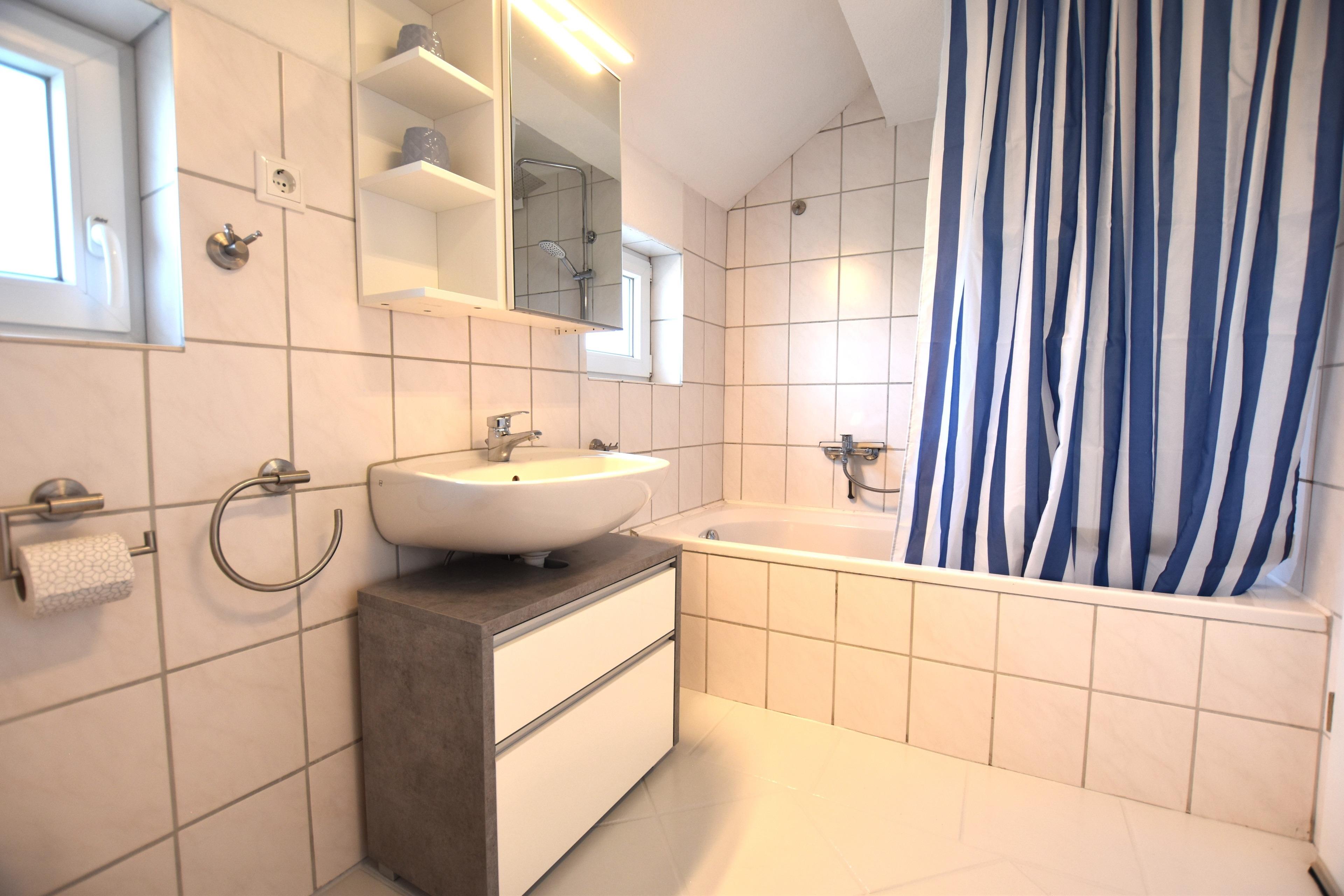 *Badezimmer mit WC, Waschbecken, Spiegelschrank, Fenster, Badewanne (Duschwand vorhanden).