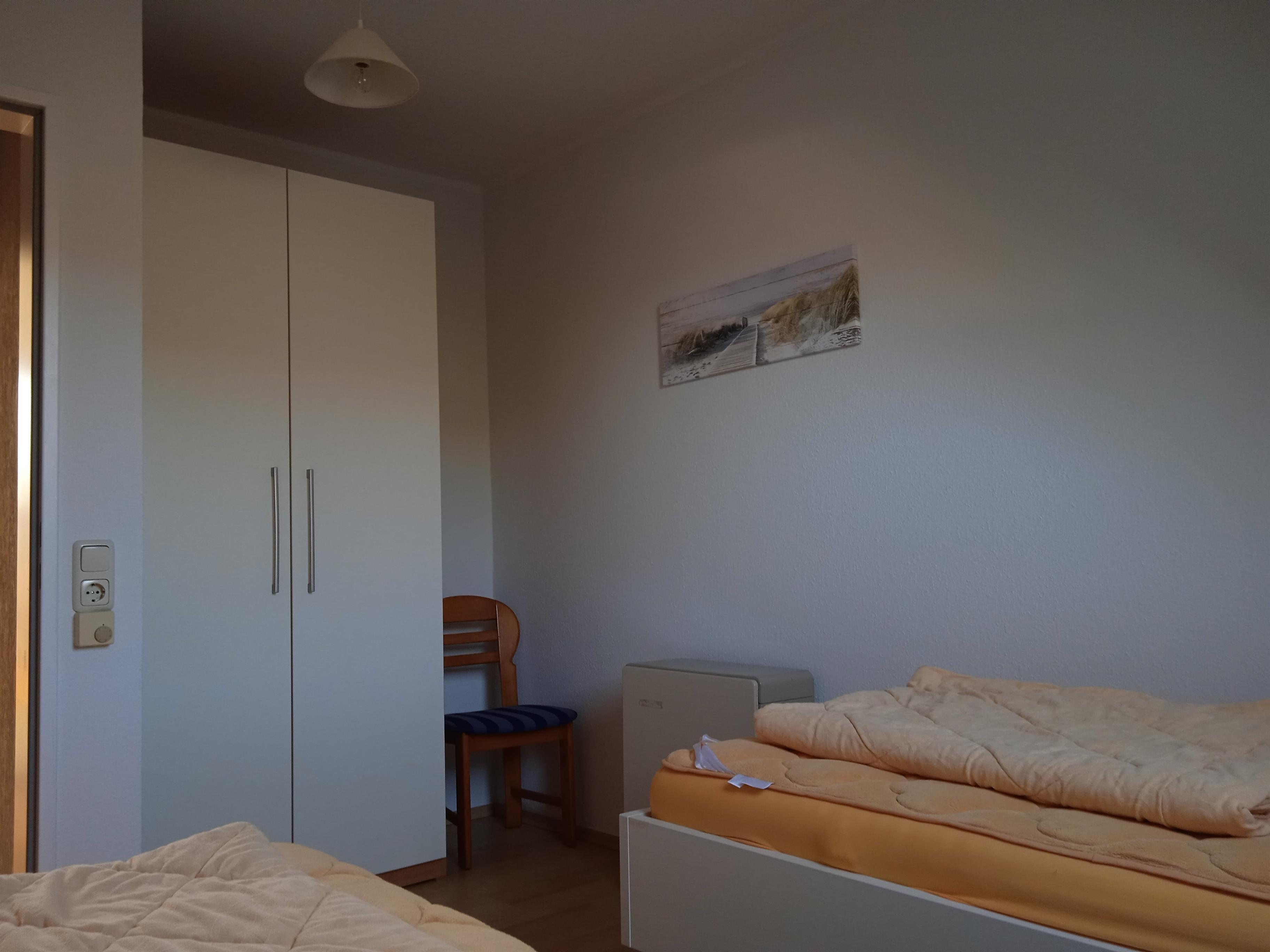 Es verfügt über 2 separate Schlafzimmer (ca. 14m² und ca. 12m²) in der 1. Etage, die Ende 2022 renoviert wurden. In dem größeren Schlafzimmer befindet sich das Doppelbett (1,80m x 2m), in dem Kleineren sind 2 Einzelbetten (2m lang). Es stehen synthetische Bettdecken und Kopfkissen zur Verfügung.