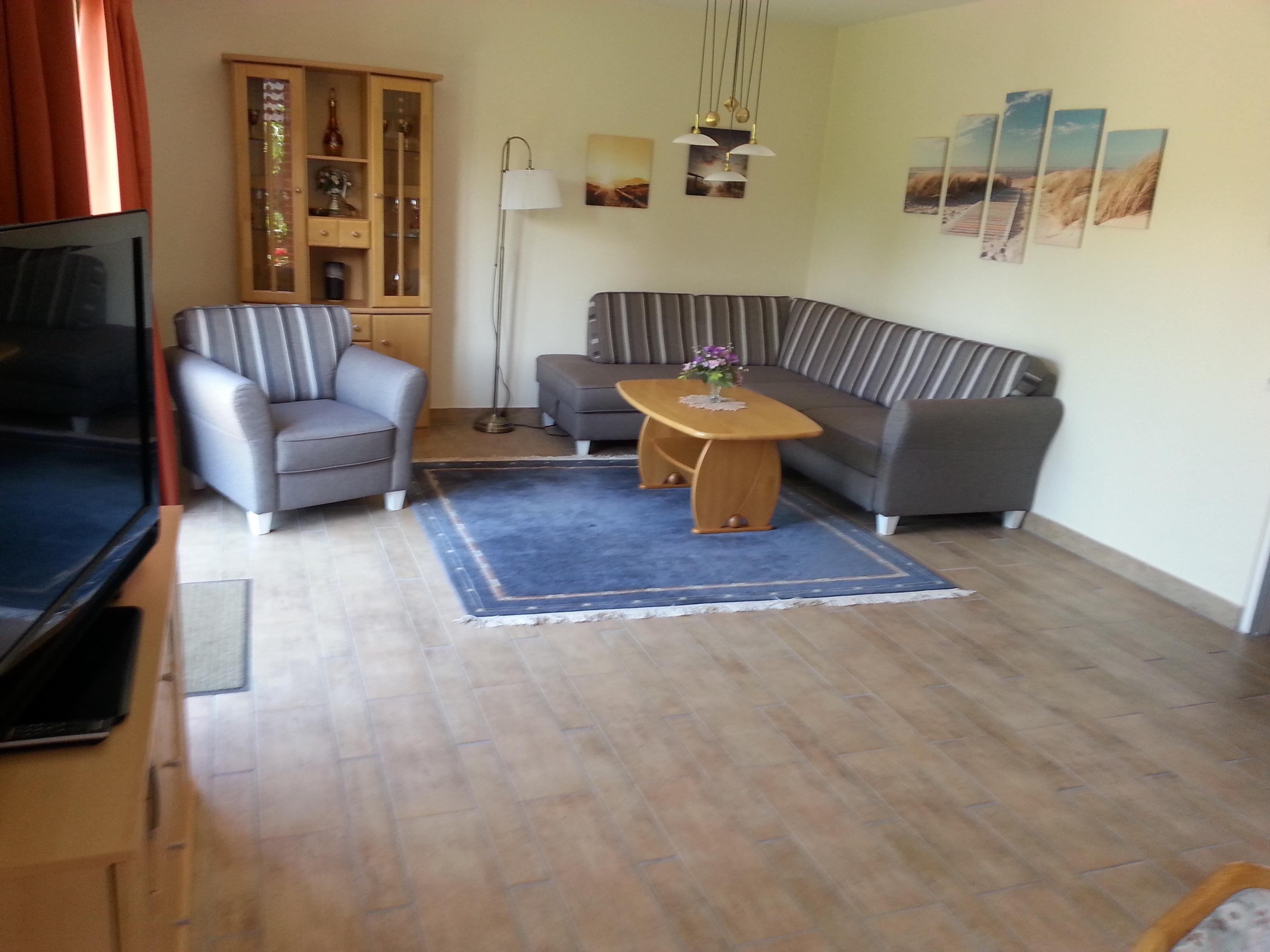 Das Wohnzimmer (ca. 30m²) hat eine Südwestterrasse, 1 Ecksofa mit Schlaffunktion (für 1 Person), 1 Sessel, SAT-TV, eine Essecke und