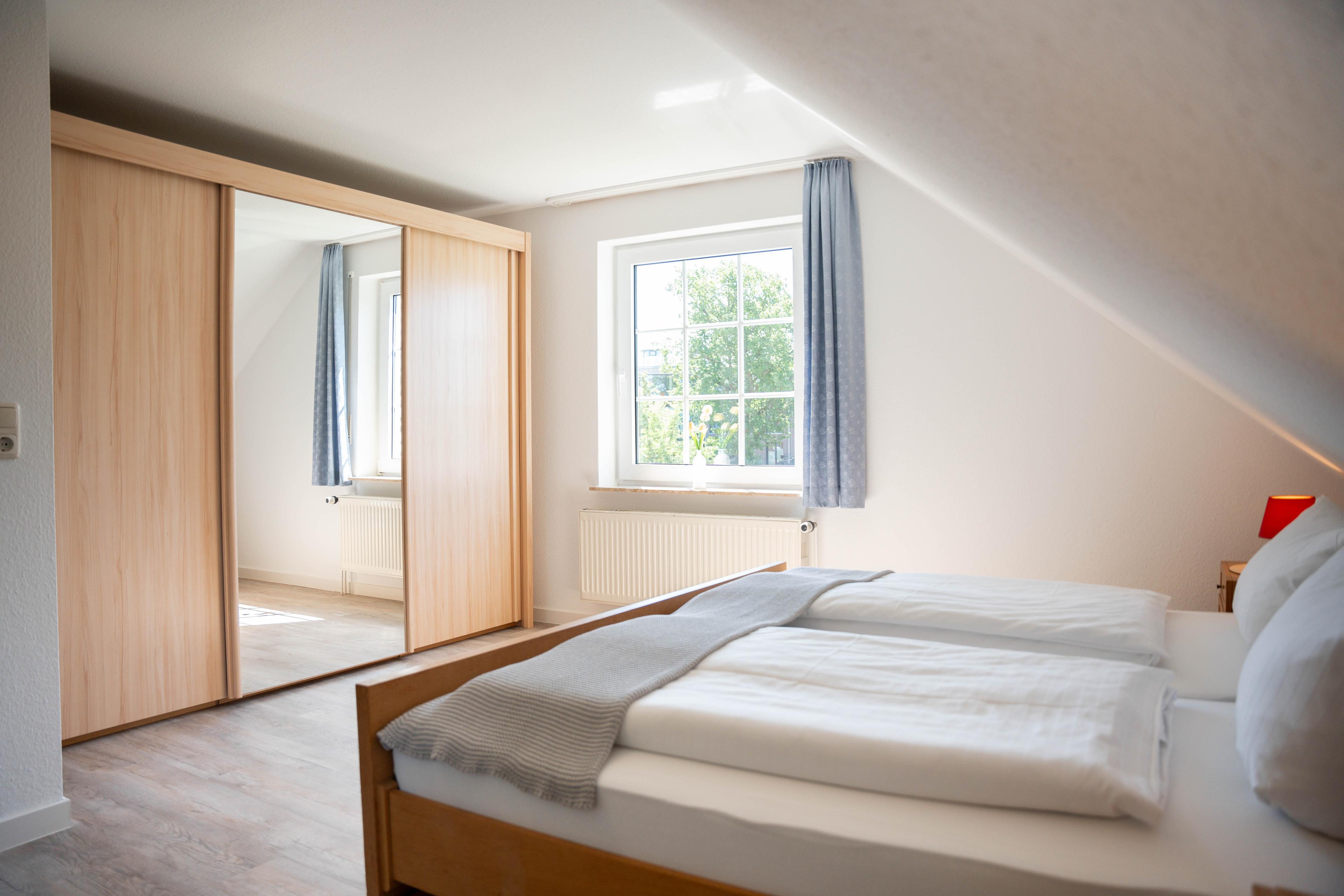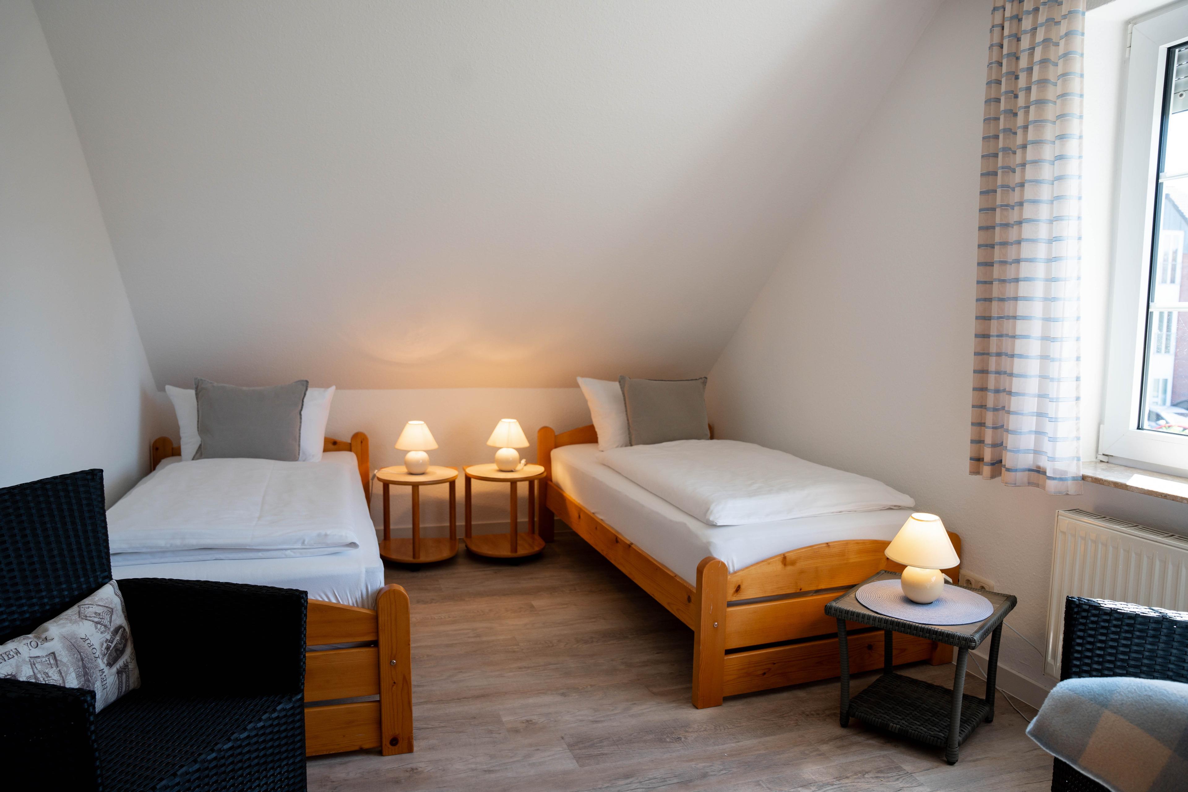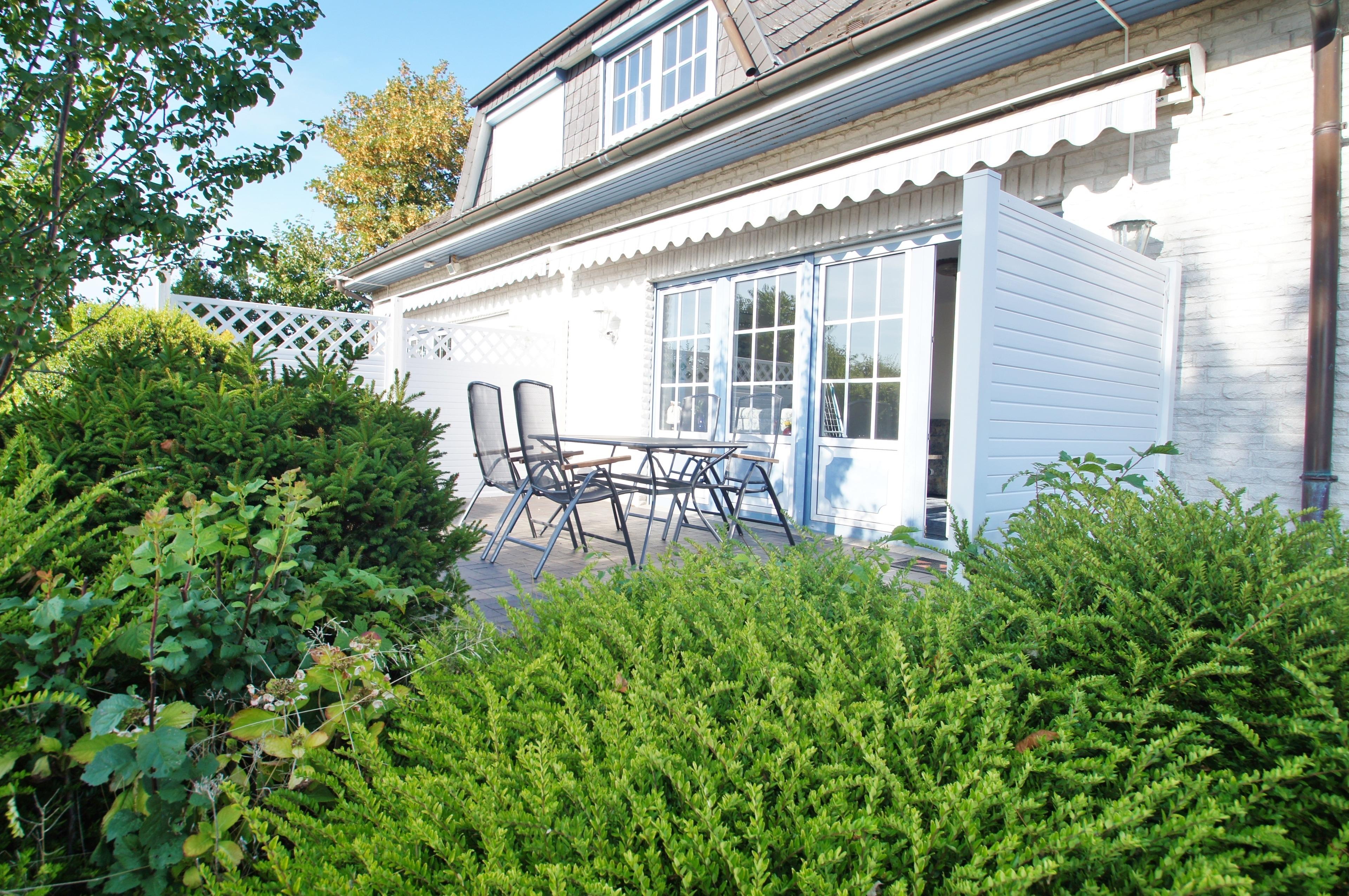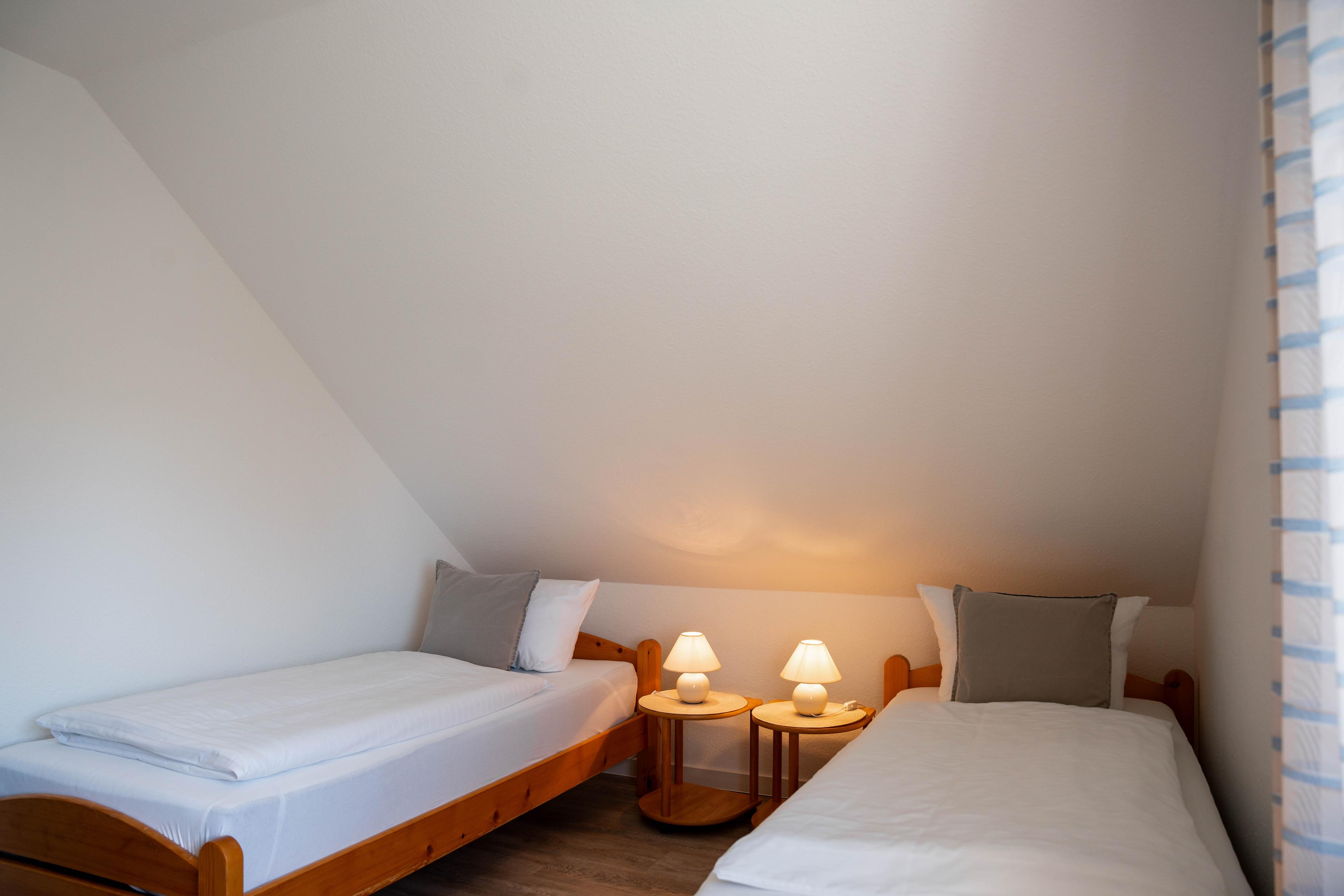 Aufgeteilt ist Ihr Ferienobjekt in Eingangsbereich mit separatem WC, einer gut ausgestatteten Küche mit kleinem Esstisch und 3 Stühlen, einem sehr großzügigen Wohnzimmer mit bequemer Couchgarnitur, einem Esstisch mit Sitzgelegenheit im Erdgeschoss. Vom Wohnzimmer aus, gelangen Sie auf die am Haus befindliche möblierte Terrasse und in den eingezäunten Gartenbereich. Im Obergeschoss der Doppelhaushälfte befinden sich 2 Schlafzimmer, eines mit Doppelbett (180x200cm) und kleiner Sitzgelegenheit und einem Schlafzimmer mit 2 Einzelbetten (90x200cm), sowie einem separatem WC mit Spiegel und Waschbecken und einem separatem Duschbad mit Badewanne, Dusche und Waschbecken. Alle Fenster sind mit Aussenjalousien verdunkelbar.