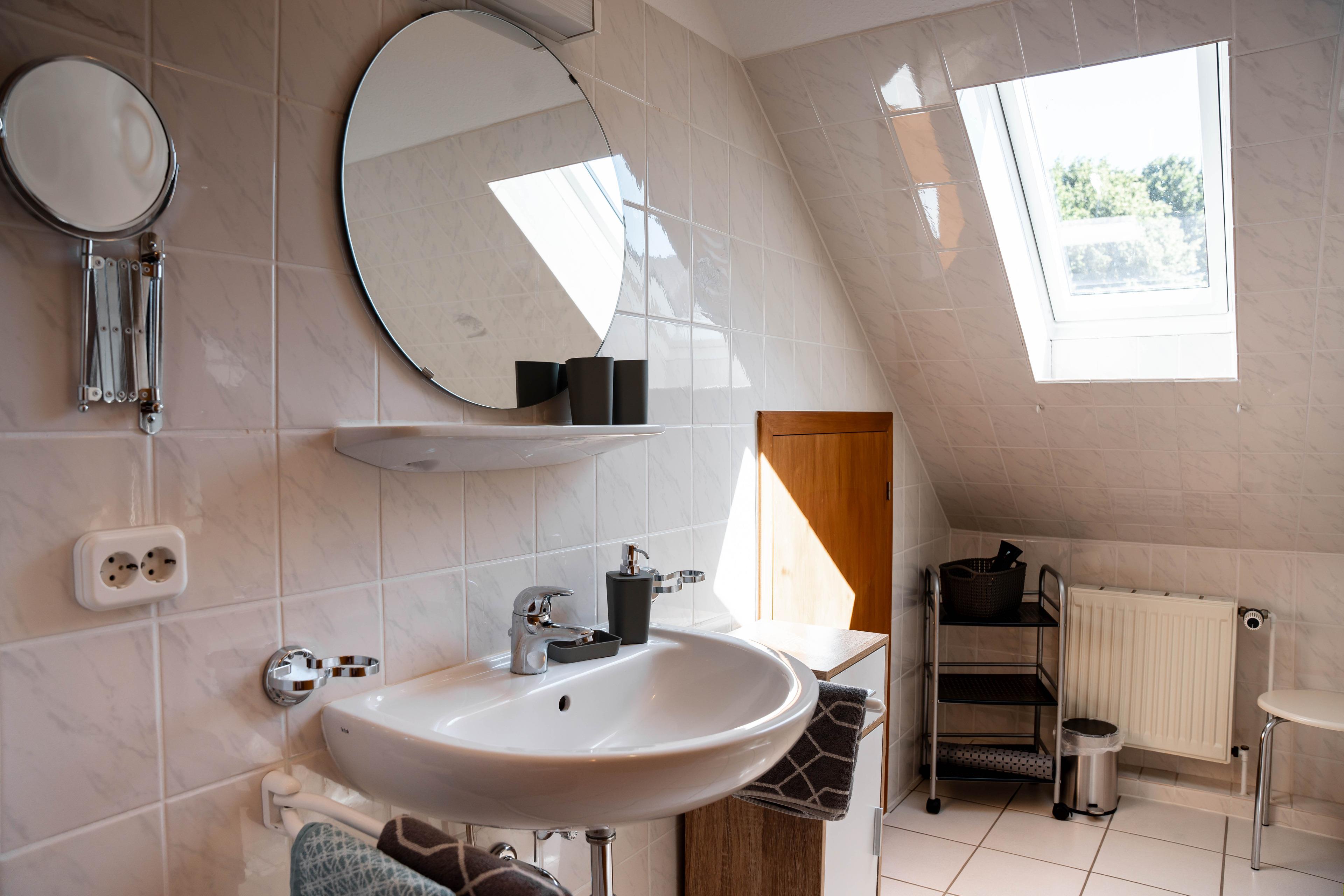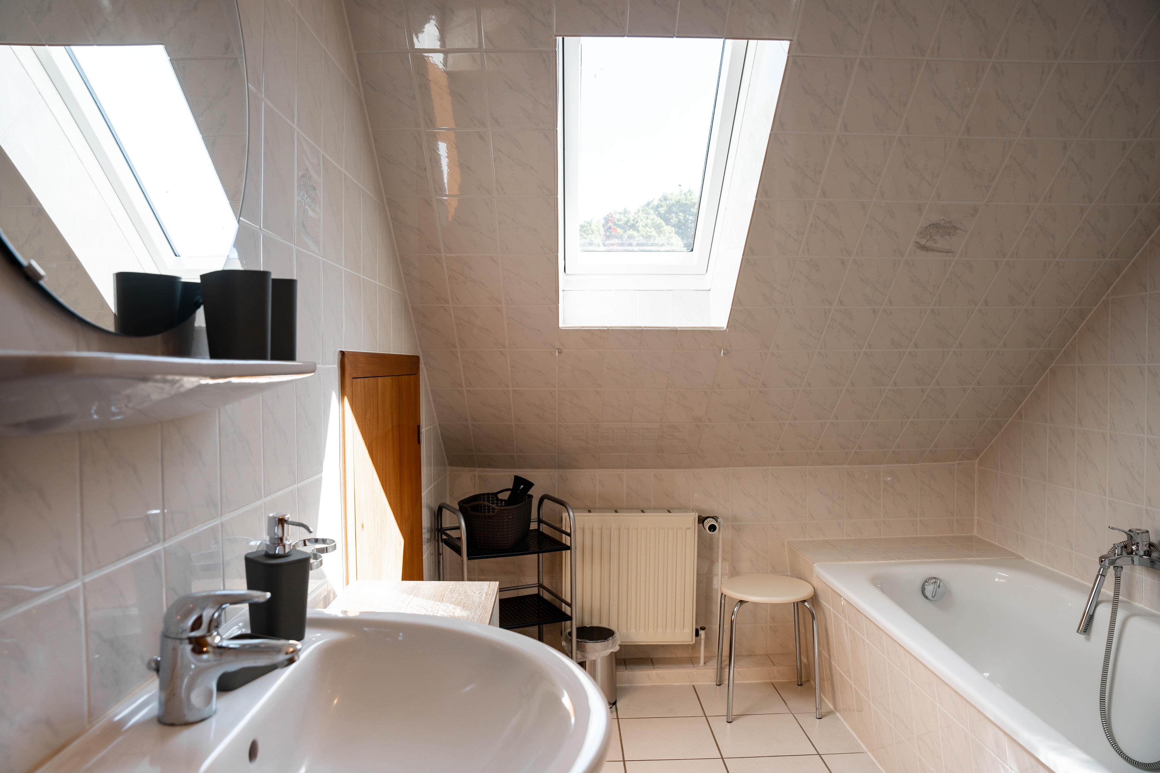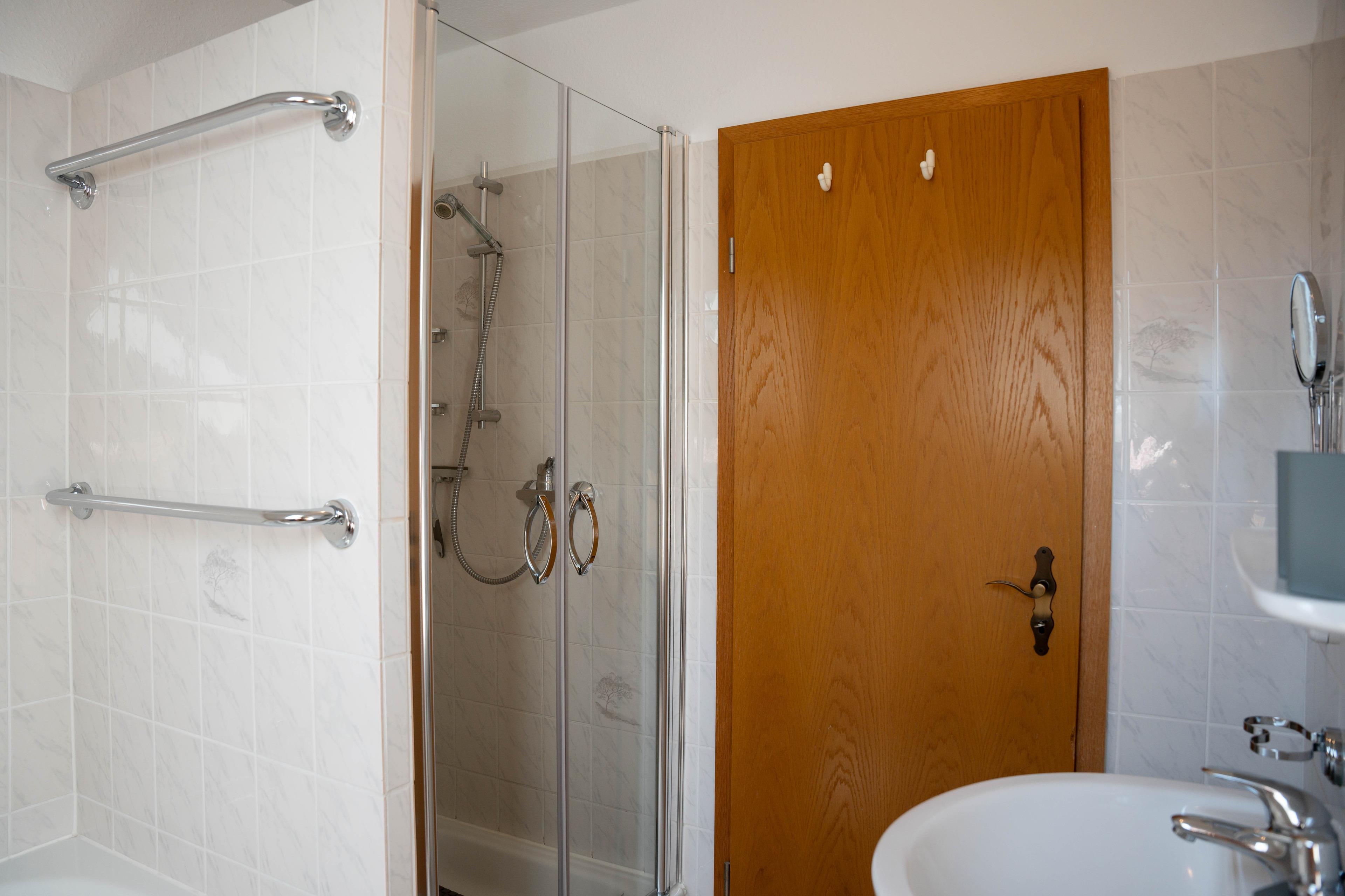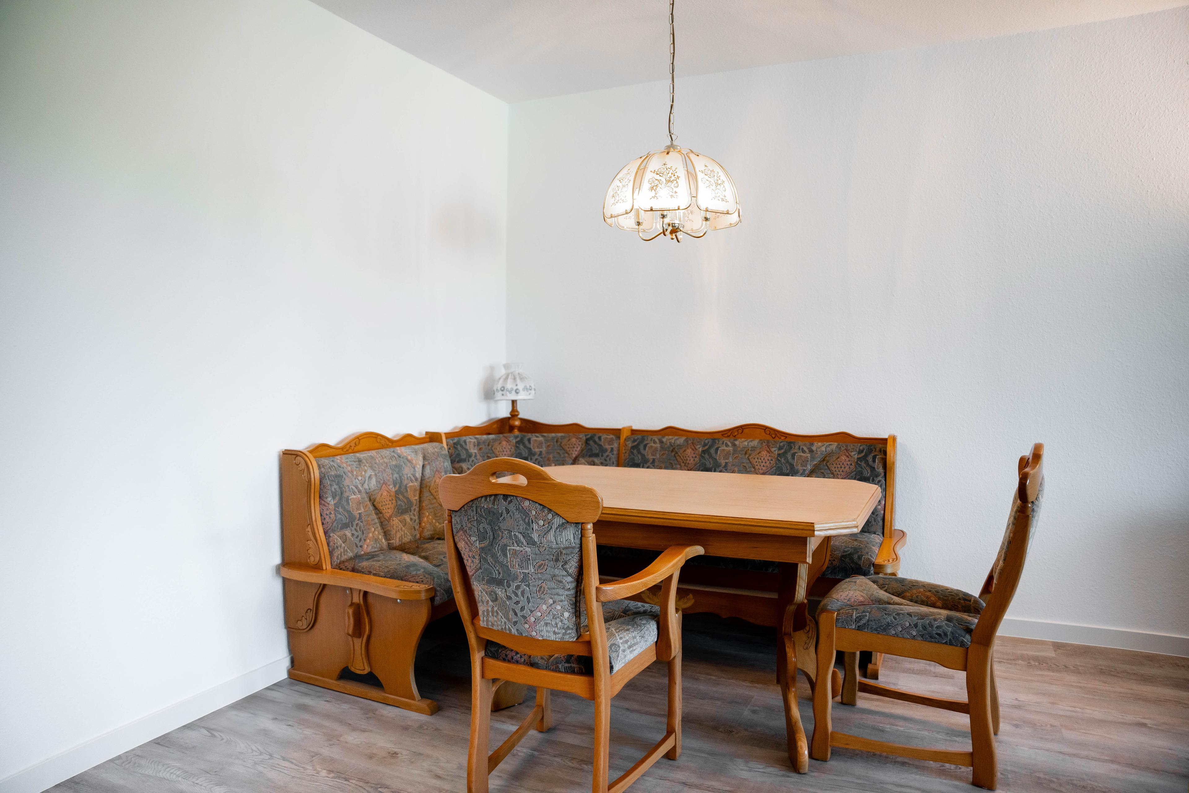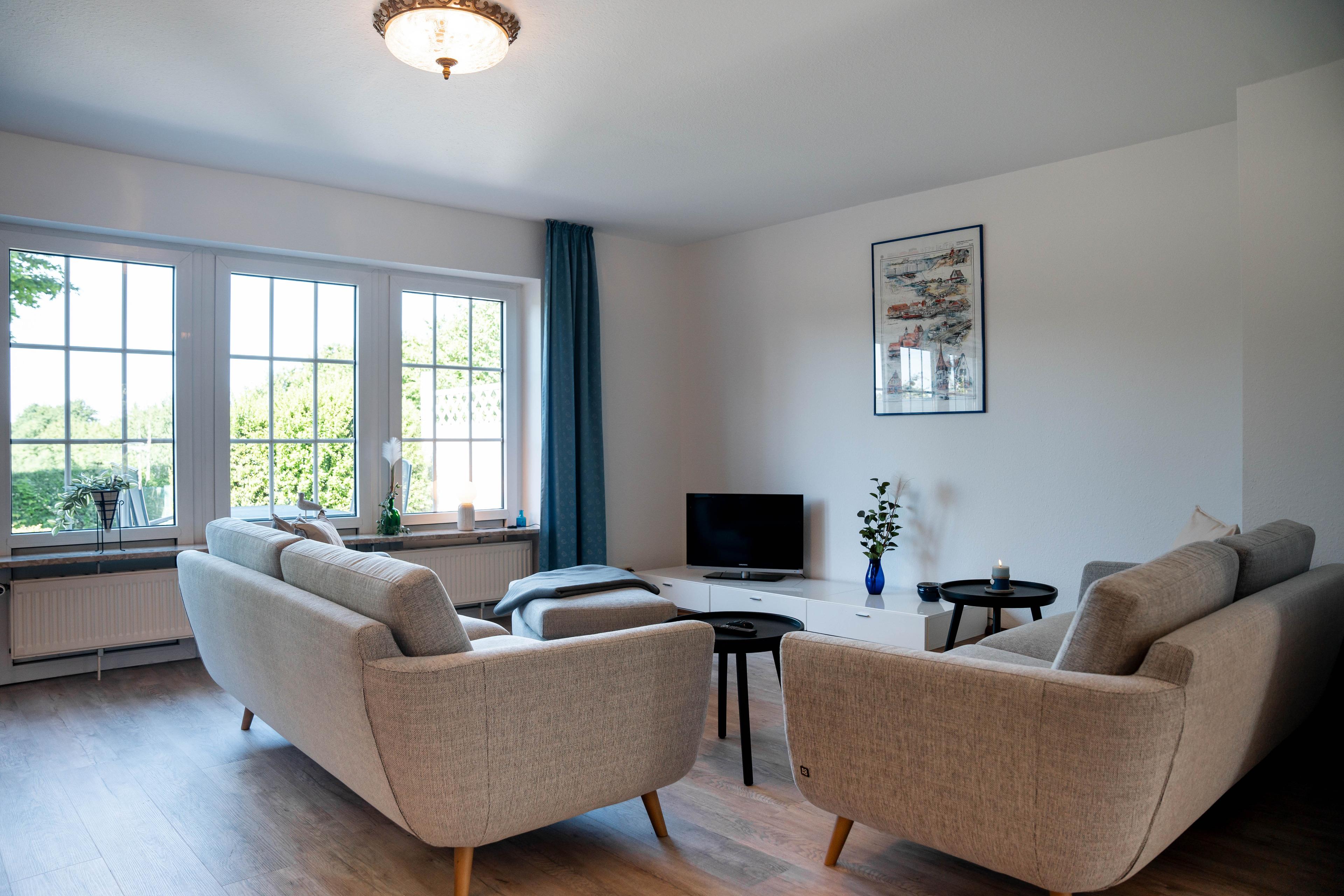 Aufgeteilt ist Ihr Ferienobjekt in Eingangsbereich mit separatem WC, einer gut ausgestatteten Küche mit kleinem Esstisch und 3 Stühlen, einem sehr großzügigen Wohnzimmer mit bequemer Couchgarnitur, einem Esstisch mit Sitzgelegenheit im Erdgeschoss. Vom Wohnzimmer aus, gelangen Sie auf die am Haus befindliche möblierte Terrasse und in den eingezäunten Gartenbereich. Im Obergeschoss der Doppelhaushälfte befinden sich 2 Schlafzimmer, eines mit Doppelbett (180x200cm) und kleiner Sitzgelegenheit und einem Schlafzimmer mit 2 Einzelbetten (90x200cm), sowie einem separatem WC mit Spiegel und Waschbecken und einem separatem Duschbad mit Badewanne, Dusche und Waschbecken. Alle Fenster sind mit Aussenjalousien verdunkelbar.