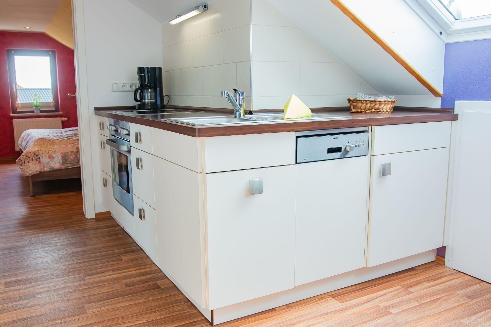Moderne Ferienwohnung im Dachgeschoss eines Wohnhauses mit einem Schlafzimmer. Das Wohnzimmer bietet eine schöne Wohnlangschaft zum entspannen. WLAN und TV vorhanden. Die schicke Küche bietet Ihnen alles, was Sie im Urlaub benötigen.