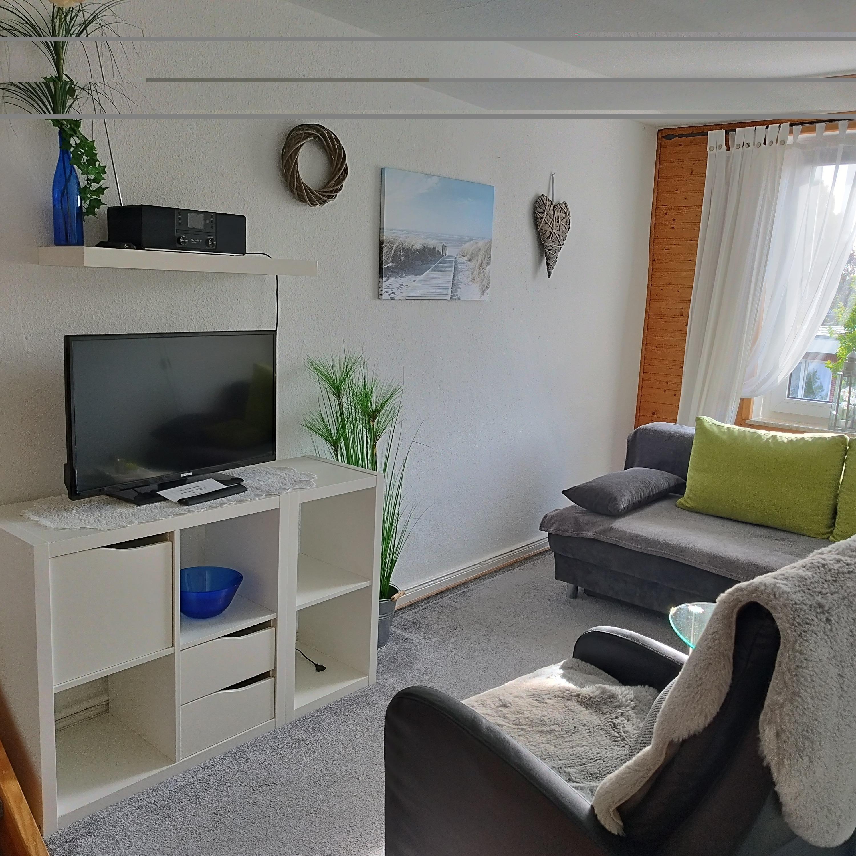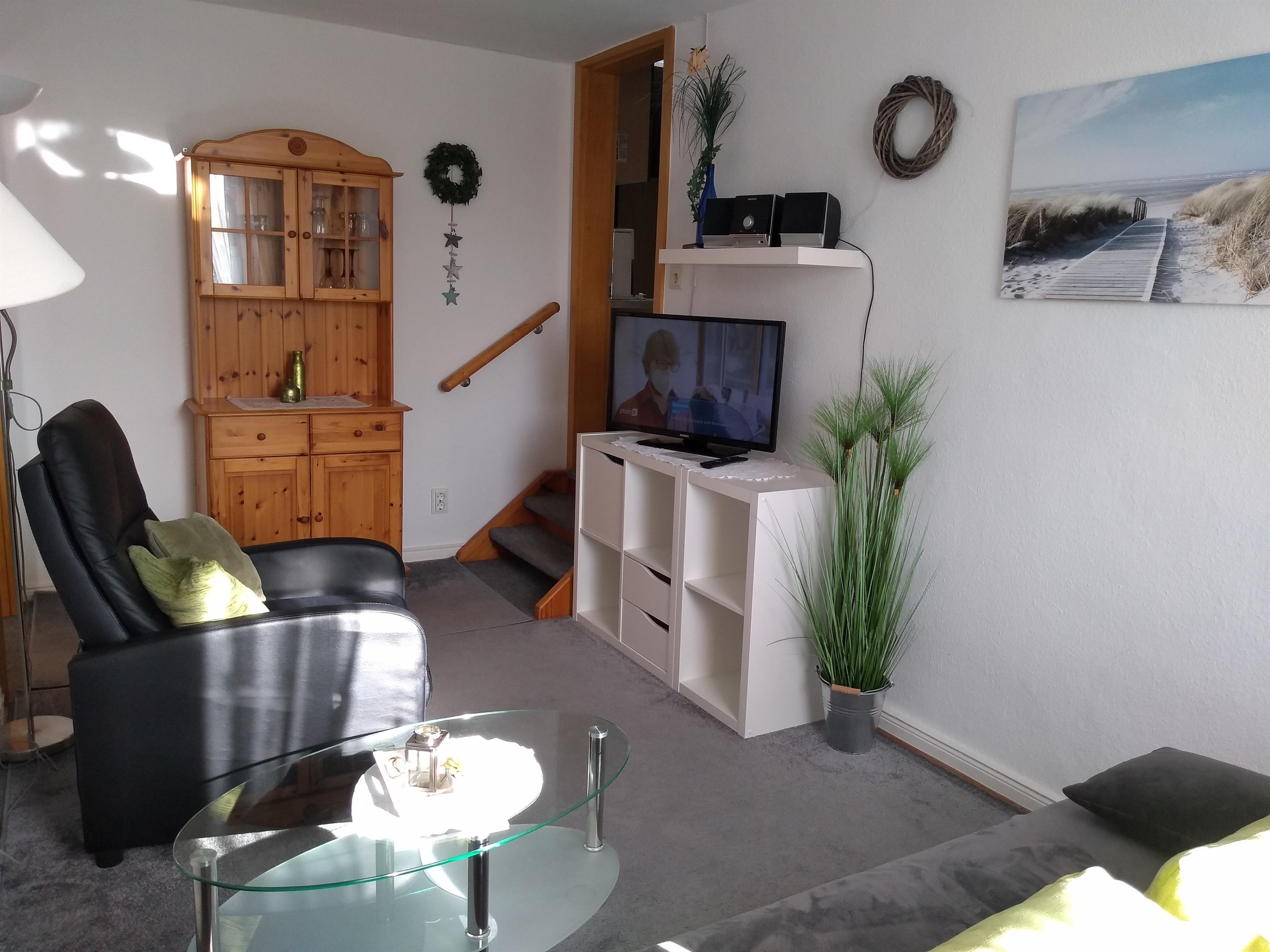 Wohnzimmer oder Wohnschlafraum wer getrennt schlafen möchte. Damit Sie auch im Wohnzimmer gesund u. komfortabel schlafen können, 1 Umklappsofa mit Federkern auf Lattenrost Liegefläche 160 x 200, Fernseh- Sessel. Sat TV, Stereoanlage m. CD + DVD, Spiele, Bücher. Schlafzimmer: 2 gr. Betten (je 200x90) Küche, Dusche/WC.