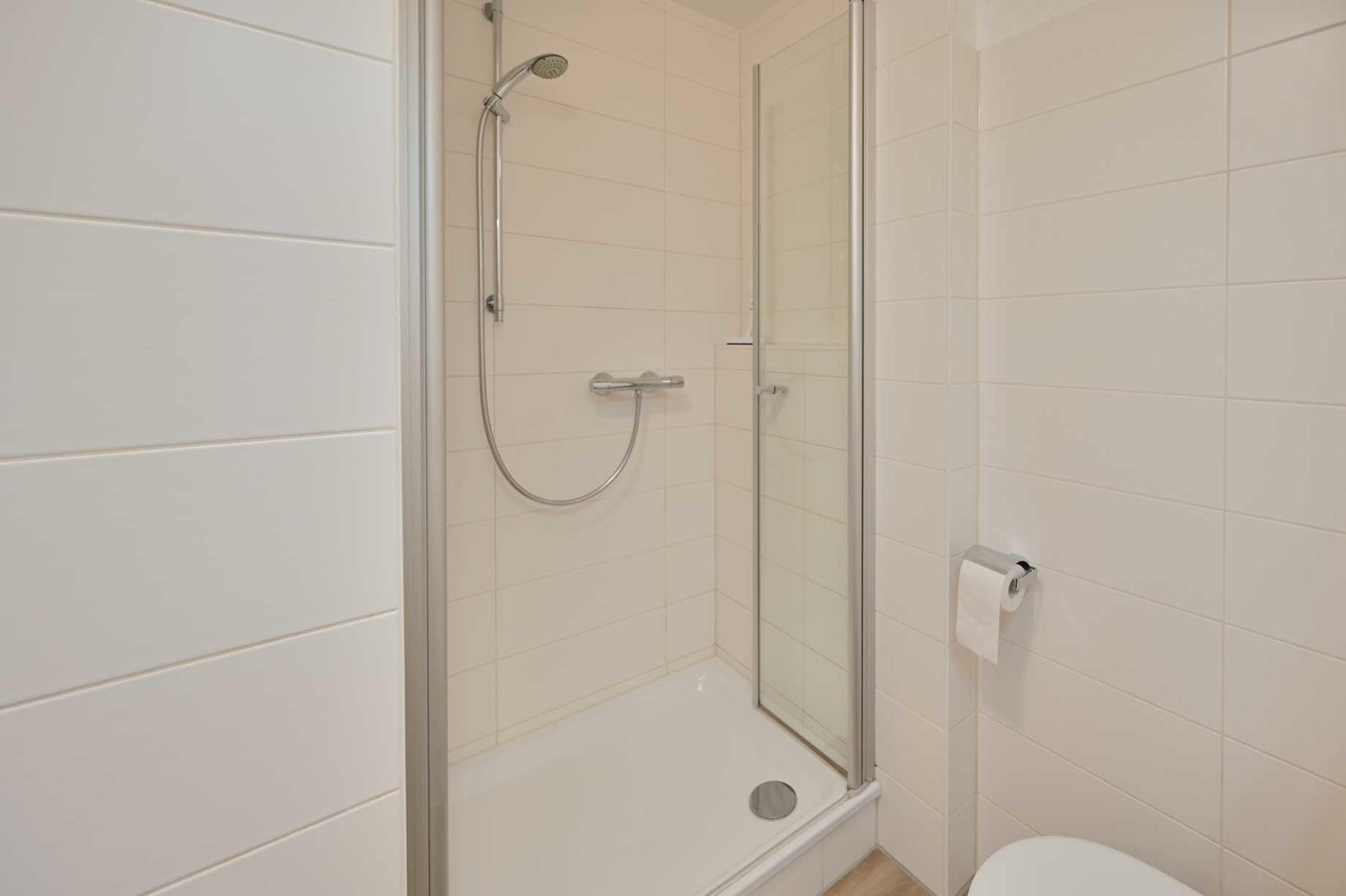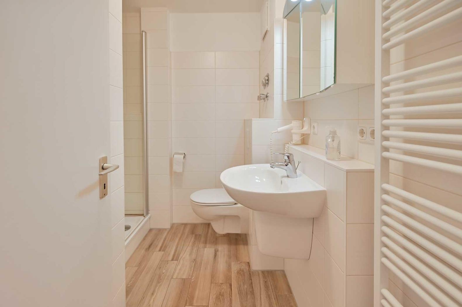 Der separate Schlafraum ist mit einem Doppelbett 2x Einzelmatratzen(190 x 200 cm), Nachttischen, und einem 4-türigen Kleiderschrank ausgestattet. Zudem verfügt die Ferienwohnung über ein modernes Bad mit WC, einem Spiegelschrank und Fön, und eine 80 x 100 cm Duschwanne mit niedrigem Einstieg.