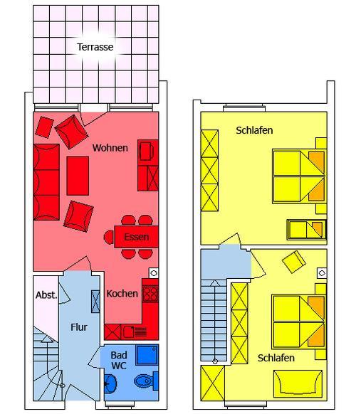 Im Obergeschoss befinden sich ein separates Schlafzimmer mit Doppelbett, Kinderbett und Kleiderschrank und ein weiteres separates Schlafzimmer mit Einzelbetten.