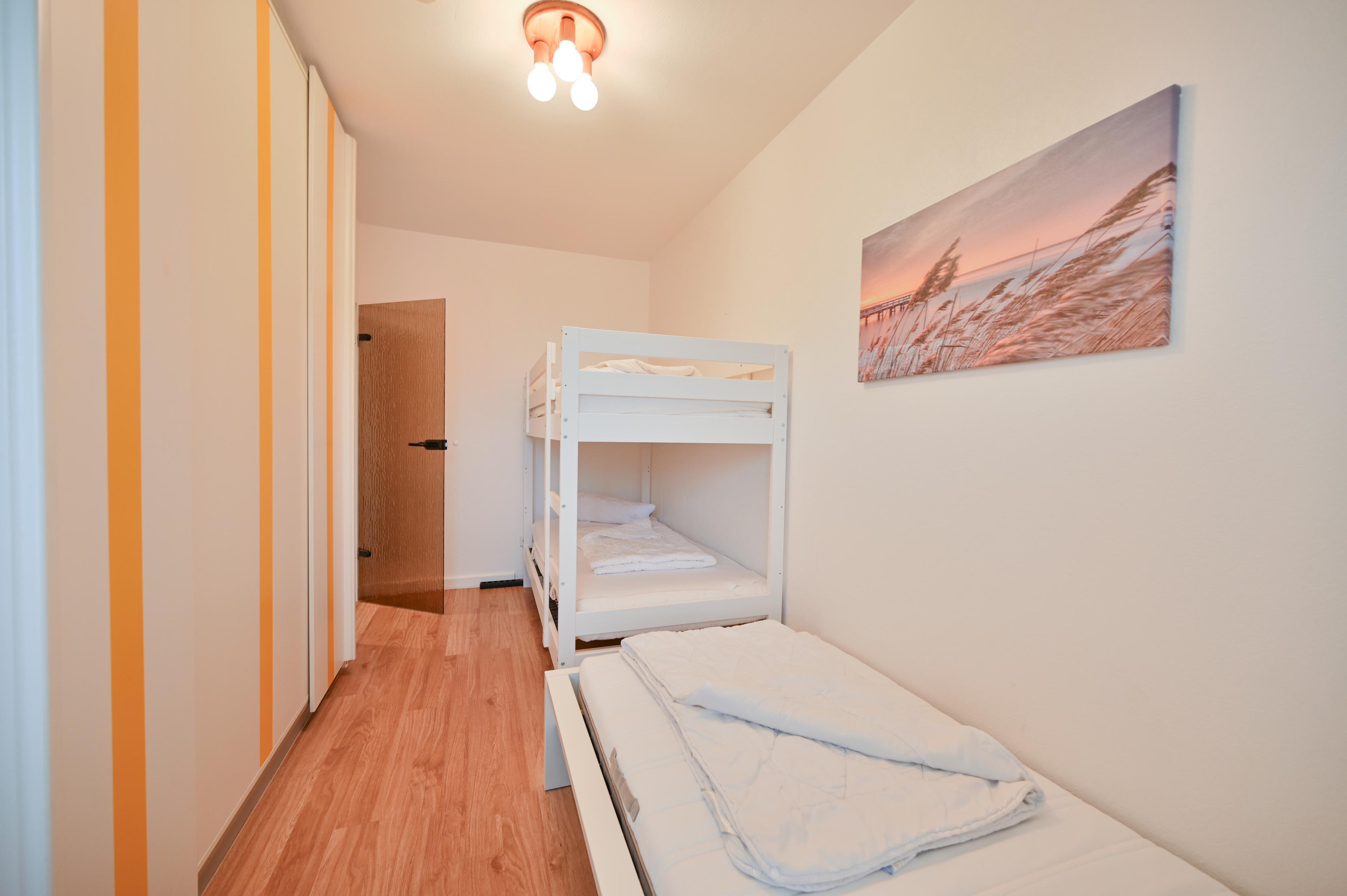 Das zweite separate Schlafzimmer/ Kinderzimmer verfügt über zwei einzelne neue große Betten. Ein Kleiderschrank und ein Baby-Reisebett mit Matratze ist vorhanden.