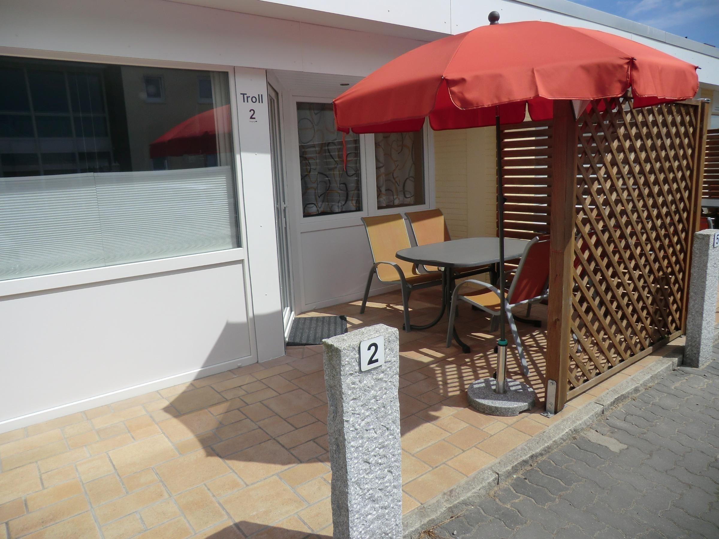 Zur Ferienwohnung gehört eine eigene, kleine Terrasse, auf welcher Sie die Urlaubssonne in vollen Zügen genießen können. Einladende Gartenmöbel ermöglichen hier sowohl ein entspanntes Verweilen im Freien als auch nach draußen verlegte Urlaubsmahlzeiten. Vor allzu viel Sonne schützt bei Bedarf der vorhandene Sonnenschirm.
