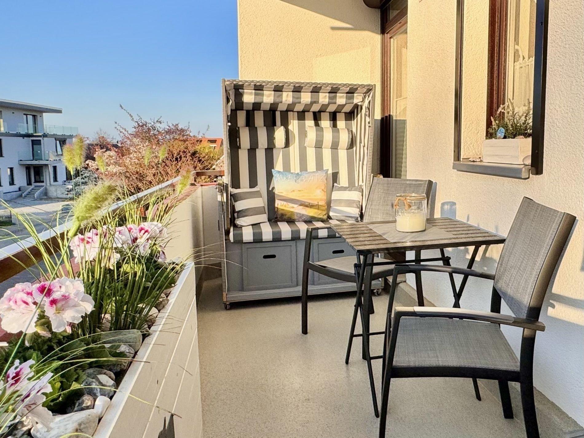 Zwei Balkone mit gemütlichen Sitzmöbeln und Strandkorb bieten Ihnen reichlich Freiraum und sorgen für herrliches Feriengefühl von früh bis spät. Von dem Balkon im Süd-Westen blicken Sie ins Grüne und genießen die Nachmittagssonne, im Nord-Westen haben Sie noch Abendsonne und sitzen ruhig ohne Einblicke im Strandkorb. Die Ferienwohnung verfügt außerdem über einen PKW-Stellplatz in der Tiefgarage.