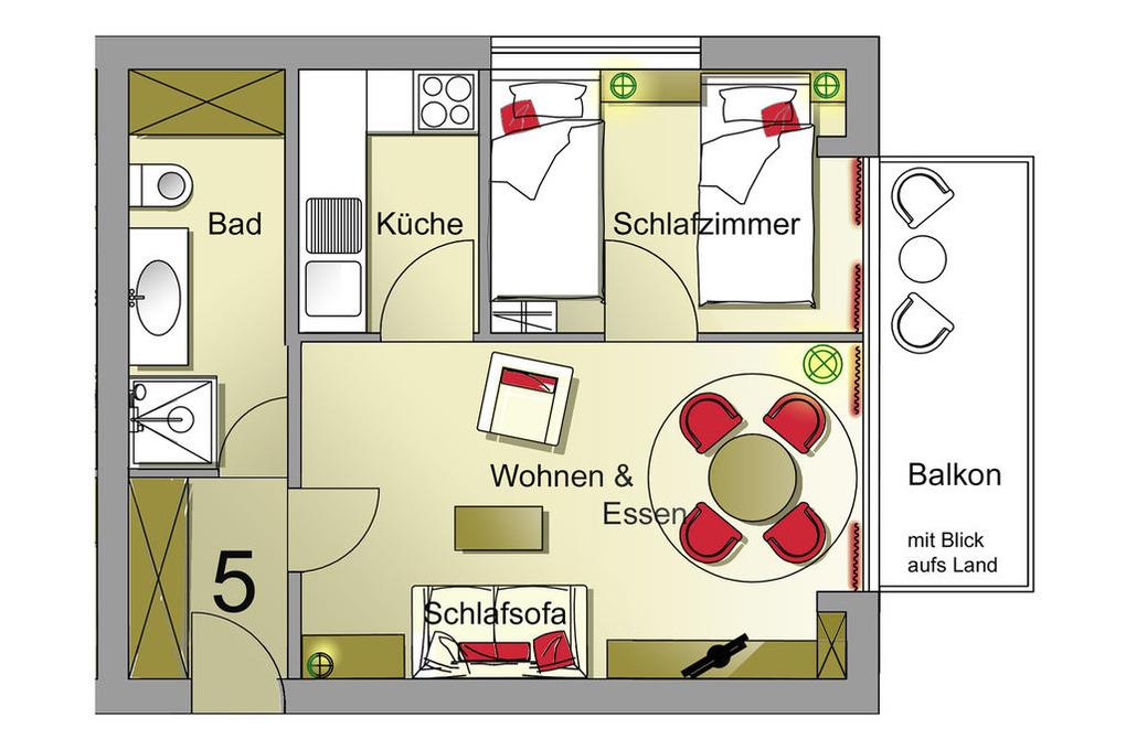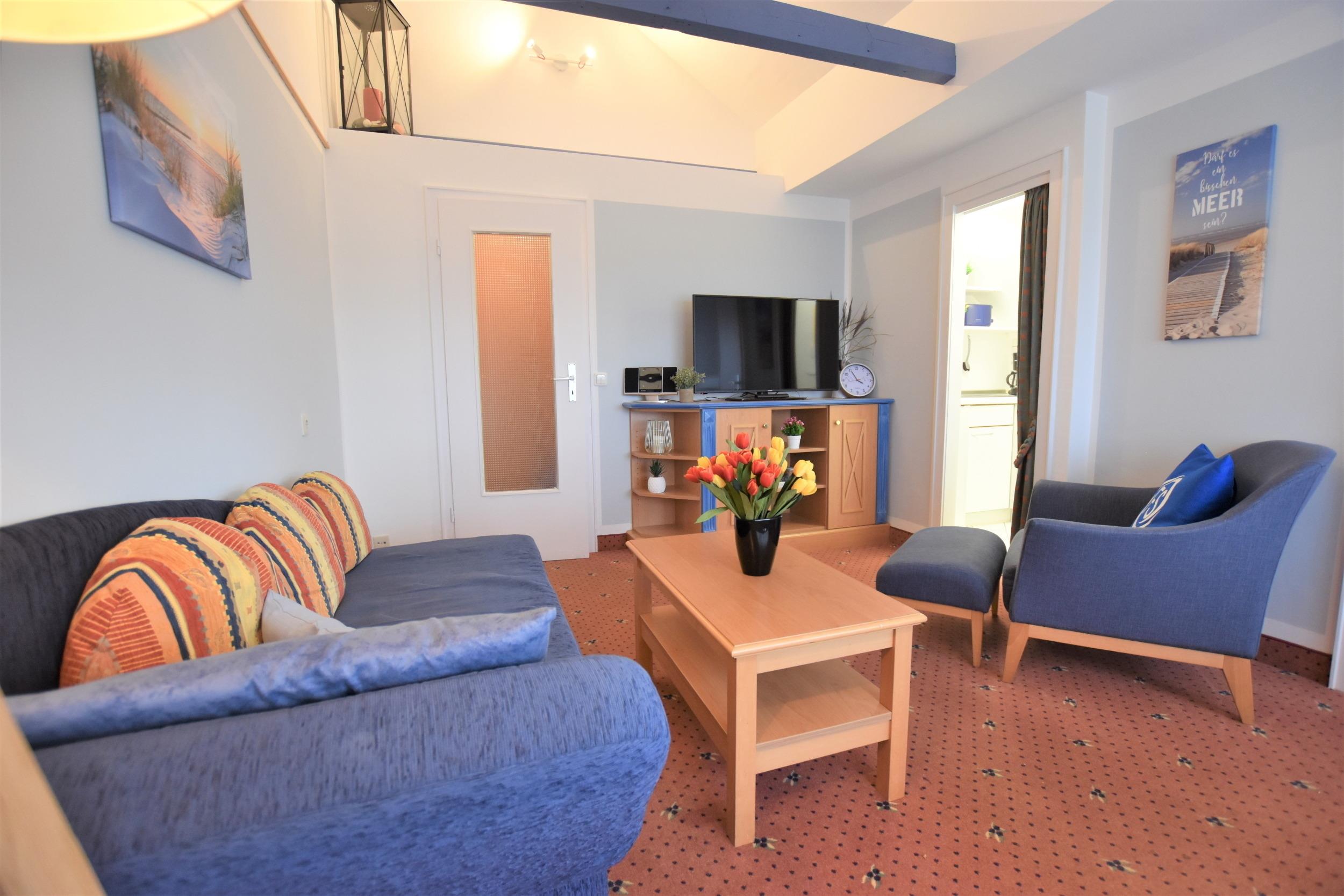 Die Wohnung verfügt über einen gemütlichen und hellen Wohnraum, einen separaten Schlafraum mit 2 getrennten Einzelbetten (je 90x200cm), eine gut ausgestattete Küche und ein helles Badezimmer mit Dusche. Die heimelige Wohnzimmerausstattung bietet mit einer komfortablen Récamiere alternativ noch einen zusätzlichen Schlafplatz. Strecken Sie hier nach einem langen Strandspaziergang bequem die Beine aus, auch an Regentagen sorgt ein moderner Flatscreen -TV und ein kostenloser WLAN für Unterhaltung. Gemütliche Ferien sind hier garantiert!