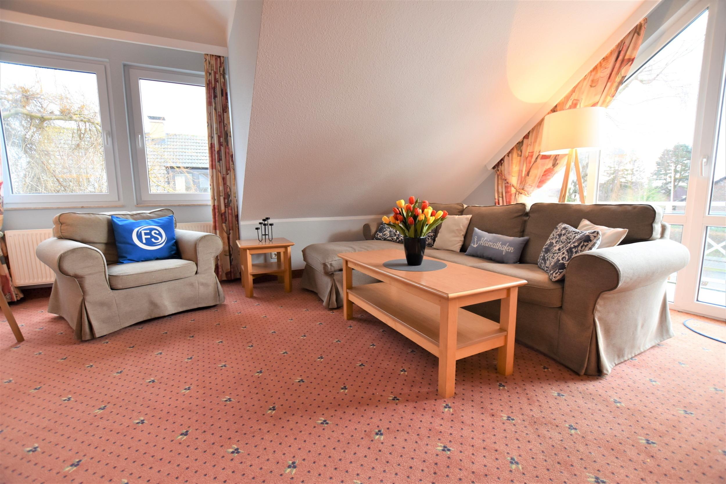 Von Ihrem Wohnzimmer führt ein direkter Zugang auf einen möblierten Balkon mit S/Ostausrichtung, genießen Sie hier beschauliche Abende bei einem guten Glas Wein und einer frischen Prise Ostseeluft.