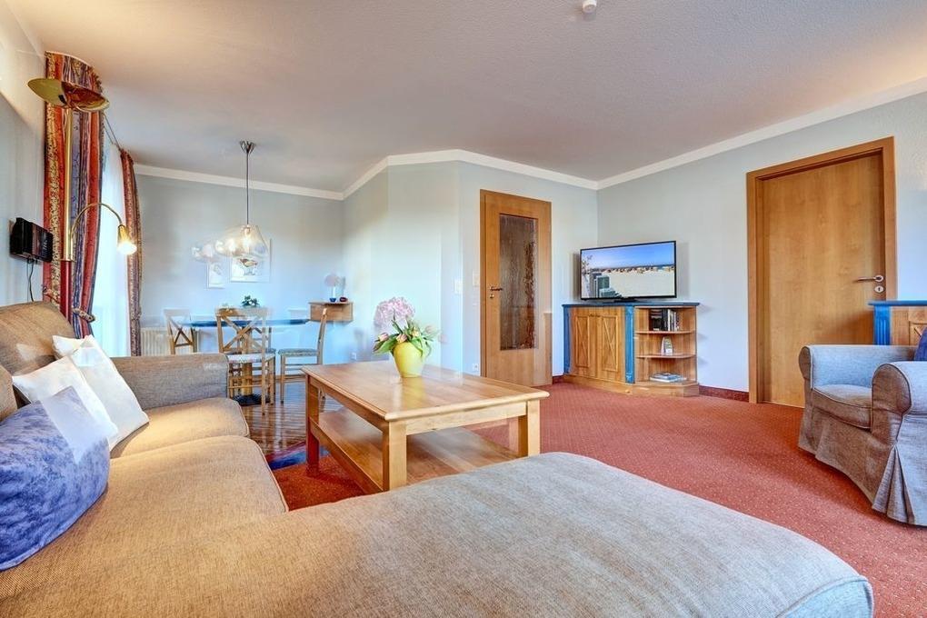 Es erwartet Sie eine drei Zimmerwohnung auf ca.68 m² für max. 4 Erw. + ein Kleinkind. ein großer Eingangsbereich mit Garderobe, ein geschmackvoll eingerichteter Wohnraum mit Sofabereich, Flachbild-TV, Esstisch und direktem Zugang zur bestuhlten Terrasse. eine separater Küche mit Geschirrspüler, Ceranfeld, Mikrowelle und Waschmaschine. Schlafraum (1) mit Doppelbett (2x90x200), Kleiderschrank, Nachtisch, Nachtischlampe und Flachbild-TV. Schlafraum (2) mit zwei Einzelbetten (90x200), Kleiderschrank, Nachtisch, Nachtischlampe. sowie einem Duschbad mit Dusche, Waschbecken, Spiegelschrank und WC. WLAN steht Ihnen kostenfrei zur Verfügung.