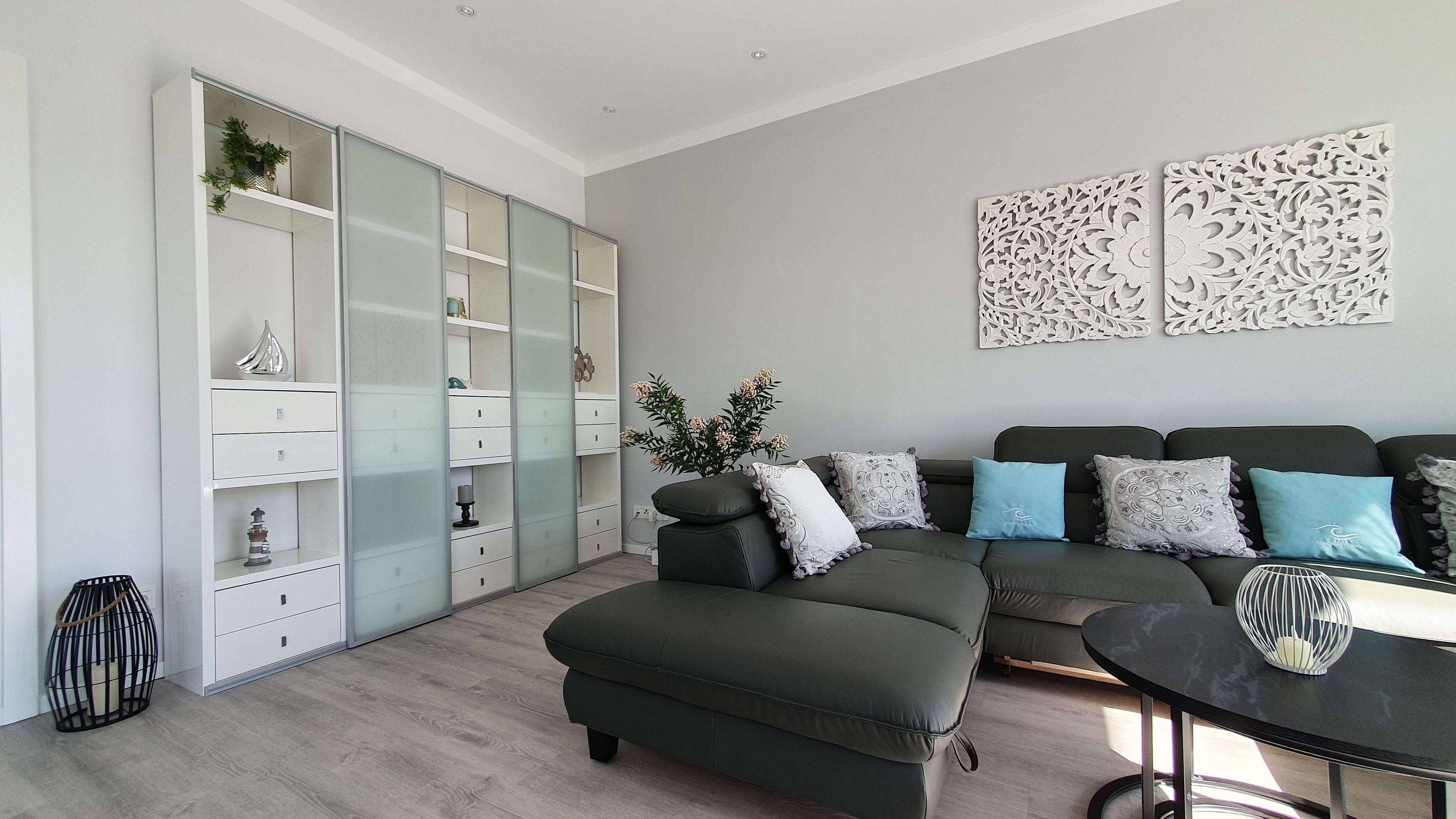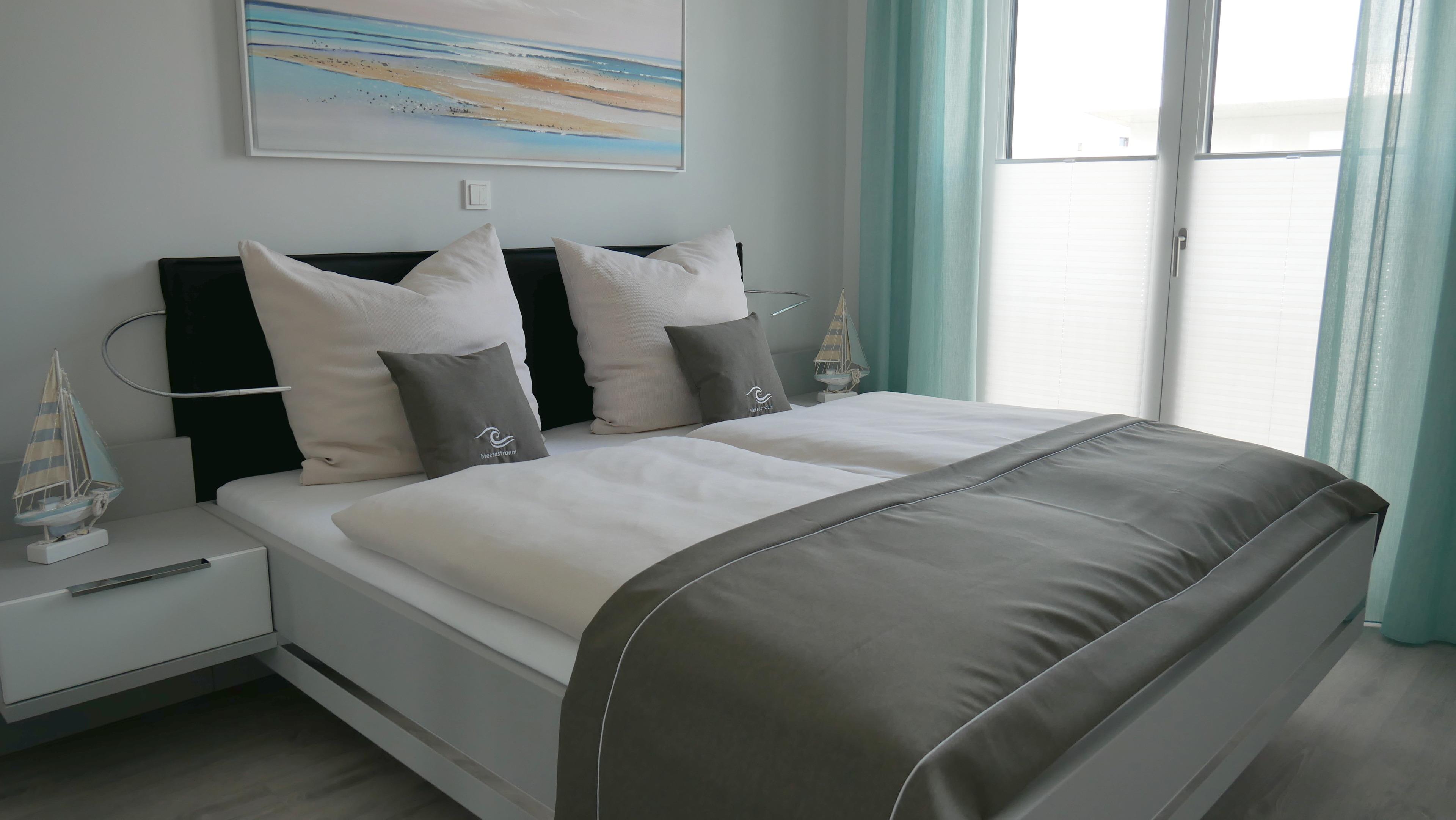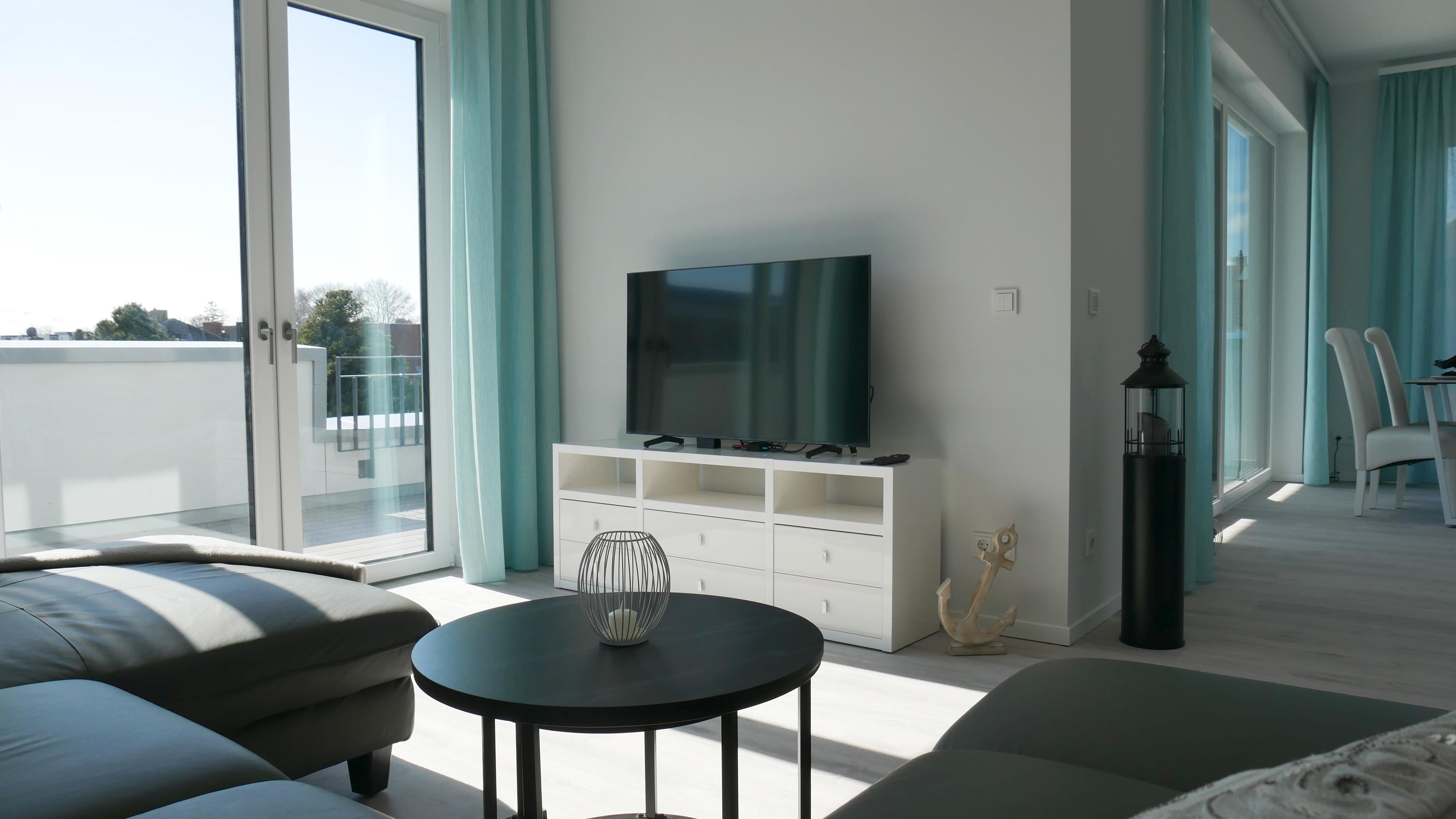 Die 3-Zimmer Ferienwohnung ist geschmackvoll eingerichtet und mit entsprechendem Ambiente geschmückt. Helle lichtdurchflutete Zimmer durch große Fenster-/Türfronten geben den Wohnräumen einen besonderen Wohlfühlfaktor. Die Wohnung verfügt über zwei Schlafzimmer, Wohn / Esszimmer mit eleganter offener Küche und direktem Zugang zur großen 28m² Dachterrasse. Die schöne Süd-/West Dachterrasse ist mit modernen Loungemöbeln, Sonnenliege und einem Sonnenschirm ausgestattet.