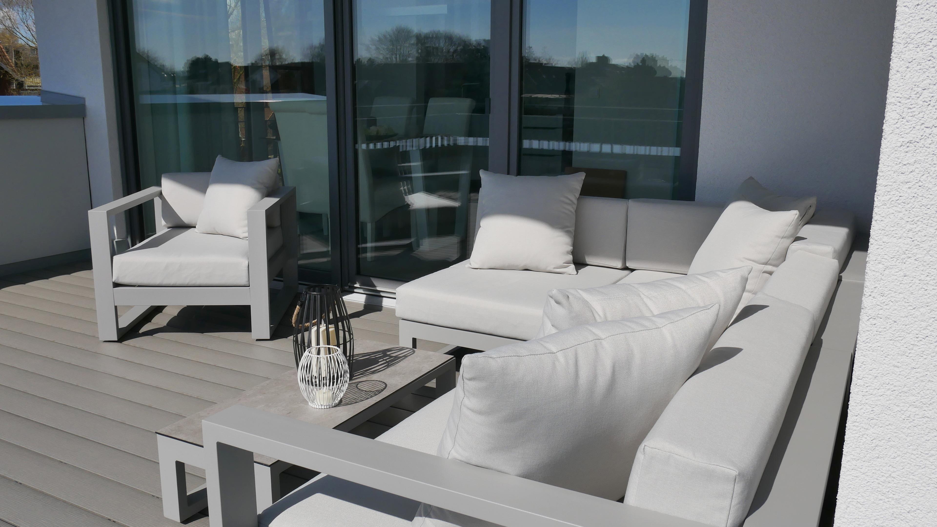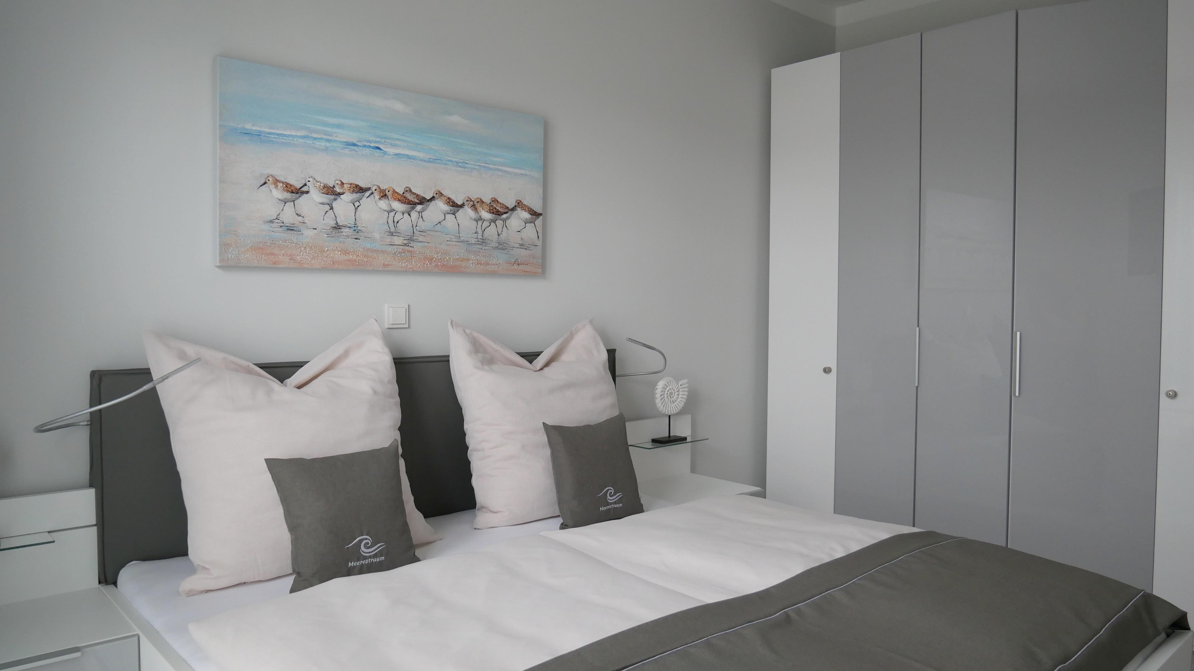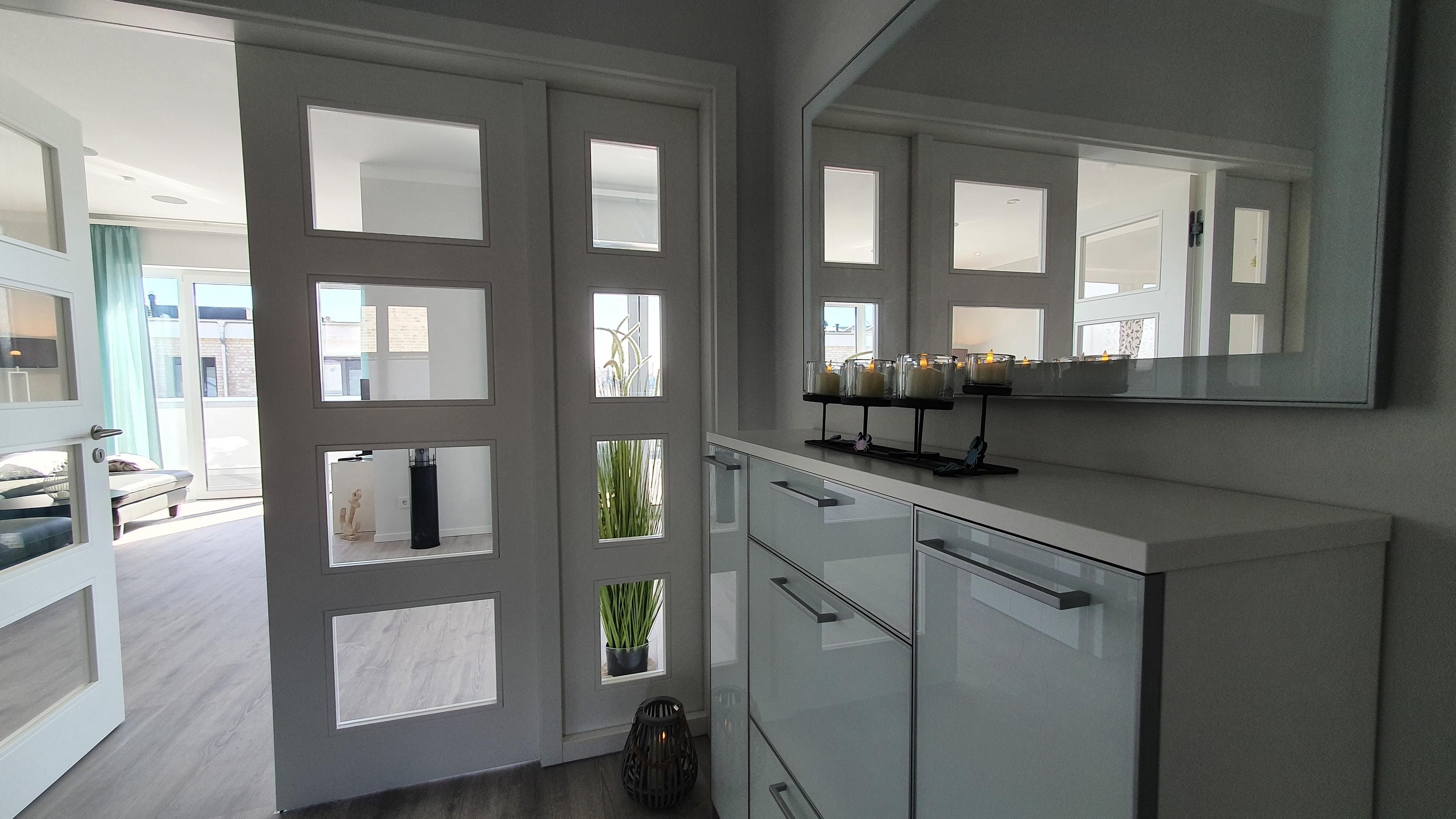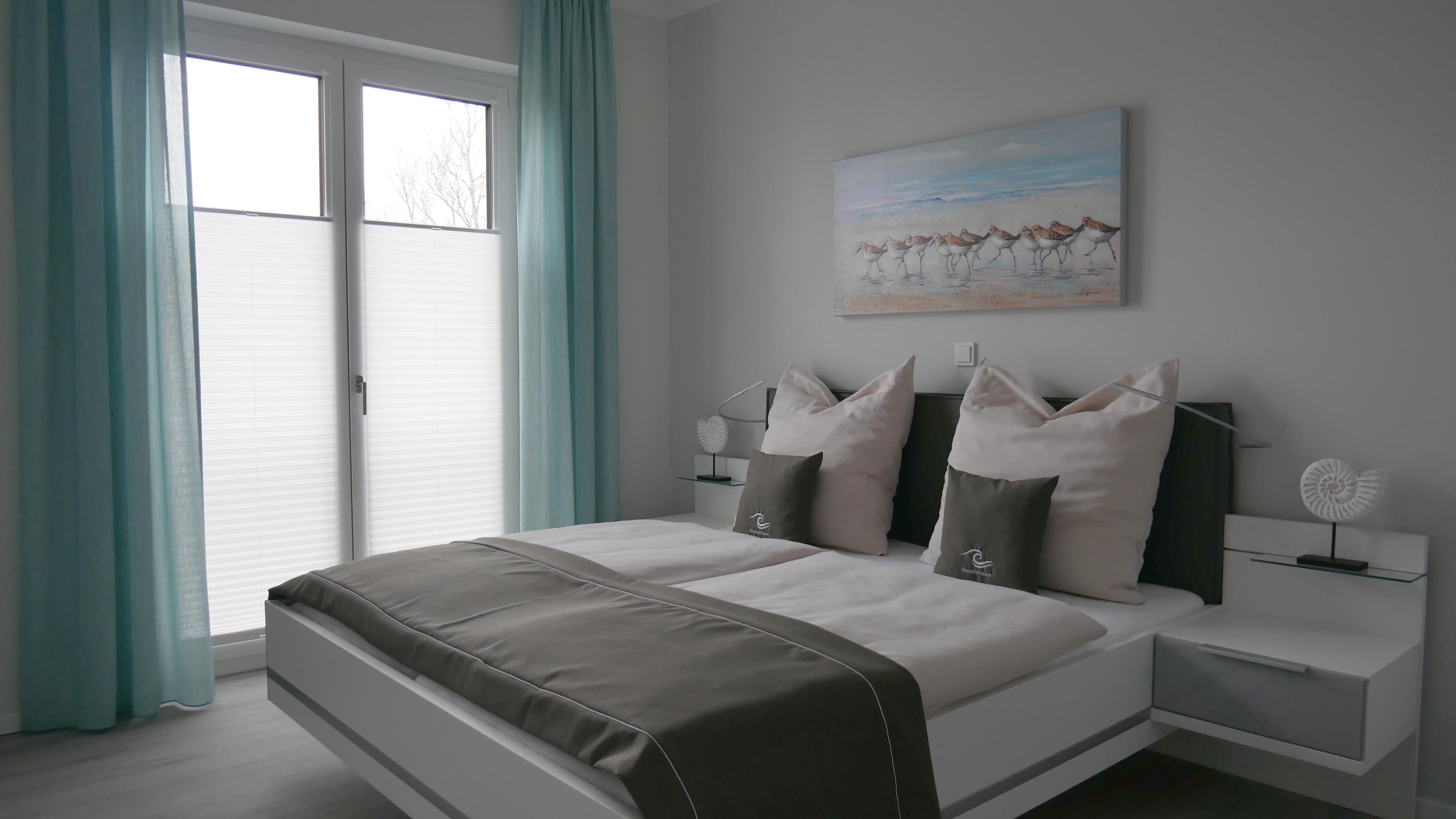 Die 3-Zimmer Ferienwohnung ist geschmackvoll eingerichtet und mit entsprechendem Ambiente geschmückt. Helle lichtdurchflutete Zimmer durch große Fenster-/Türfronten geben den Wohnräumen einen besonderen Wohlfühlfaktor. Die Wohnung verfügt über zwei Schlafzimmer, Wohn / Esszimmer mit eleganter offener Küche und direktem Zugang zur großen 28m² Dachterrasse. Die schöne Süd-/West Dachterrasse ist mit modernen Loungemöbeln, Sonnenliege und einem Sonnenschirm ausgestattet.