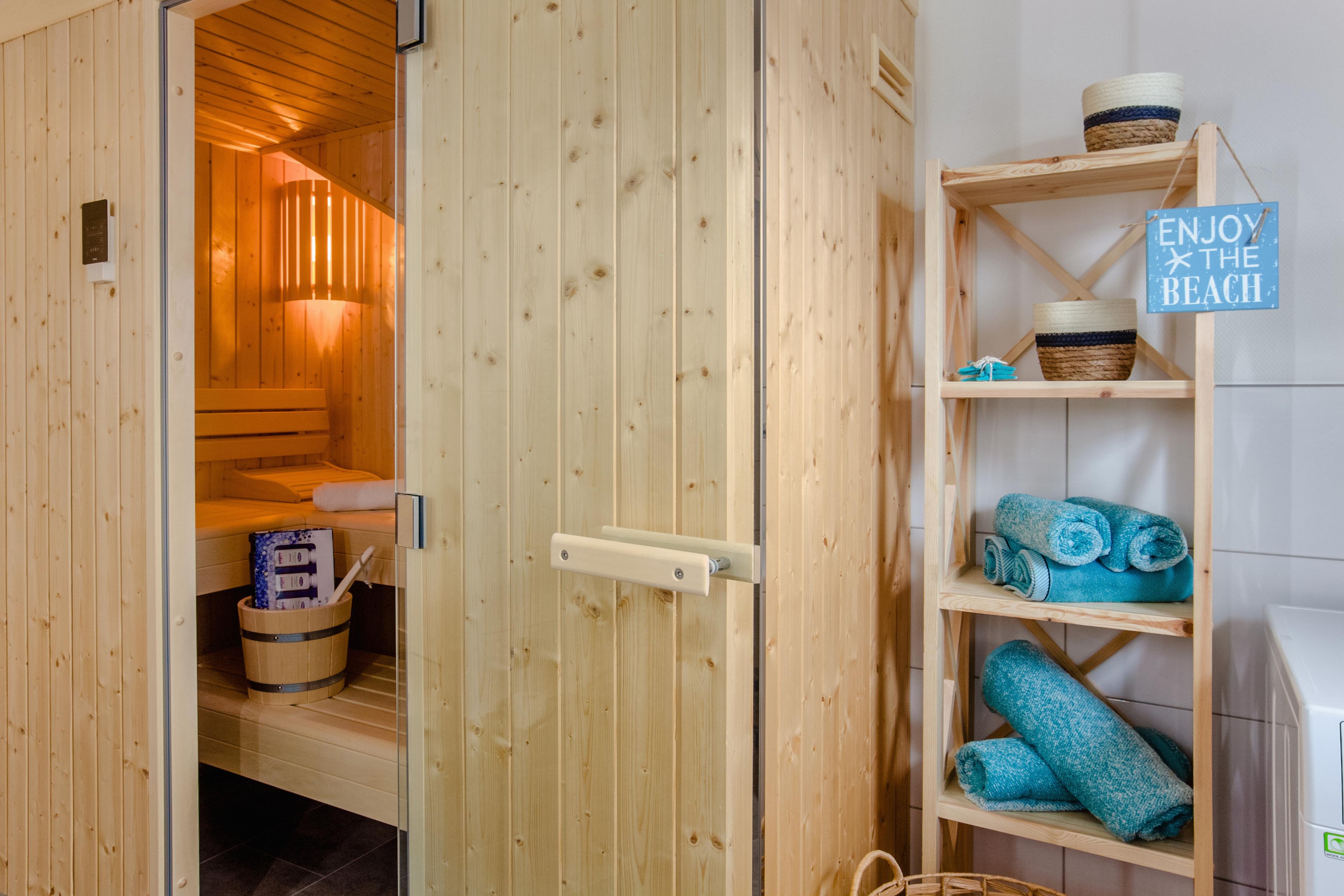 Das geräumige Badezimmer mit Waschmaschine und Sauna laden zur Regeneration ein.