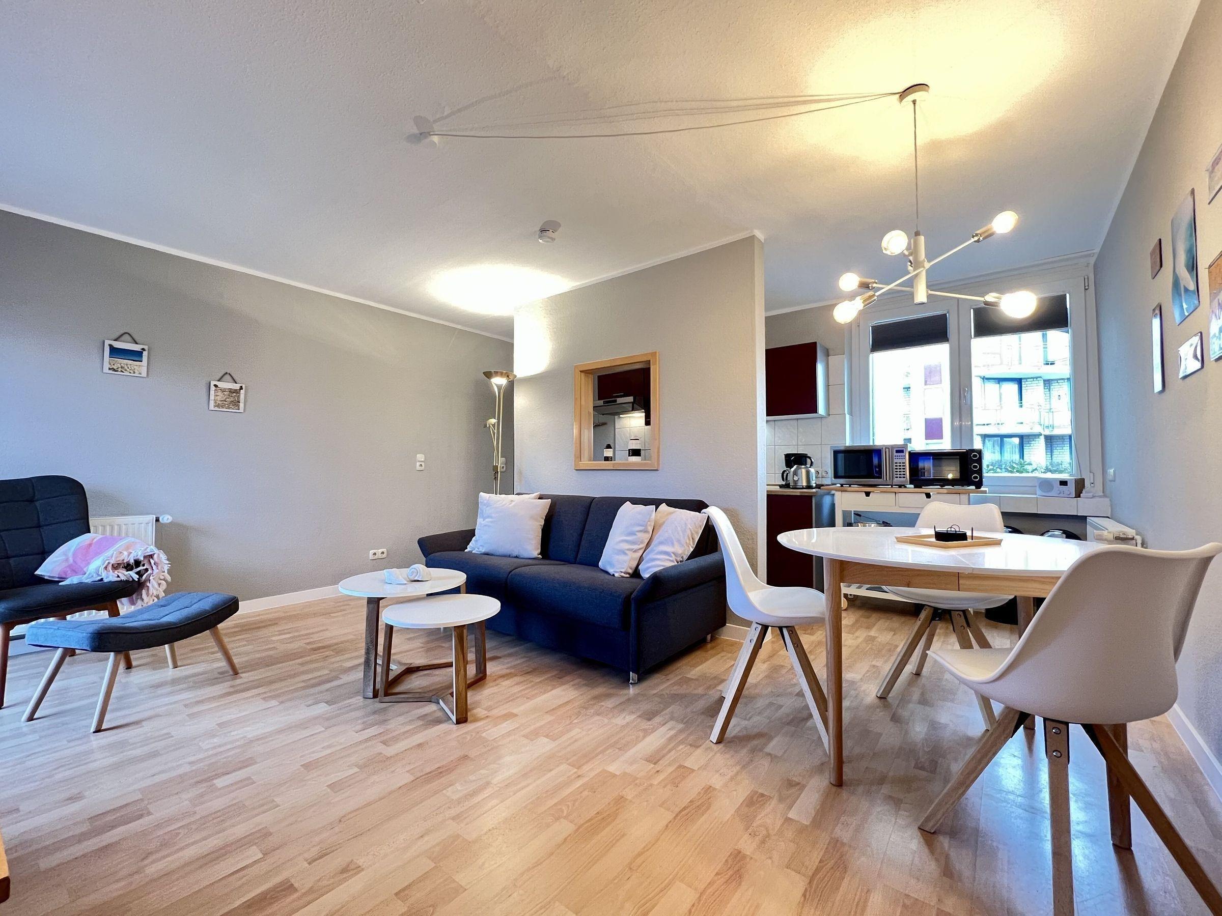 Die "Strandbude" bietet auf 47 m² Platz für bis zu 3 Erwachsene und einen Hund. Die modern und gemütlich eingerichtete 2-Zimmer-Wohnung im Erdgeschoss überzeugt durch ein lichtdurchflutetes Wohnzimmer mit Schlafsofa, Esstisch für drei Personen und einem direkten Zugang zum überdachten Nord-Balkon. Die Küche ist mit einem Geschirrspüler und einer Mikrowelle mit Backfunktion ausgestattet. Im großen Schlafzimmer befindet sich ein Doppelbett (160 x 200 cm) sowie ein Kleiderschrank und ausreichend Platz für ein Kinderreisebett. Das Badezimmer ist mit Dusche und WC ausgestattet. Zur Wohnung gehört ein Parkplatz, der nach Schlüsselübergabe genutzt werden kann. Müllbehälter sind am Haus vorhanden, während Glas an den öffentlichen Sammelstellen zu entsorgen ist.
