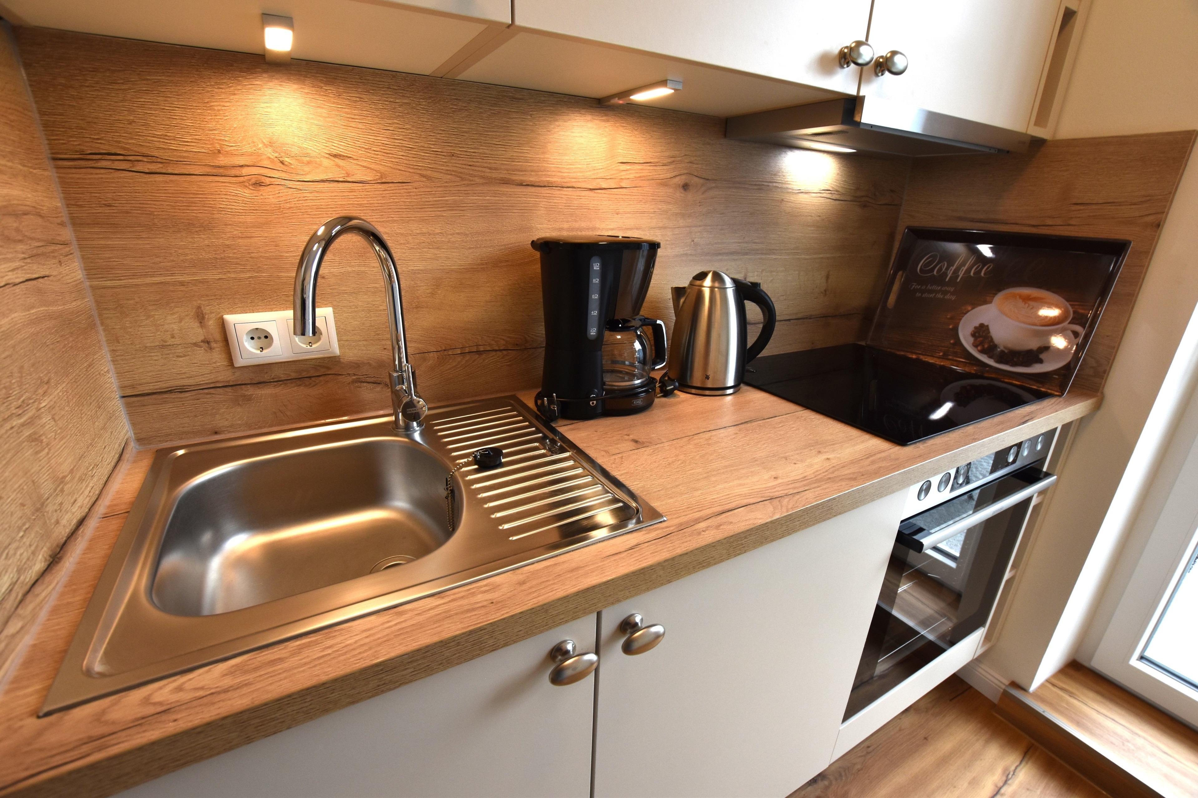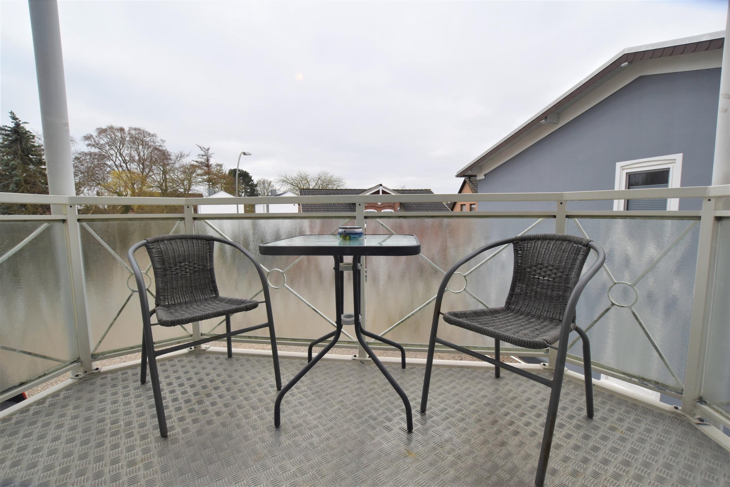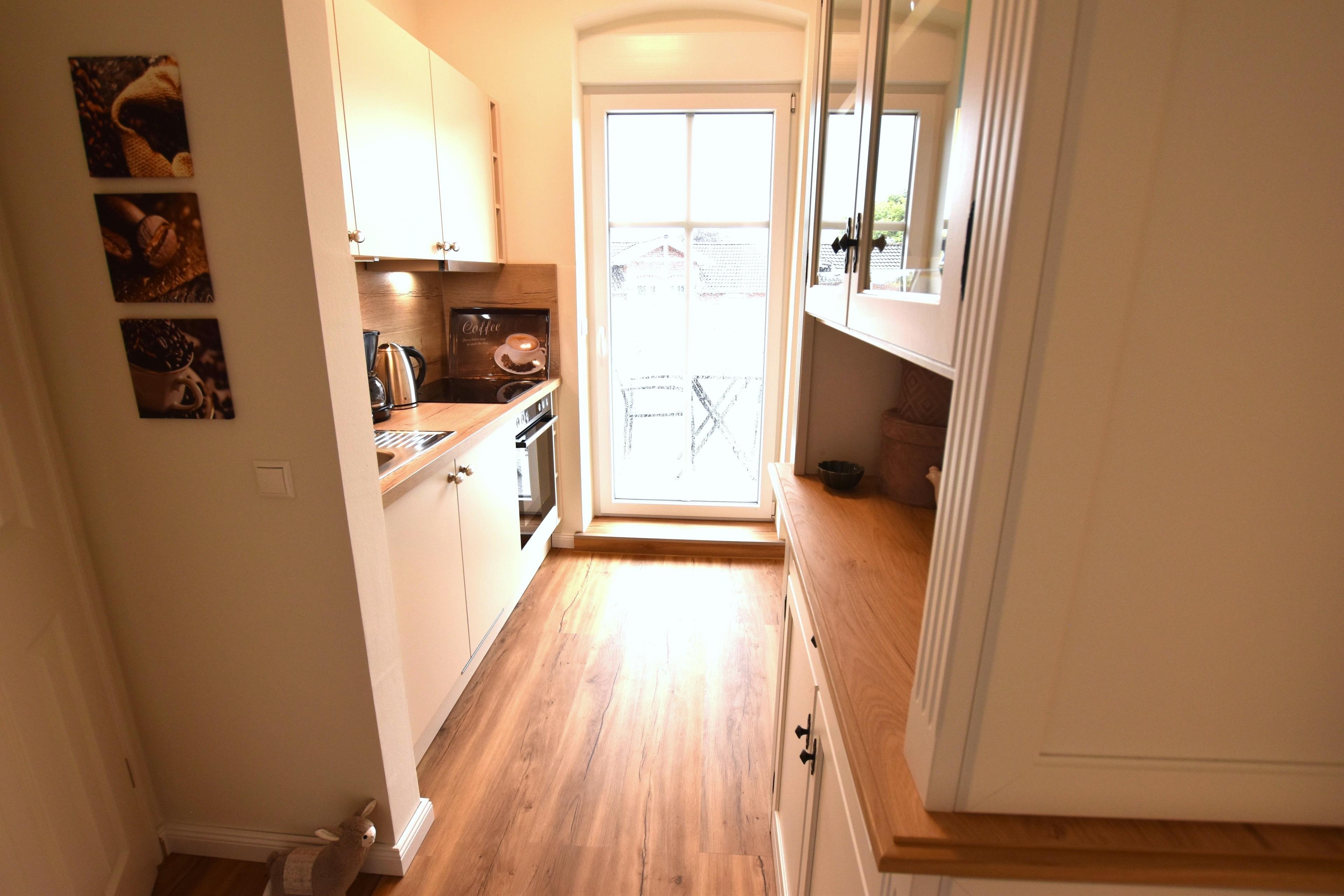 Die 2-Zimmer-Ferienwohnung hat einen Flur mit offener Küche, die mit einem Herd (Ceranfeld) mit Backofen und Kühlschrank ausgestattet ist und bietet Zugang zum bestuhlten Balkon in Süd-West-Ausrichtung.