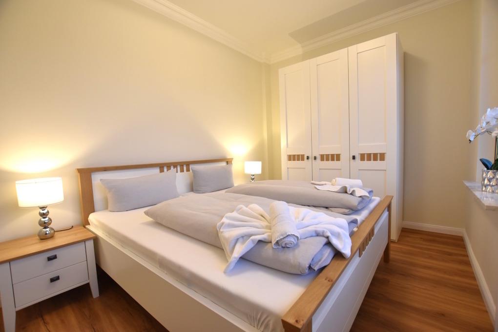 Das Schlafzimmer hat ein Doppelbett (2x90x200 cm) und einen großen Kleiderschrank.