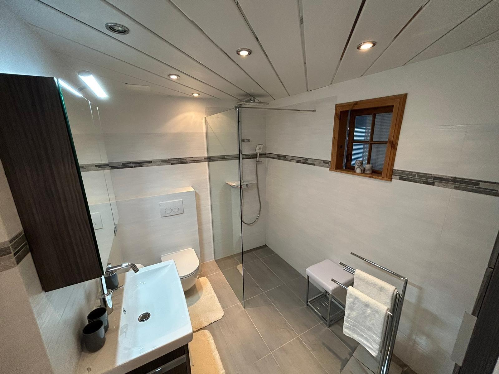 Dusch/WC mit einer Dusche, WC und einem Waschbecken mit Spiegel.