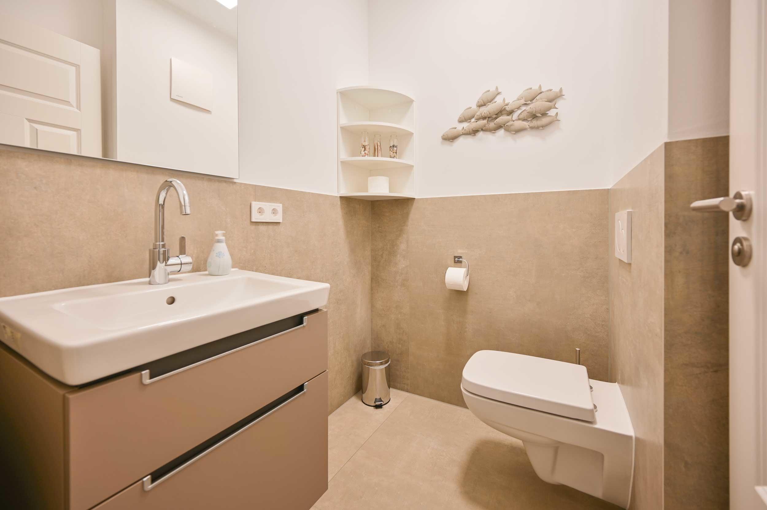 Auf der 18m2 großen überdachten Terrasse in Süd-Ost-Lage können Sie bereits das Frühstück in der Morgensonne genießen. Für die Kleinen gibt es einen Hochstuhl und ein Kinderreisebett. Im Tageslicht-Bad befindet sich eine INFRAROTWÄRMEKABINE für zwei Personen, die an kälteren Tagen zum Relaxen einlädt. Um morgens pünktlich zum 150m entfernten Strand aufbrechen zu können, hilft das elegante Gäste-WC, Staus zu vermeiden.