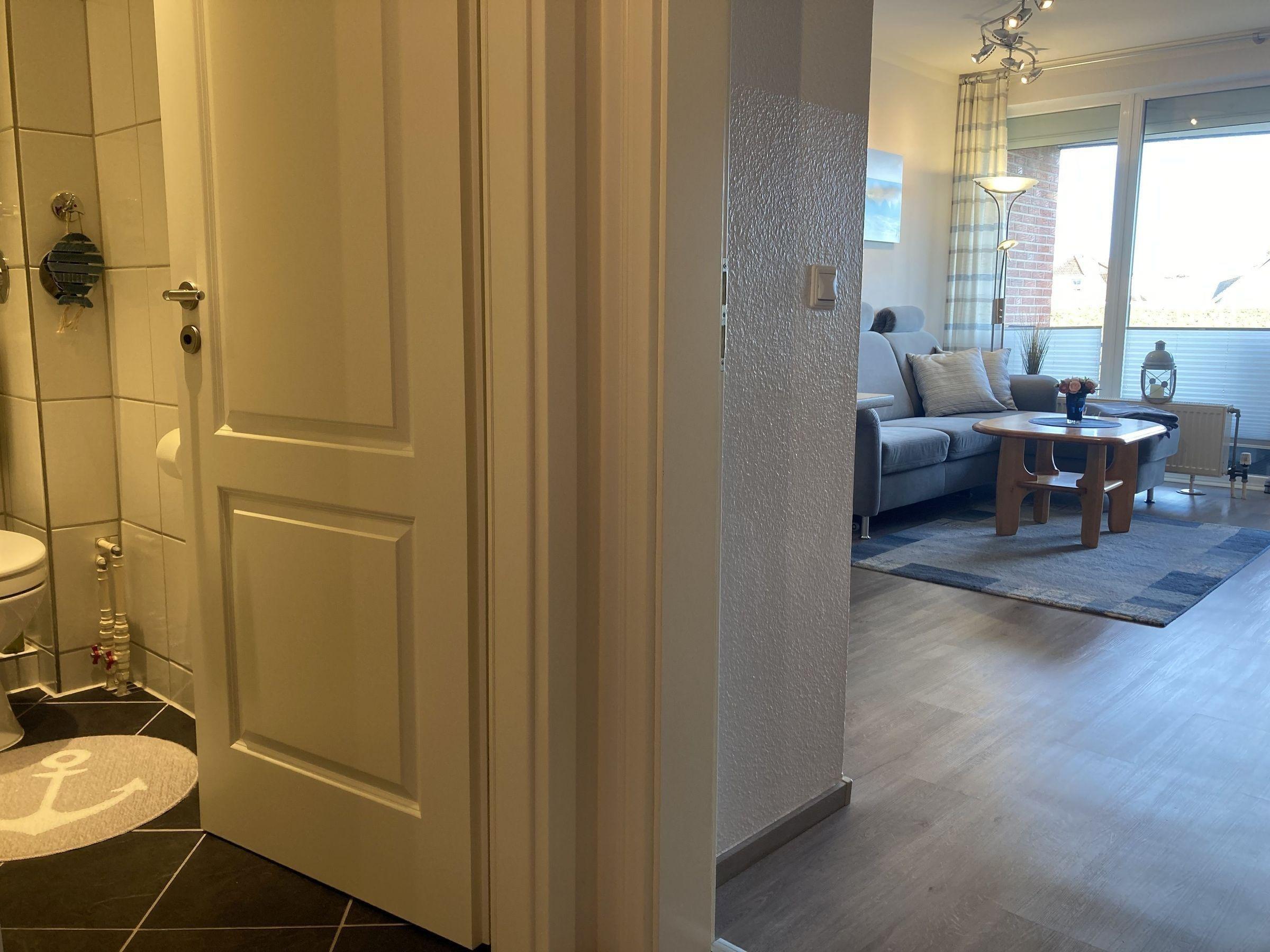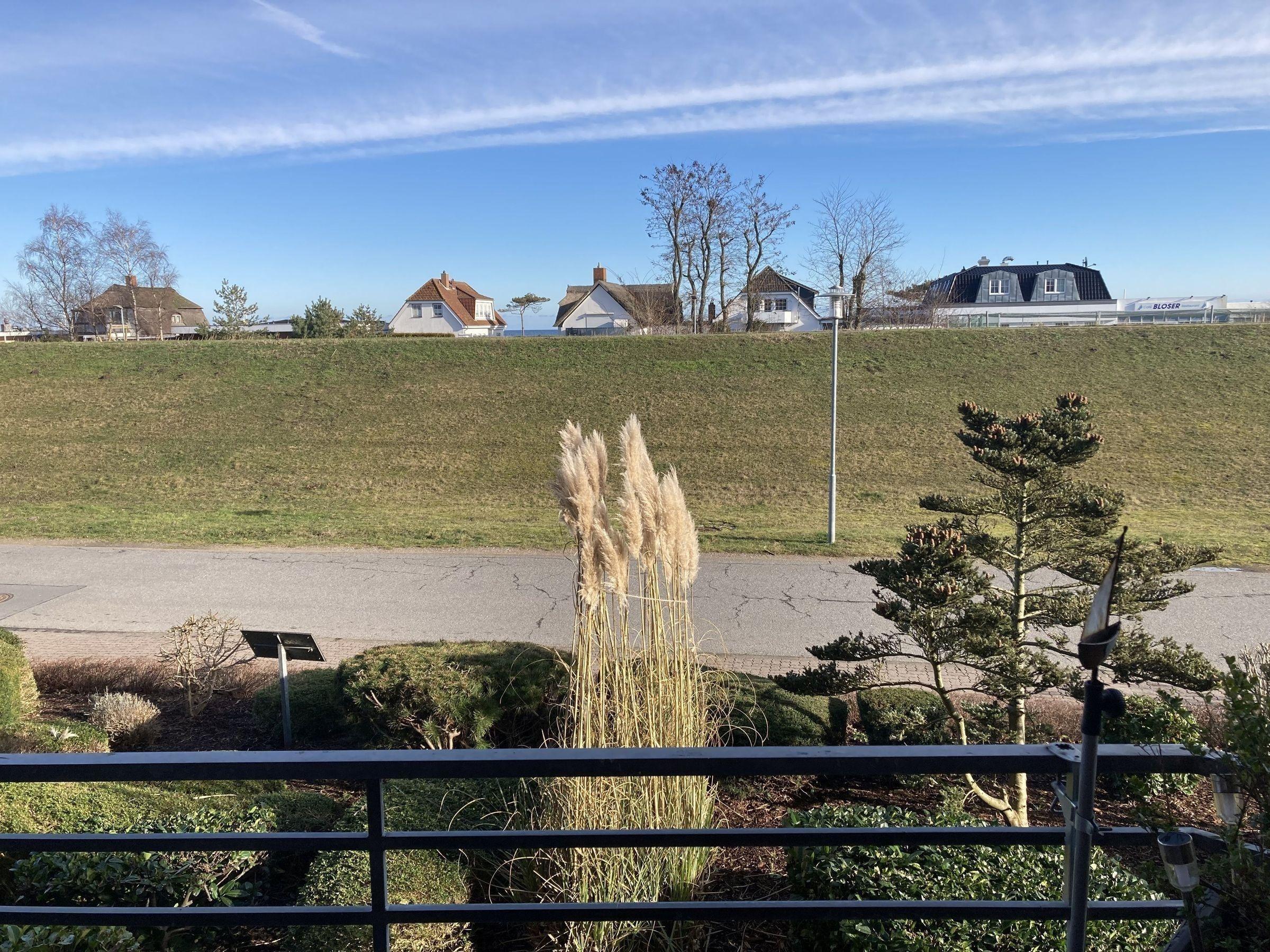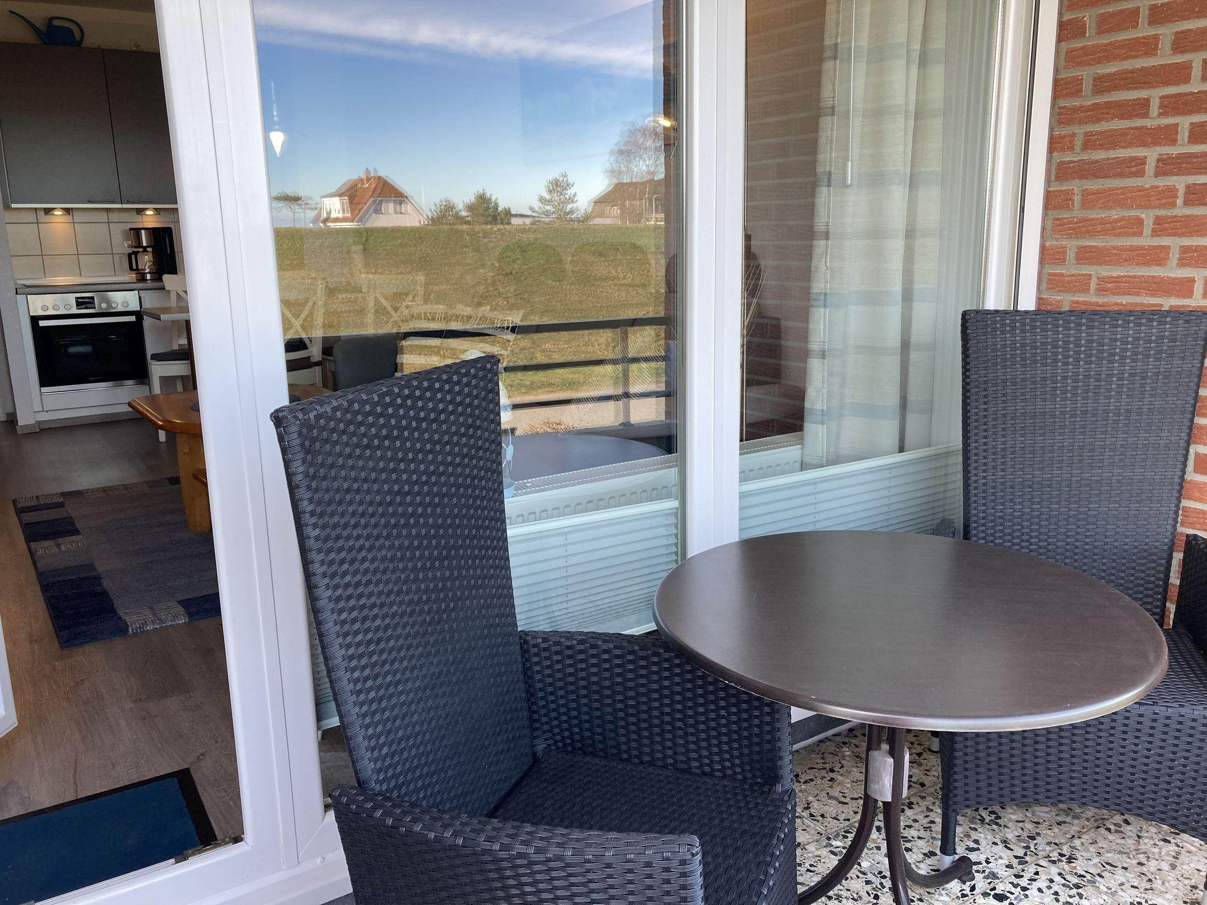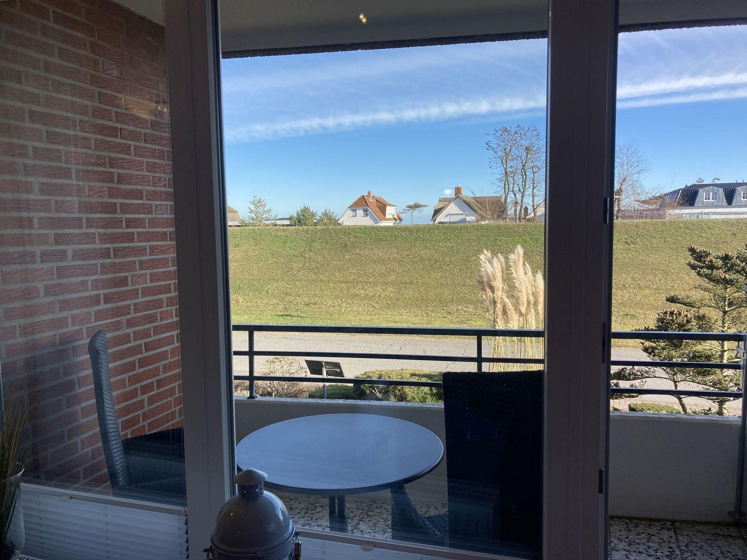 Wohnbereich mit direktem Zugang zum Balkon in Süd-, Westlage mit Blick auf den Deich.