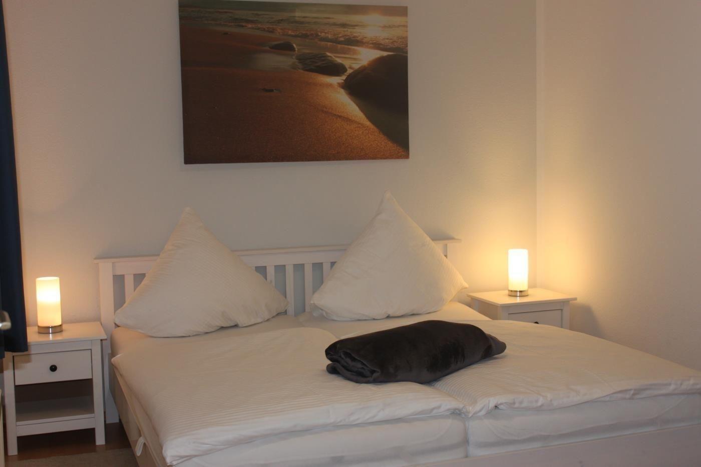 Die Schlafzimmer sind gut eingerichtet: eines mit einem Doppelbett (2x90x200cm) und Kleiderschrank, das andere mit zwei Einzelbetten (90x200cm) und ebenfalls einem Kleiderschrank. Im Badezimmer, das über ein Fenster verfügt, befinden sich eine Dusche und ein WC, sowie eine Waschmaschine. Jede Wohnung verfügt über einen eigenen PKW-Stellplatz. Gemeinschaftliche Einrichtungen sind nicht angegeben. Die Anlage liegt in der Nähe von Wanderwegen zum Naturschutzgebiet.