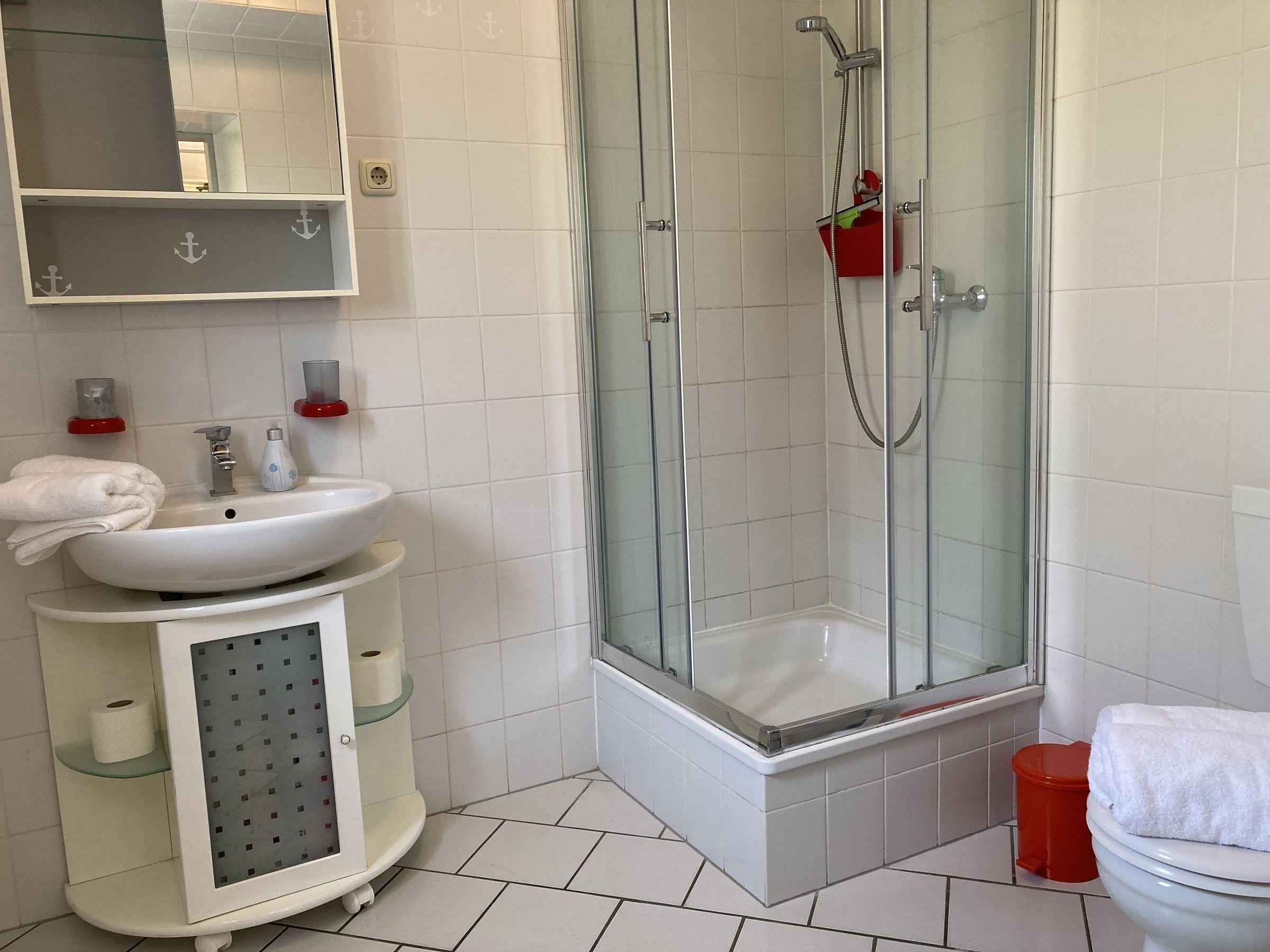 - Badezimmer mit Fenster, Dusche und WC, Föhn vorhanden