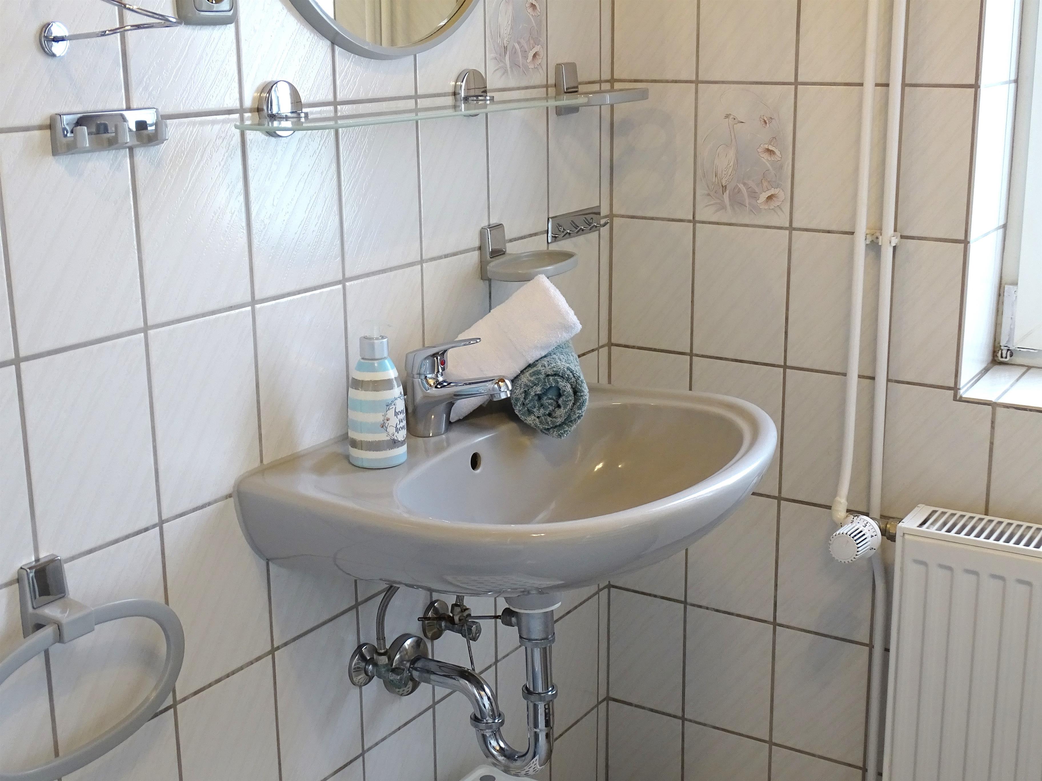 Duschbad mit tiefem Badebecken, WC und Bidet. Alle Räume sind zentral beheizt.