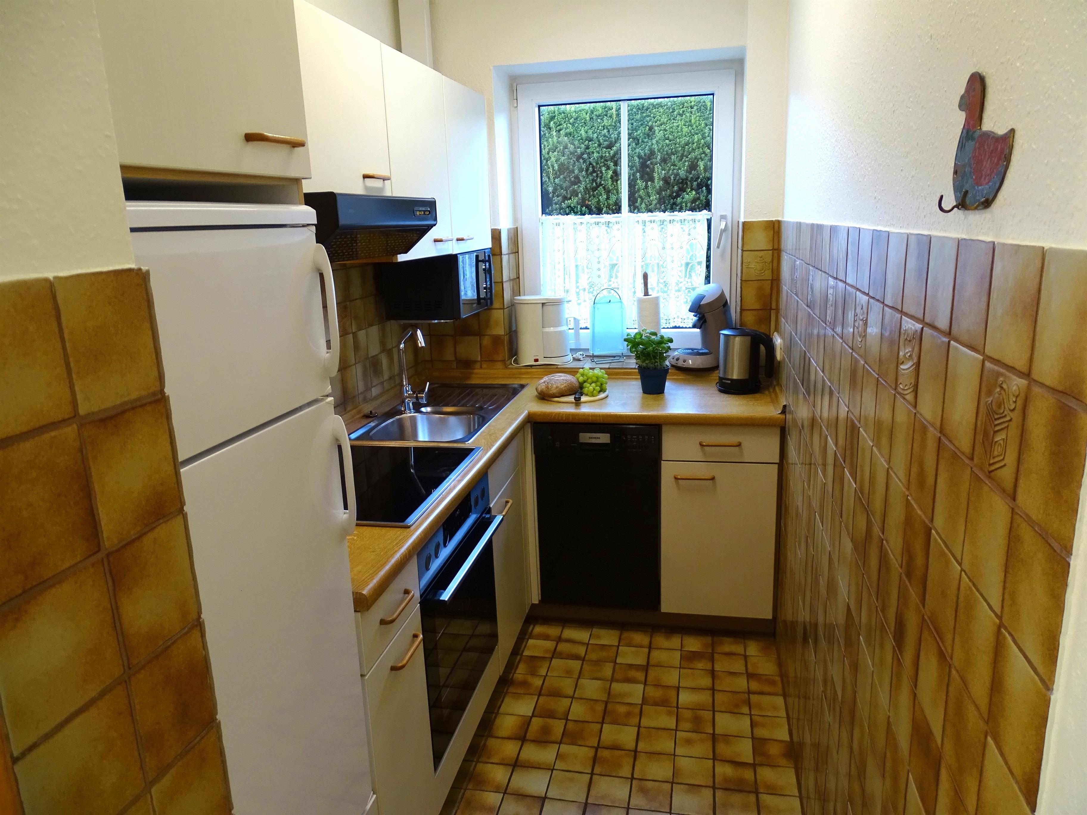 - voll eingerichtete Einbauküche mit Kühlschrank, Geschirr, 4-Plattenherd mit Backofen, Spülmaschine, Toaster, Kaffemaschine usw.