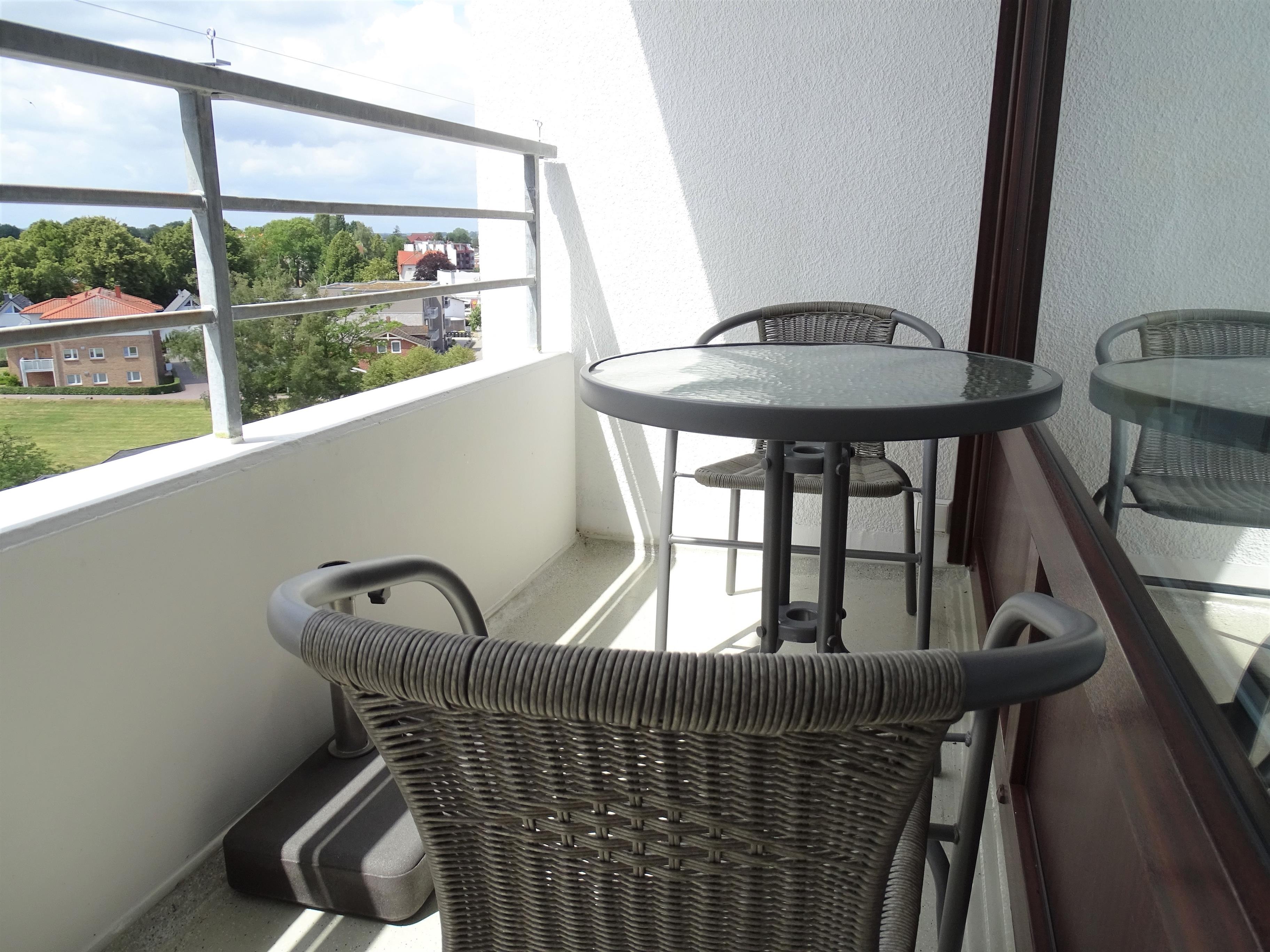 Zwischen Küche und Wohnzimmer gibt es einen Essplatz für 2 Personen. Das gemütliche Sofa mit Leselampe lädt zum Verweilen ein. Eine Vitrine mit TV (43 Zoll) und Stereo-Anlage dient als Raumteiler. Der TV ist drehbar so dass Sie bequem vom Sofa oder auch vom Bett fernsehen könnten. Das Doppelbett hat eine Größe von 1,60 x 2,00, die Matratzen-Seiten haben unterschiedliche Härtegrade. Die Einbauschränke bieten reichlich Platz für Staubsauger, Besen & Co, sowie für Ihre Kleidung. Der Balkon ist mit Tisch und Stühlen, Sonnenschirm und Schirmständer ausgestattet. Hier können Sie den Tag in der Abendsonne ausklingen lassen.