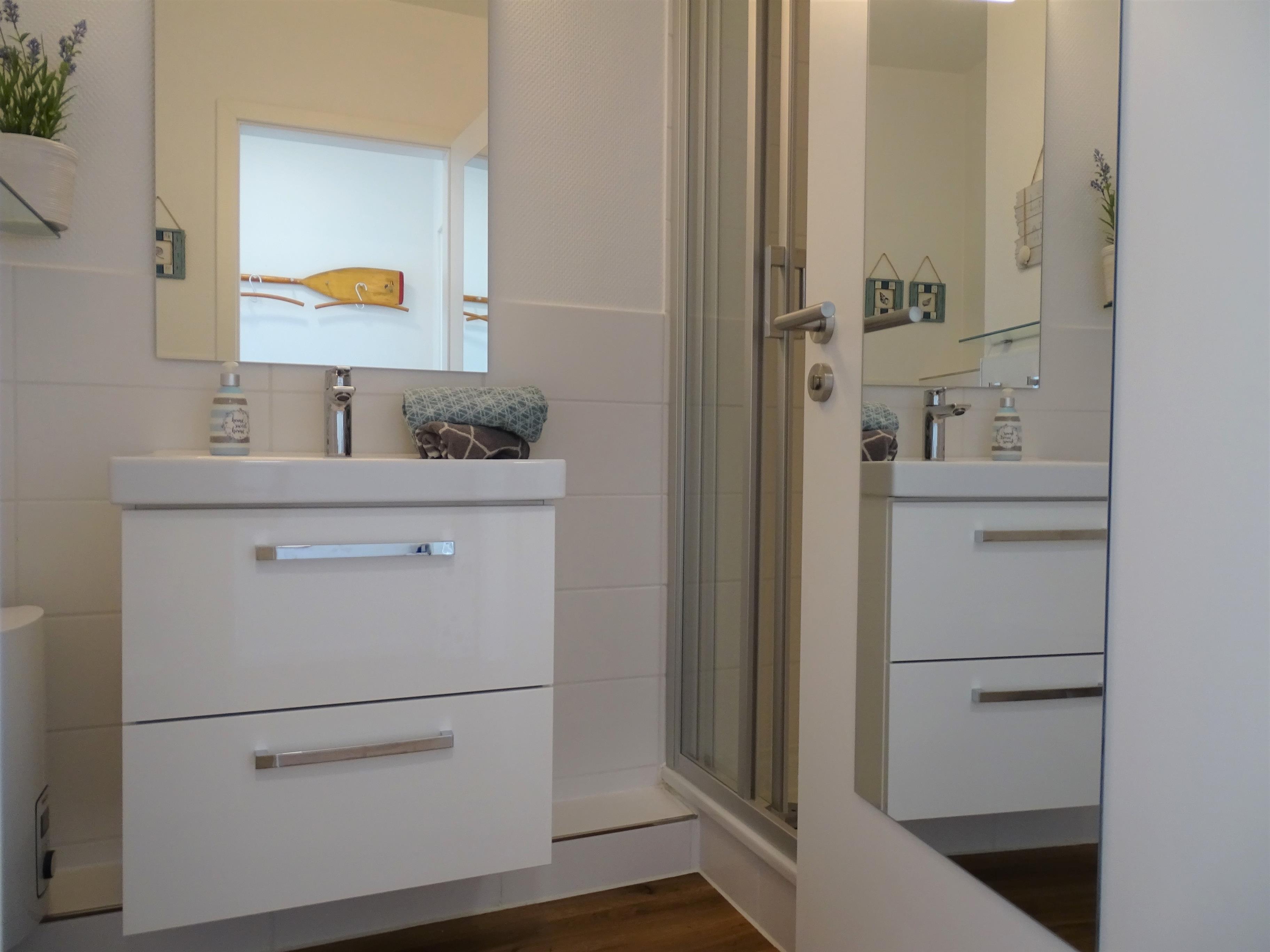 Im Duschbad gibt es eine Handtuchtrockner-Heizung, Schrank, Regale und einen Föhn.