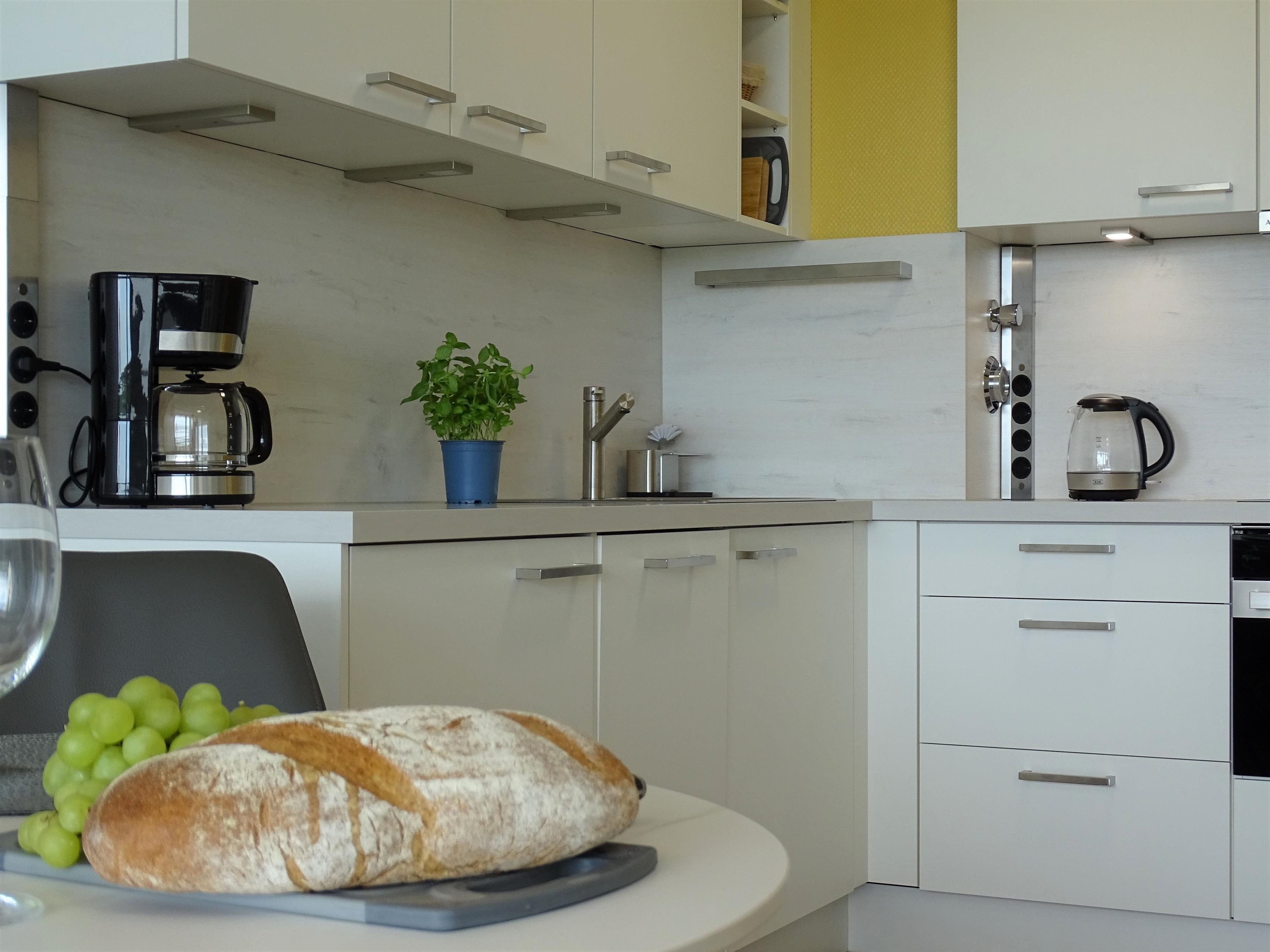 Die Einbauküche beinhaltet einen Backofen mit integrierter Mikrowelle, Kühlschrank mit integriertem Gefrierfach, Geschirrspüler, Kaffeemaschine, Eierkocher, Toaster, Wasserkocher und sehr viel Geschirr. Wir hoffen, wir haben an alles gedacht, sind für Anregungen und Bewertungen in unserem Gästebuch immer dankbar.