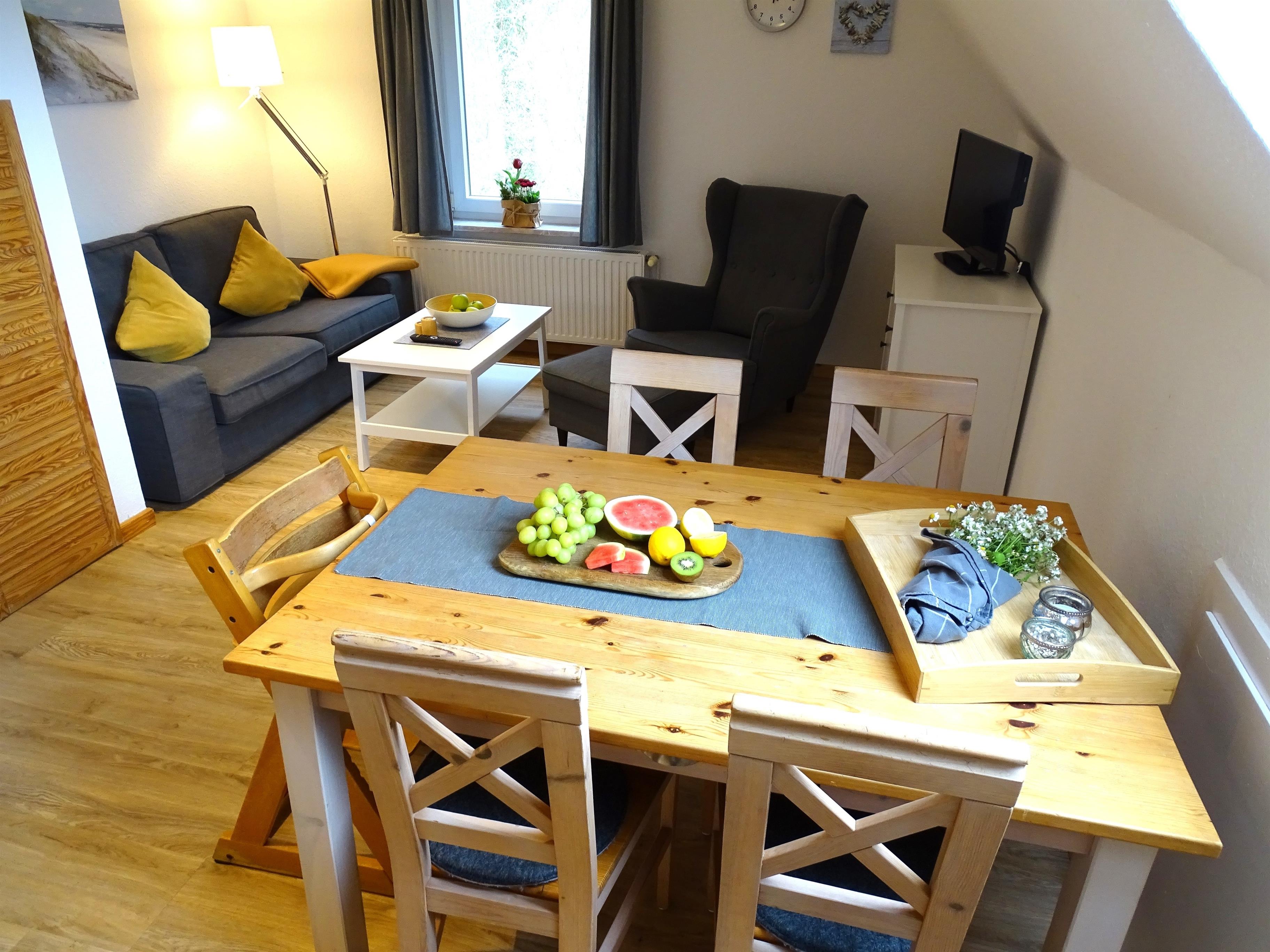 Im offenen Wohnzimmer befindet sich eine Küchenzeile mit Backofen, Herd und Kühlschrank. Es ist ein Essplatz und eine gemütliche Sitzecke mit Fernseher vorhanden.