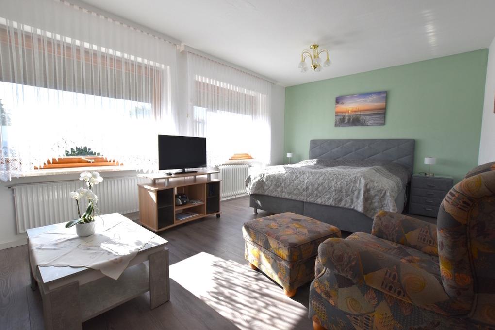 Die Ferienwohnung 4 ist nach vorne gelegen und besteht aus Wohn-/Schlafzimmer mit einem Boxspringbett, Sitzecke und TV.