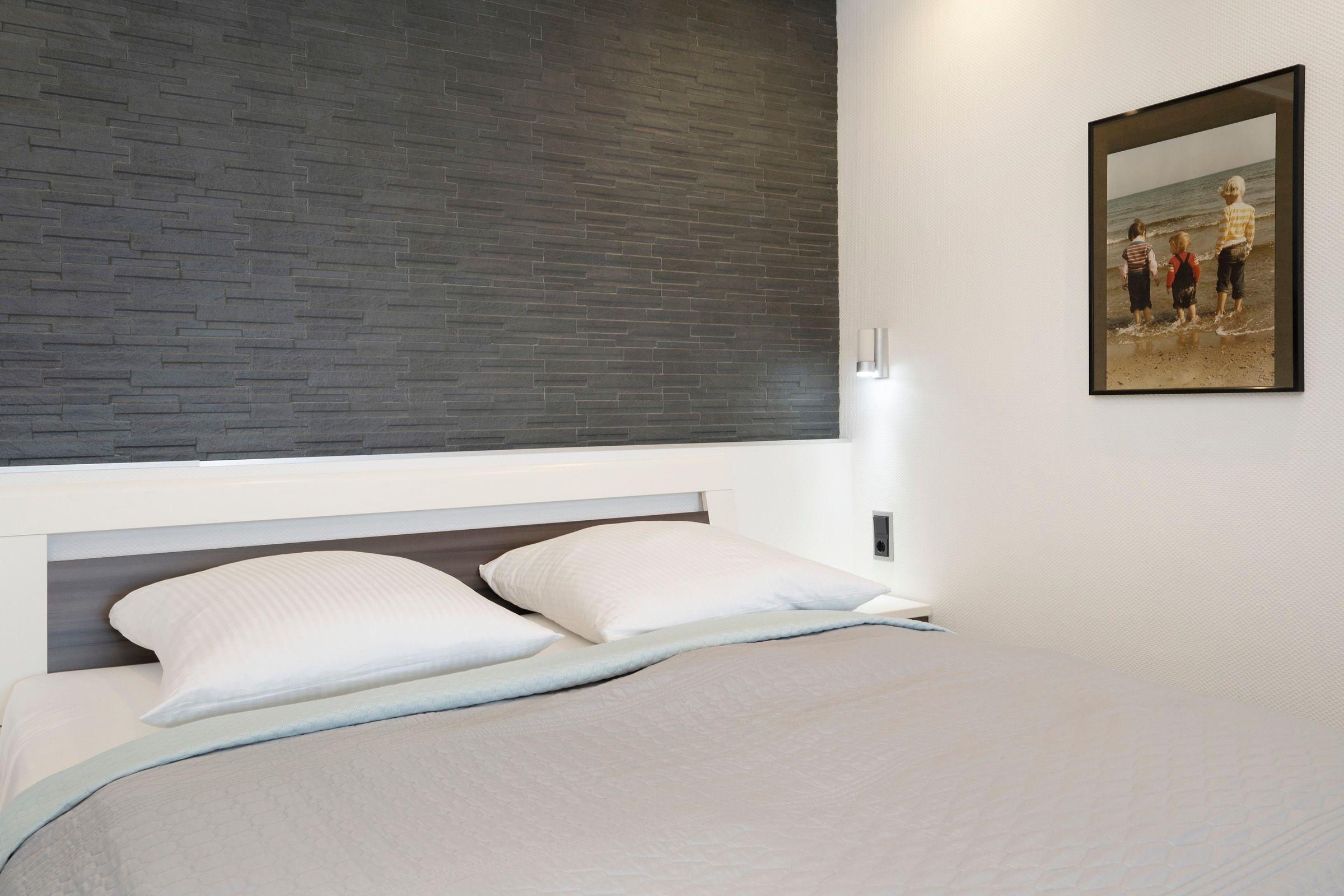 Die Wohnung verfügt über einen kombinierten Wohn- und Schlafbereich mit Doppelbett (2x 90x200 cm), einen Kleiderschrank, ein Ecksofa und einen Fernseher sowie über ein separates Schlafzimmer mit zwei gemütlichen, ausklappbaren Schlafsesseln (140x200 cm) und einem weiteren Kleiderschrank. Die gut ausgestattete Küche mit Esstisch, eine kleiner Flur mit Garderobe sowie das moderne Badezimmer mit Dusche runden diese Wohnung geschmackvoll ab. Ein Highlight sind das einzigartige Design-Lichtkonzept sowie der große Flachbildfernseher im Wohnbereich. Vom überdachten, möblierten Balkon aus können Sie den Tag entspannt ausklingen lassen. Natürlich verfügt die Wohnung über einen kostenlosen WLAN-Anschluss.